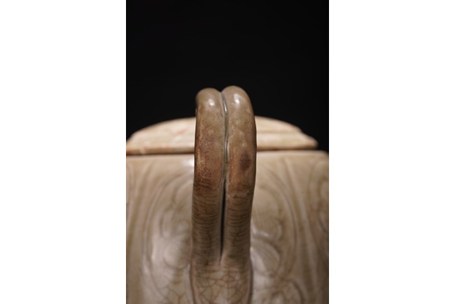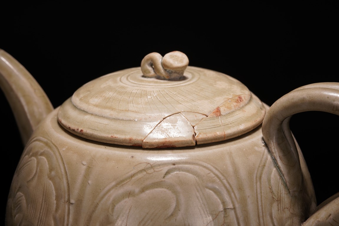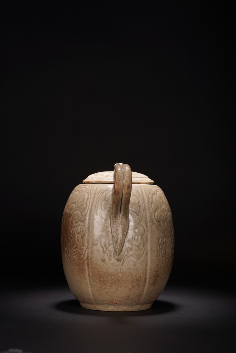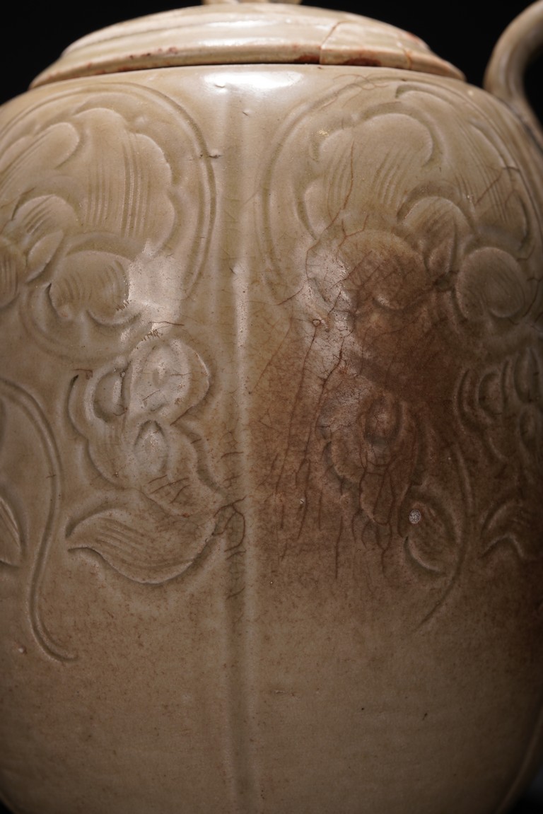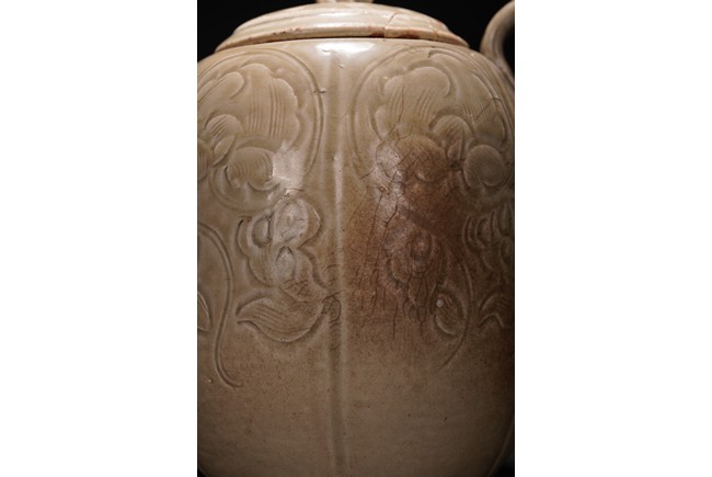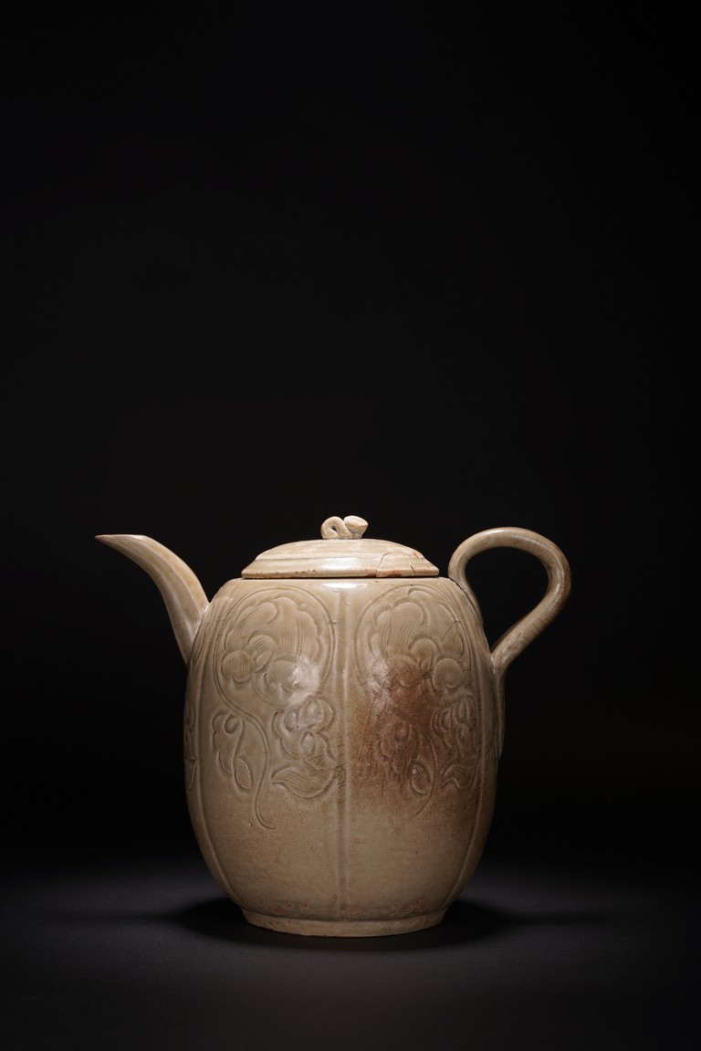 此執壺身為瓜棱形,肩部置一細流,相對出彎曲把手。腹部每開光剔刻花卉紋飾。圖案簡練概括,線條挺拔,刀法犀利。器身通體施滿青釉,釉色青中閃黃,造型端莊,形制秀美,惜蓋有殘粘,局部有衝煙,值得收藏。
