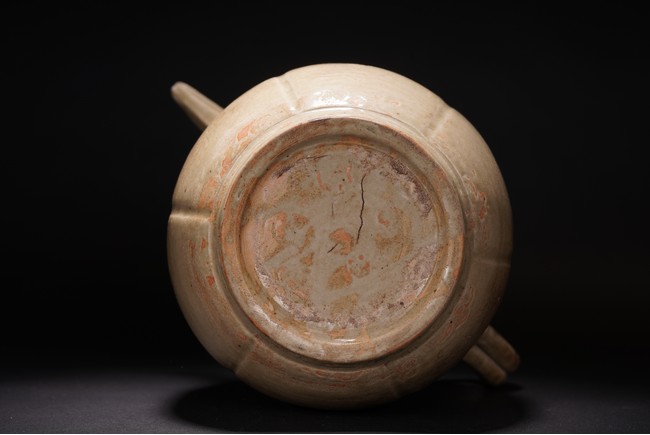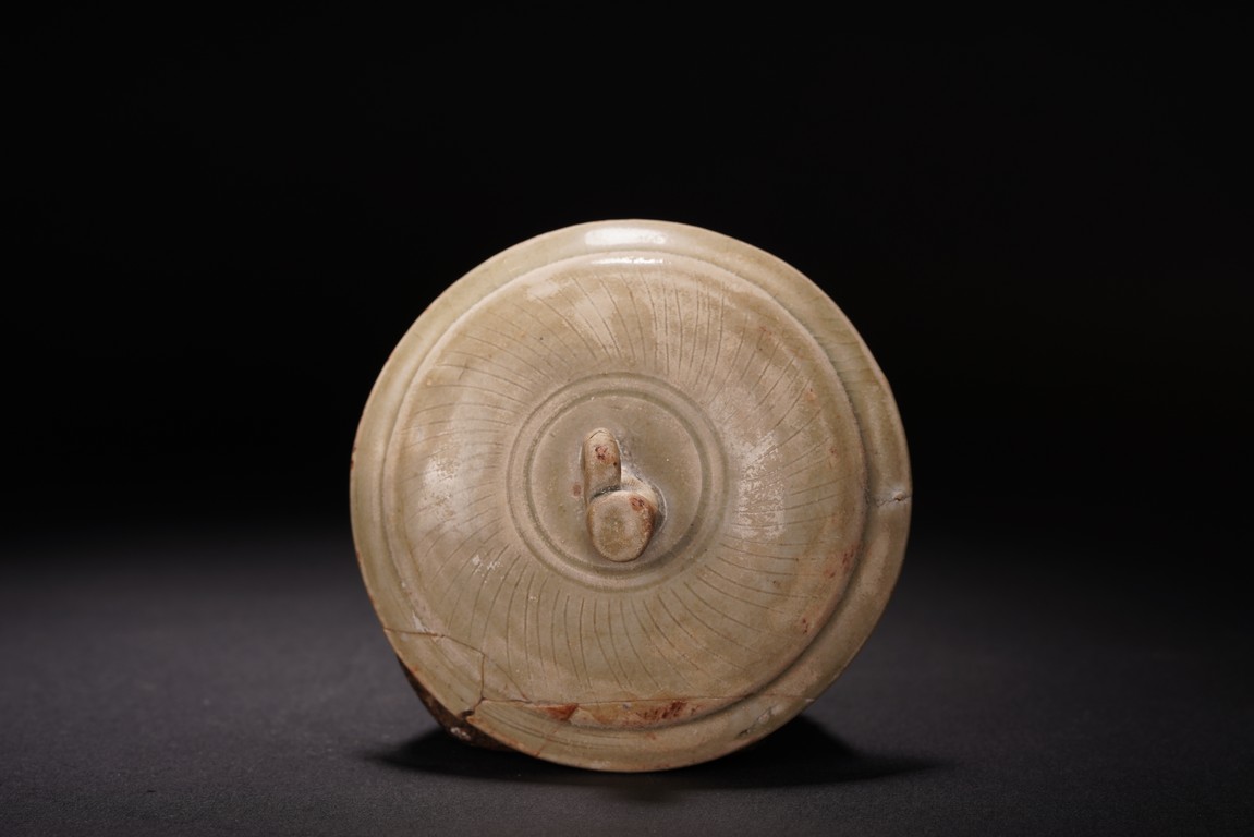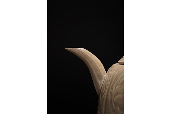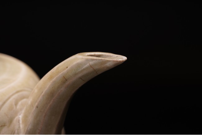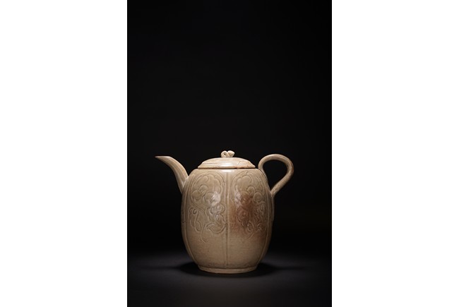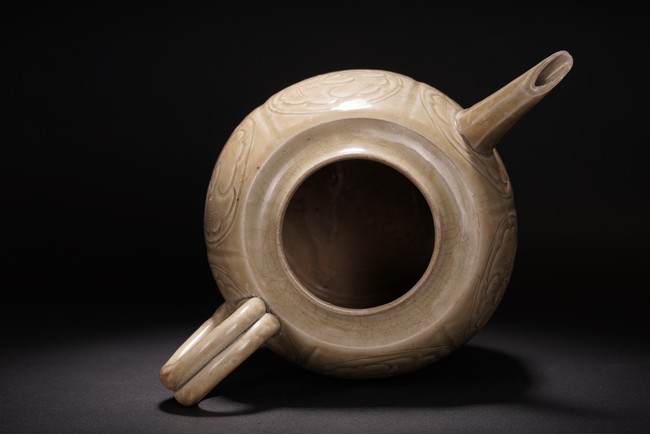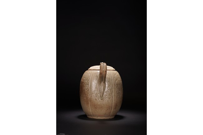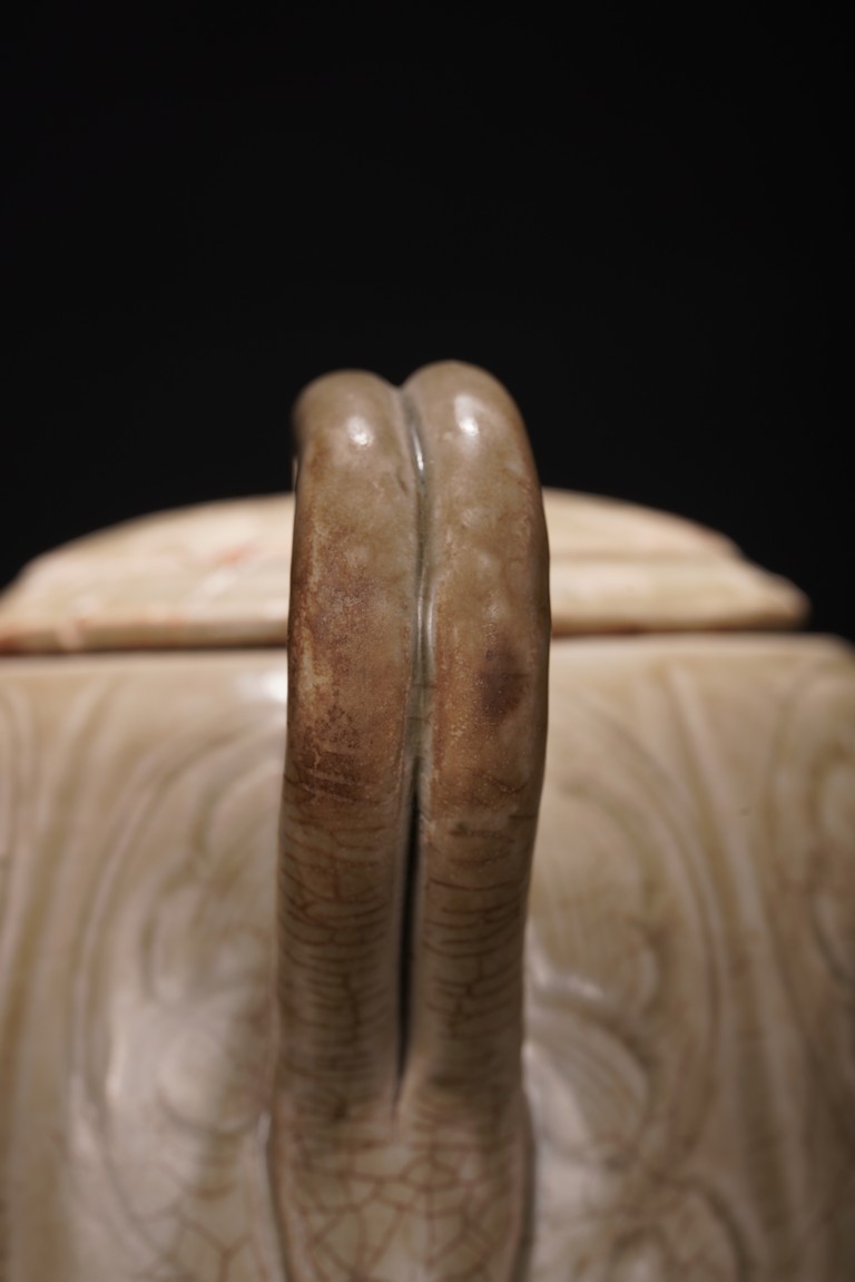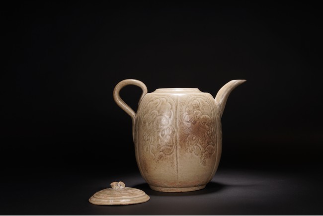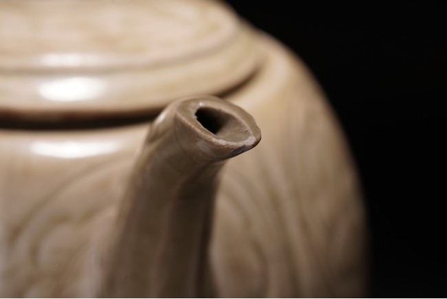 此執壺身為瓜棱形,肩部置一細流,相對出彎曲把手。腹部每開光剔刻花卉紋飾。圖案簡練概括,線條挺拔,刀法犀利。器身通體施滿青釉,釉色青中閃黃,造型端莊,形制秀美,惜蓋有殘粘,局部有衝煙,值得收藏。