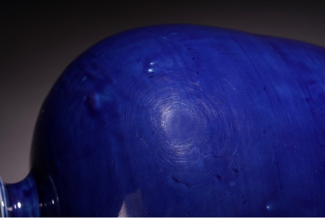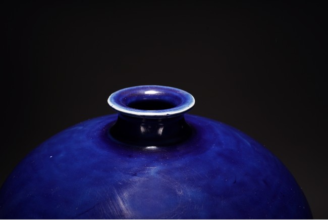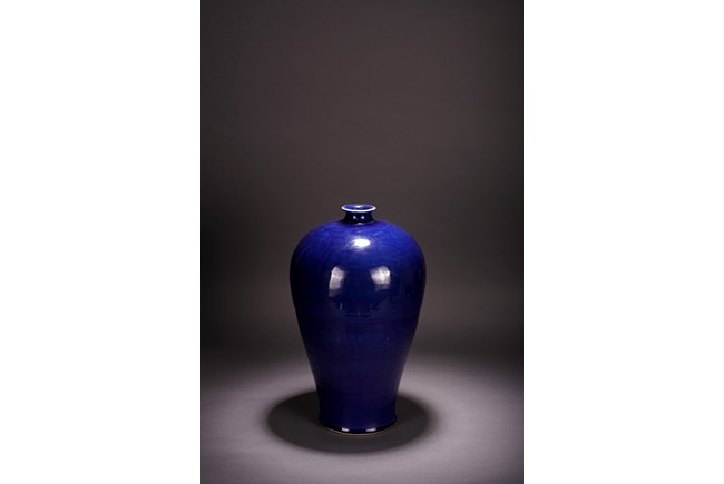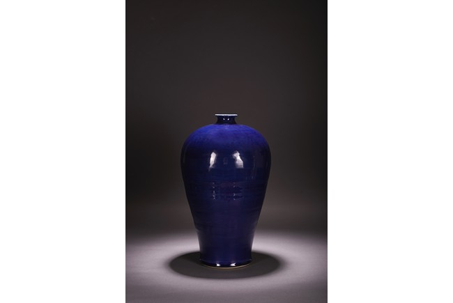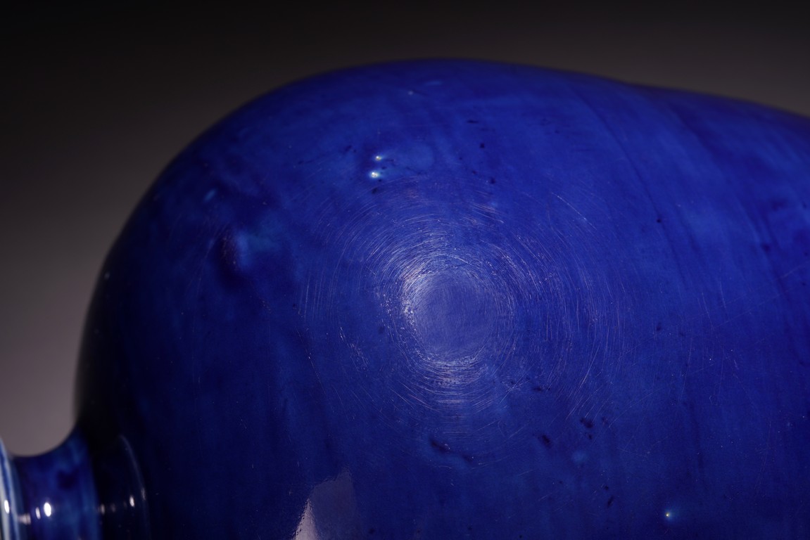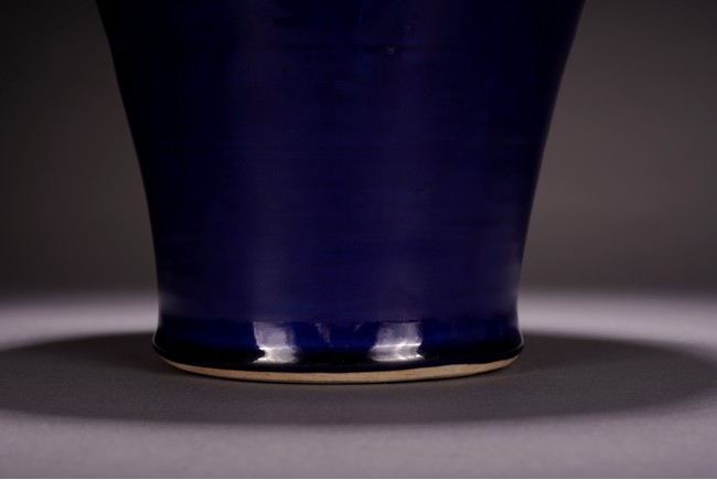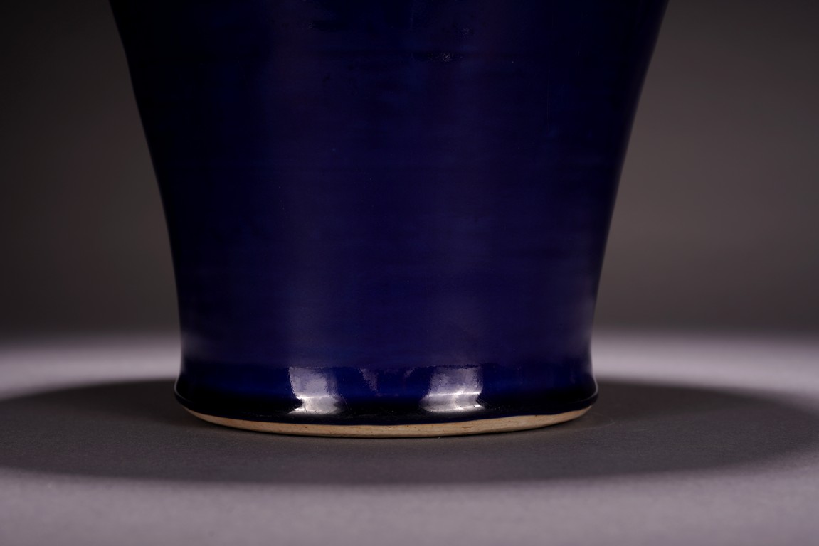 Qing Dynasty period. With full rounded shoulders rising at a gently flaring angle from the base and sweeping to a short waisted neck with a lipped rim, the exterior applied with an intense cobalt-blue glaze, the base left unglazed.