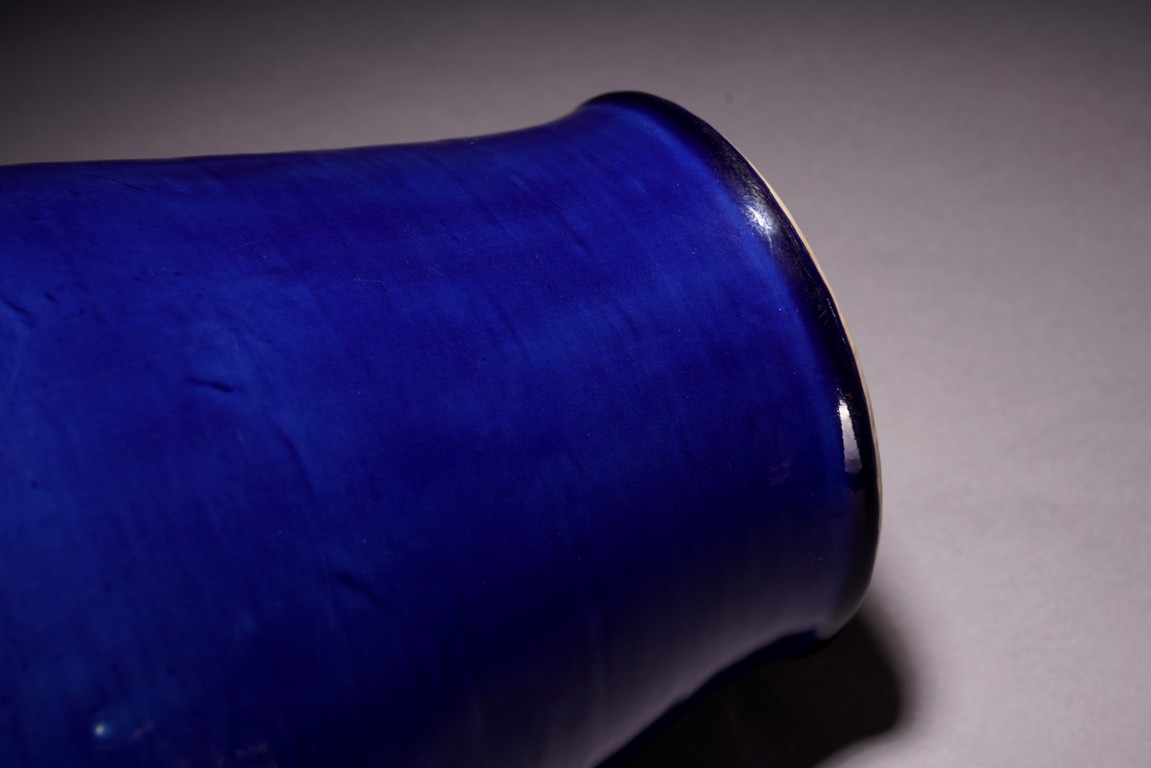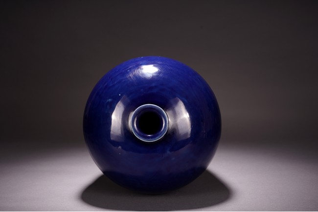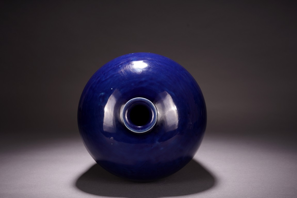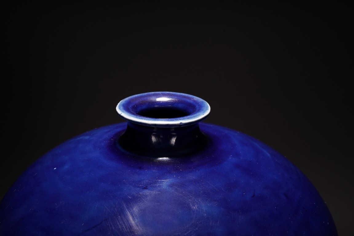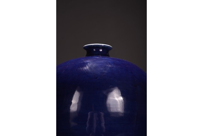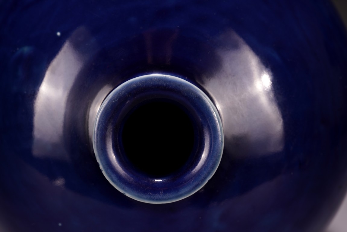 此梅瓶撇口,短頸,豐肩,斂腹,瓶體修長,線條優美婉約,造型別緻柔麗。整體施藍釉,釉汁肥腴,光華內蘊,修胎完美,胎白質細,釉面潔淨光亮,形制秀雅端莊,展現了極為高超的製作技巧。保存完好,值得收藏。