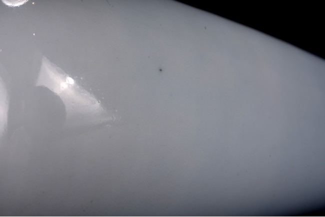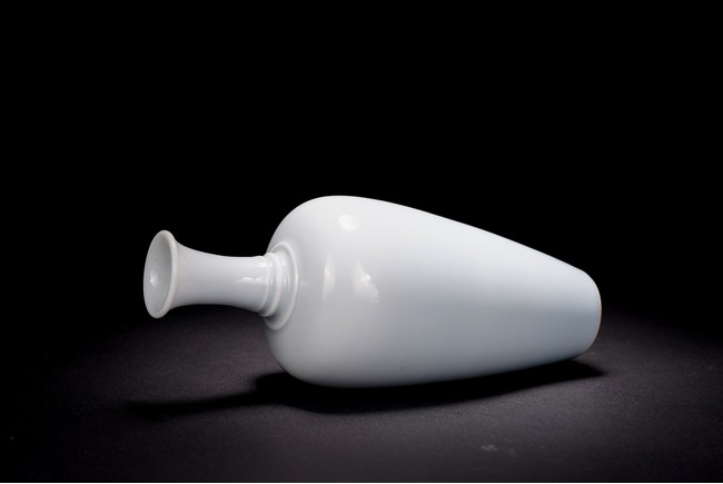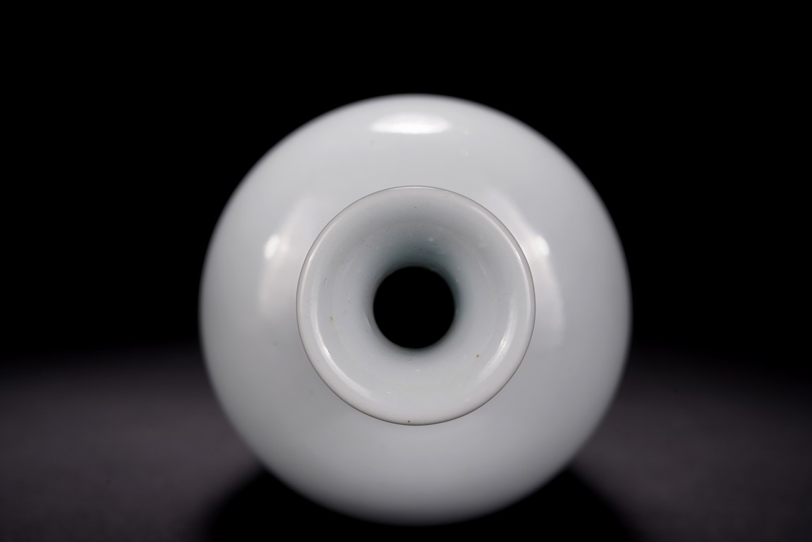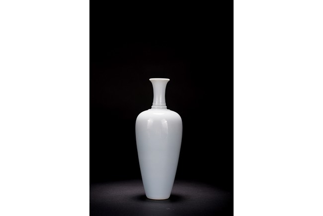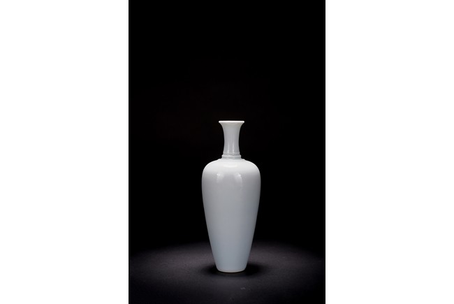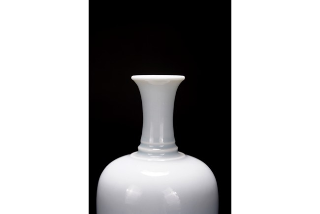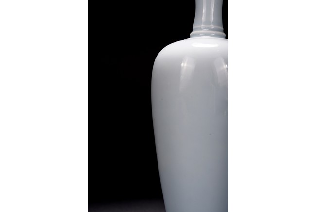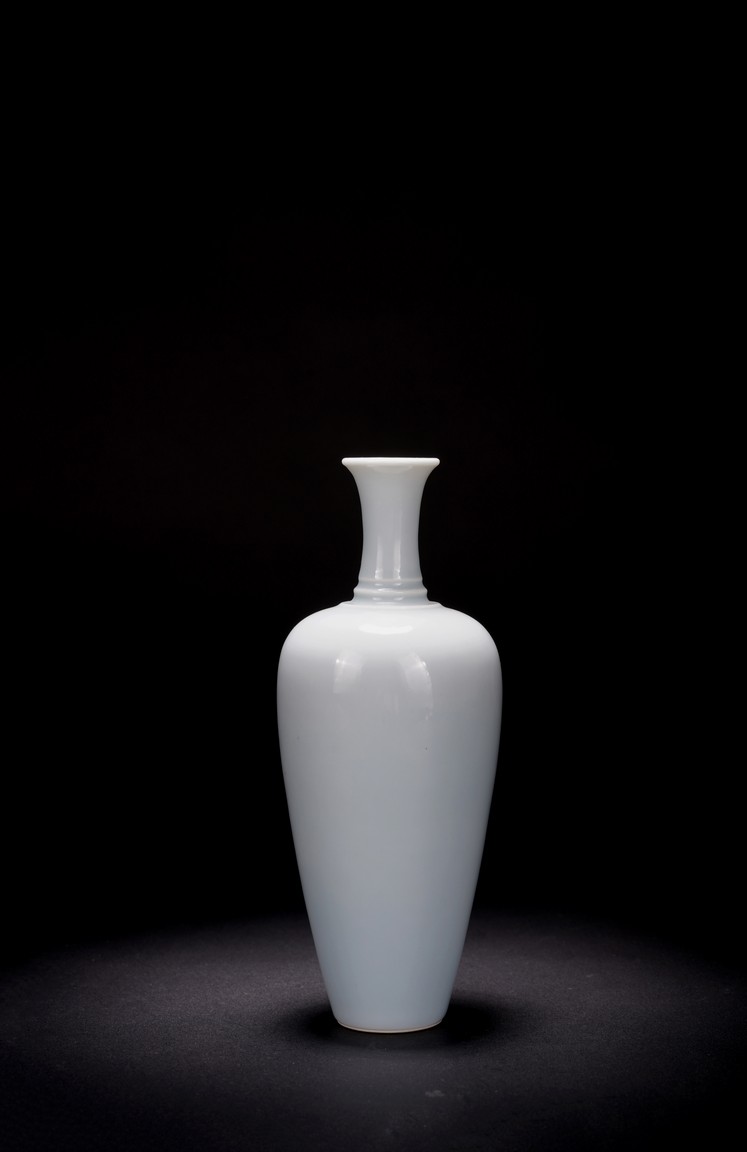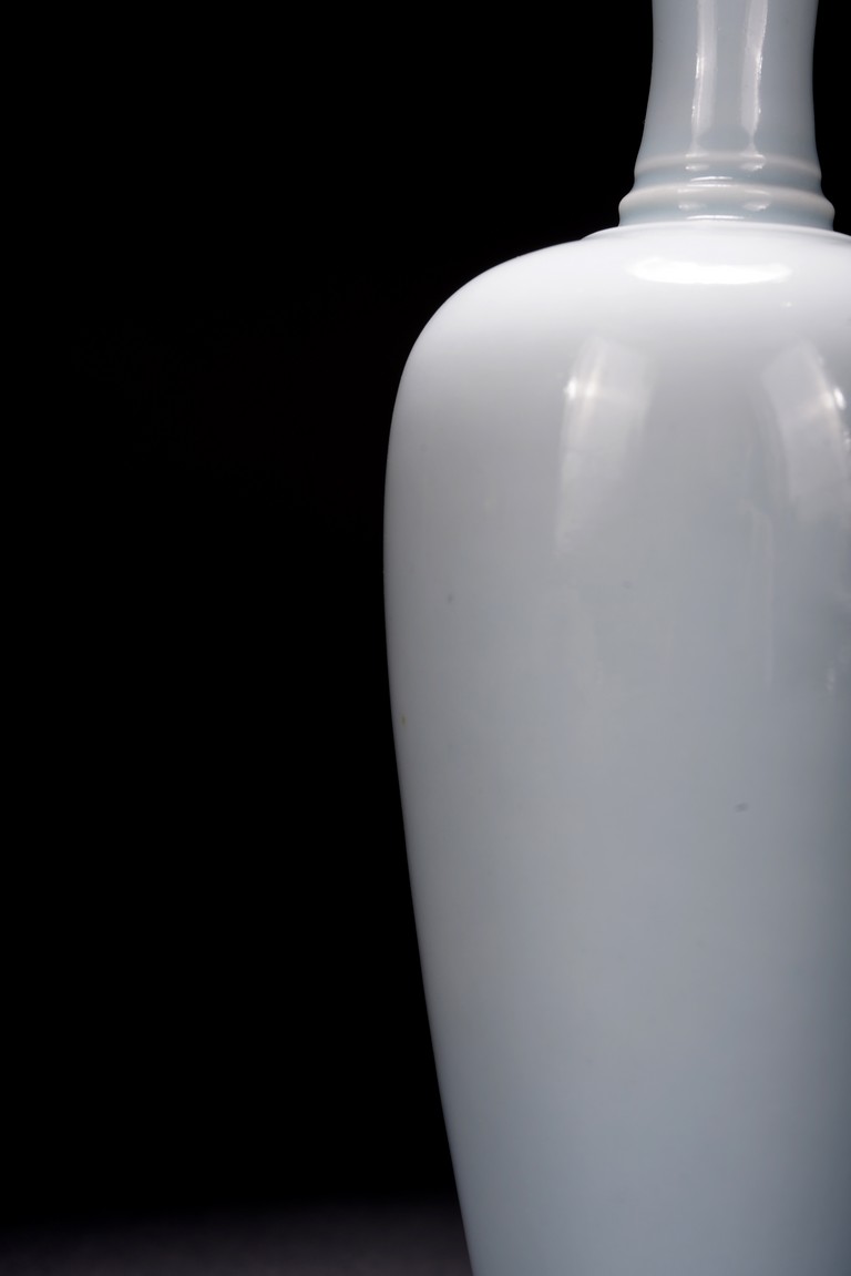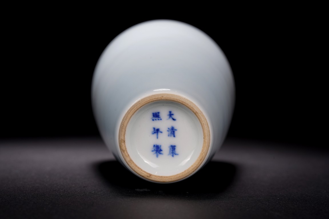此瓶為撇口、細長頸、圓肩、弧腹、下承圈足。通體滿施天藍釉直至足際,瓶身釉色晶瑩細潤,胎薄質堅硬,胎土細膩,線條流暢優美,釉層光亮潔淨。整體形體頎長,線條簡約,風格含蓄秀美,猶如少女卓然而立,別具風姿,值得收藏。底以青花書“大清康熙年制”六字二行楷書款。