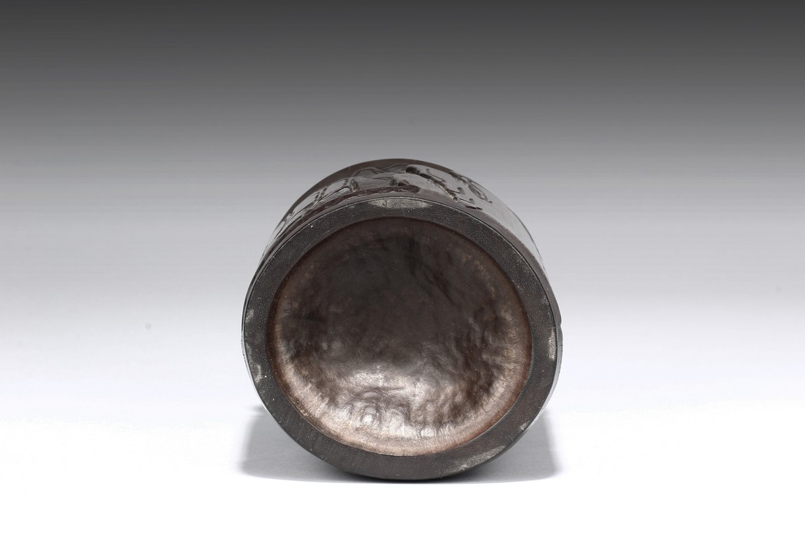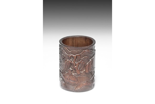 Republic period. Of cylindrical form, the brushpot carved in relief with a seated elderly figure fishing on a rocky outcrop in a mountainous landscape.