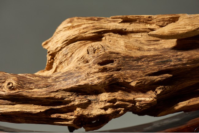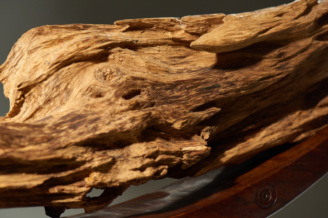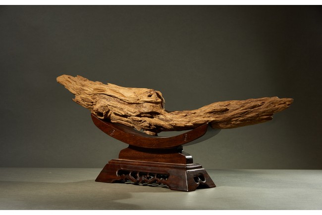 The uncarved natural agarwood formation is of horizontal and slightly arched form, with characteristic aroma and supported on hardwood stand.