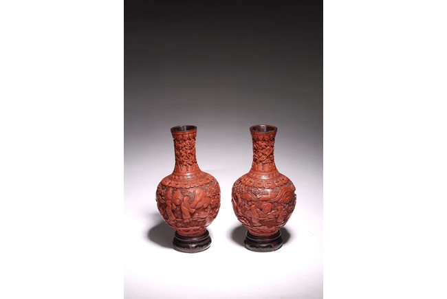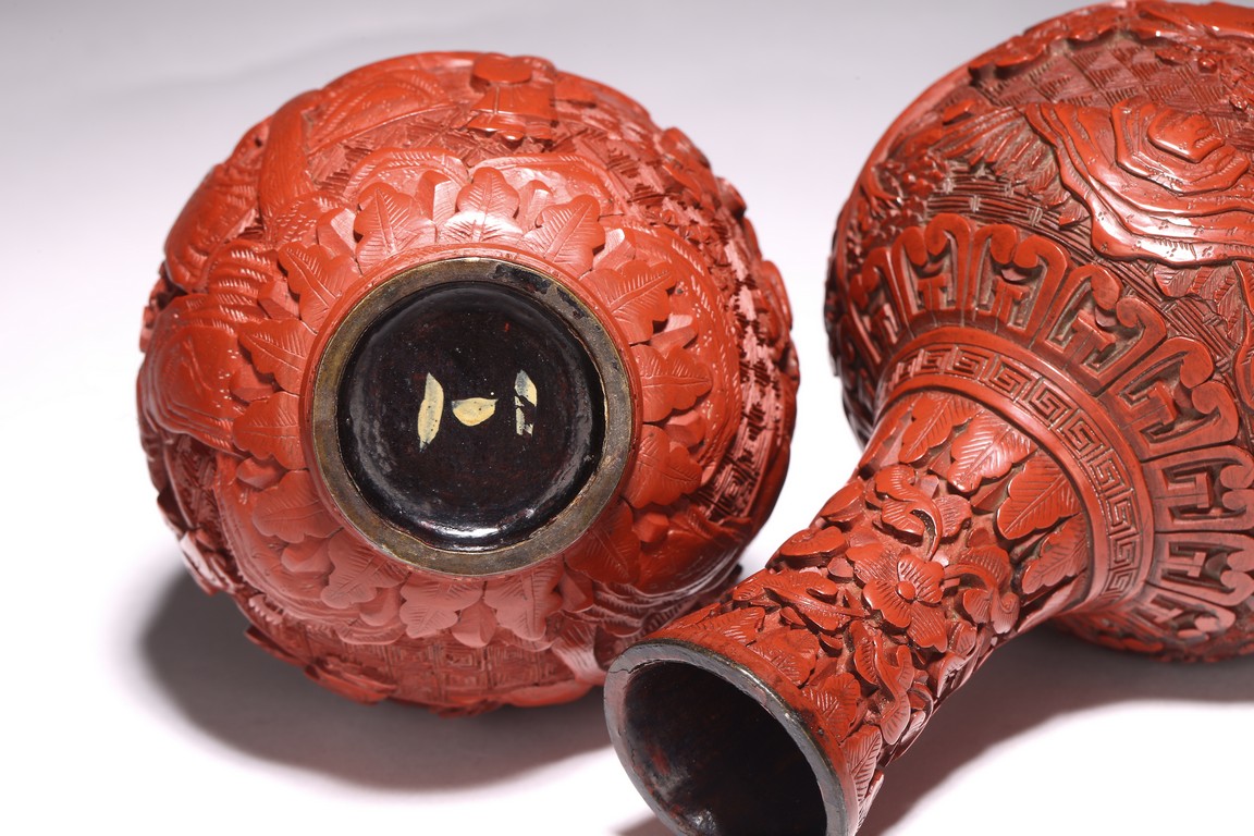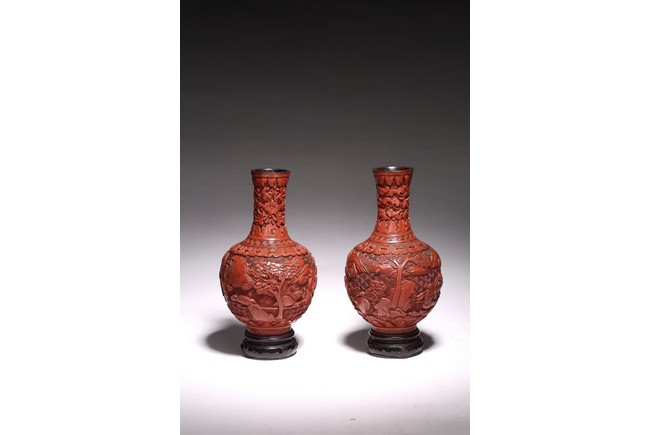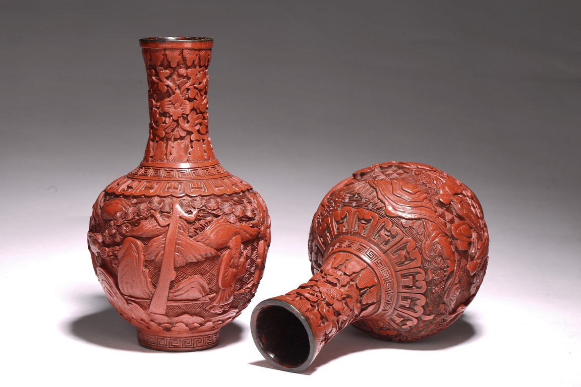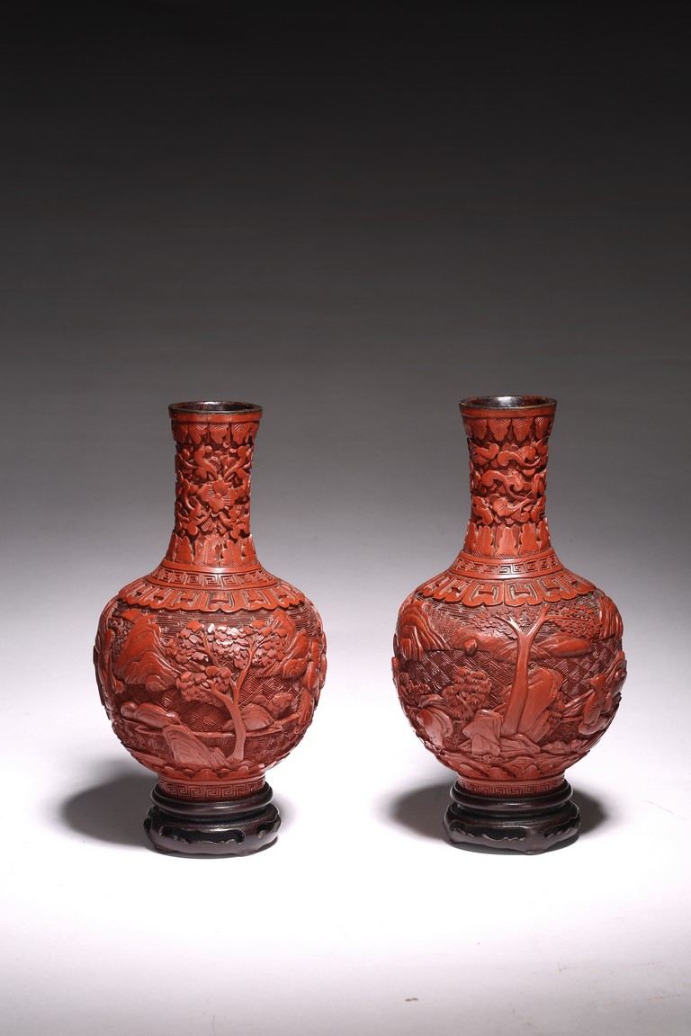 清代漆器主要繼承了明代後期的剔法,即運刀如筆,顯示出峰棱美,有時用刀甚至超越前朝之鋒利,邊緣打磨少,雕刻層次多,細巧工整,做工嚴謹,開創出華麗精巧的典型風格。且漆色艷麗多呈鮮紅色,裝飾紋樣繁縟纖巧,並多與其他工藝相結合,營造出一種富貴堂皇之感。此瓶敞口外撇,束頸豐肩,鼓腹,腹部下收。整體造型豐滿圓滑,穩重大氣,流線優雅。雕工鋒芒畢露,細緻縝密,通過多層次的雕法提升了構圖的立體感,動感,和震撼力,使人賞心悅目,如同置身畫內。庭院深深,遠山近水,在庭院間戲玩,各式各樣,整體組合成一幅帶有喜慶氣氛的嬰戲圖。紋飾繁複精細,刻劃精細流暢,造型優美大方。刻工一絲不苟,紋飾繁複精細,莊重典雅,造型優美大方,成對保存,實屬不易。