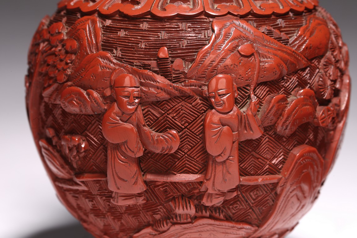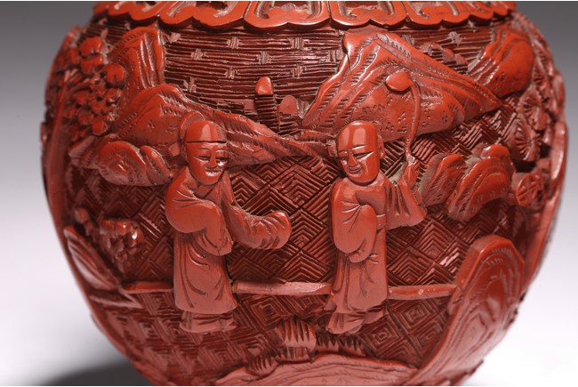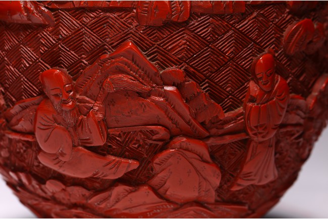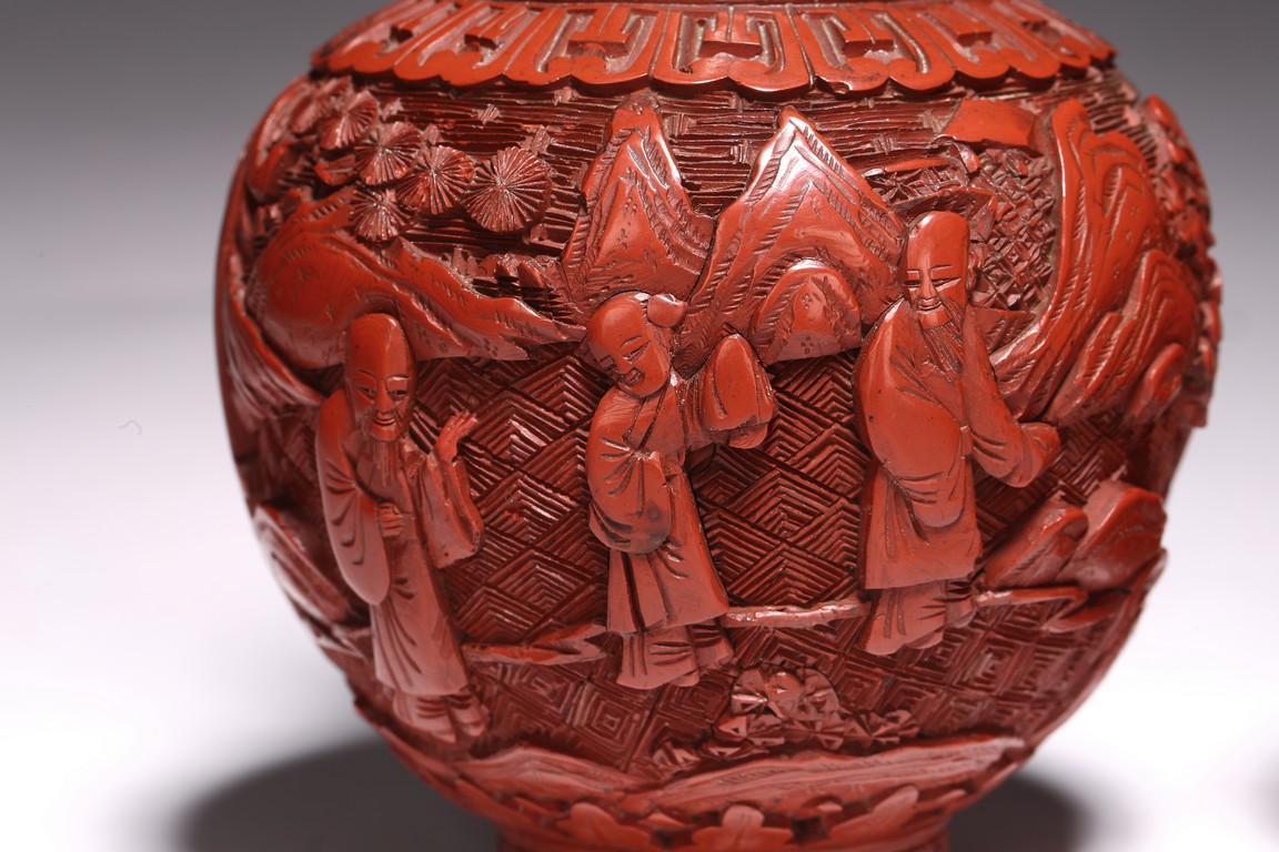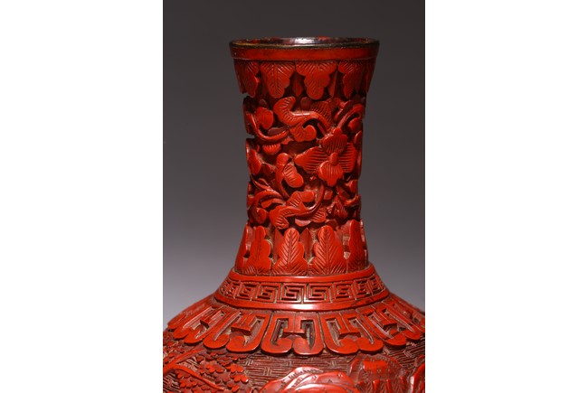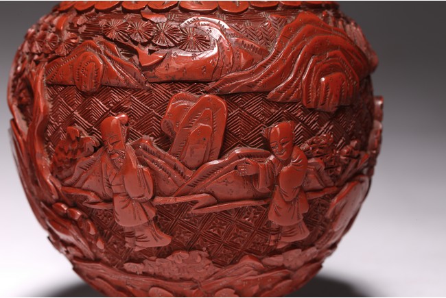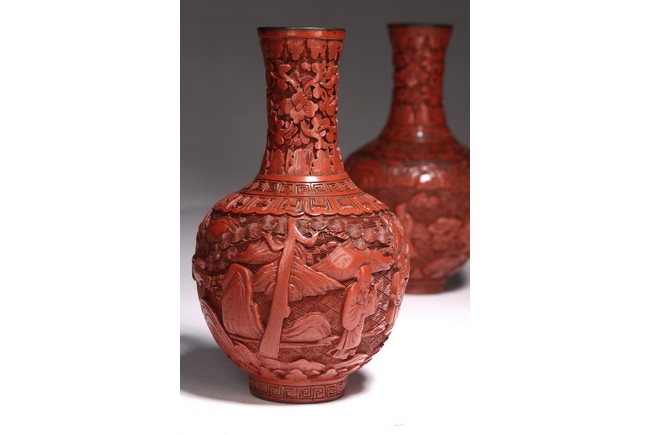 清代漆器主要繼承了明代後期的剔法,即運刀如筆,顯示出峰棱美,有時用刀甚至超越前朝之鋒利,邊緣打磨少,雕刻層次多,細巧工整,做工嚴謹,開創出華麗精巧的典型風格。且漆色艷麗多呈鮮紅色,裝飾紋樣繁縟纖巧,並多與其他工藝相結合,營造出一種富貴堂皇之感。此瓶敞口外撇,束頸豐肩,鼓腹,腹部下收。整體造型豐滿圓滑,穩重大氣,流線優雅。雕工鋒芒畢露,細緻縝密,通過多層次的雕法提升了構圖的立體感,動感,和震撼力,使人賞心悅目,如同置身畫內。庭院深深,遠山近水,在庭院間戲玩,各式各樣,整體組合成一幅帶有喜慶氣氛的嬰戲圖。紋飾繁複精細,刻劃精細流暢,造型優美大方。刻工一絲不苟,紋飾繁複精細,莊重典雅,造型優美大方,成對保存,實屬不易。