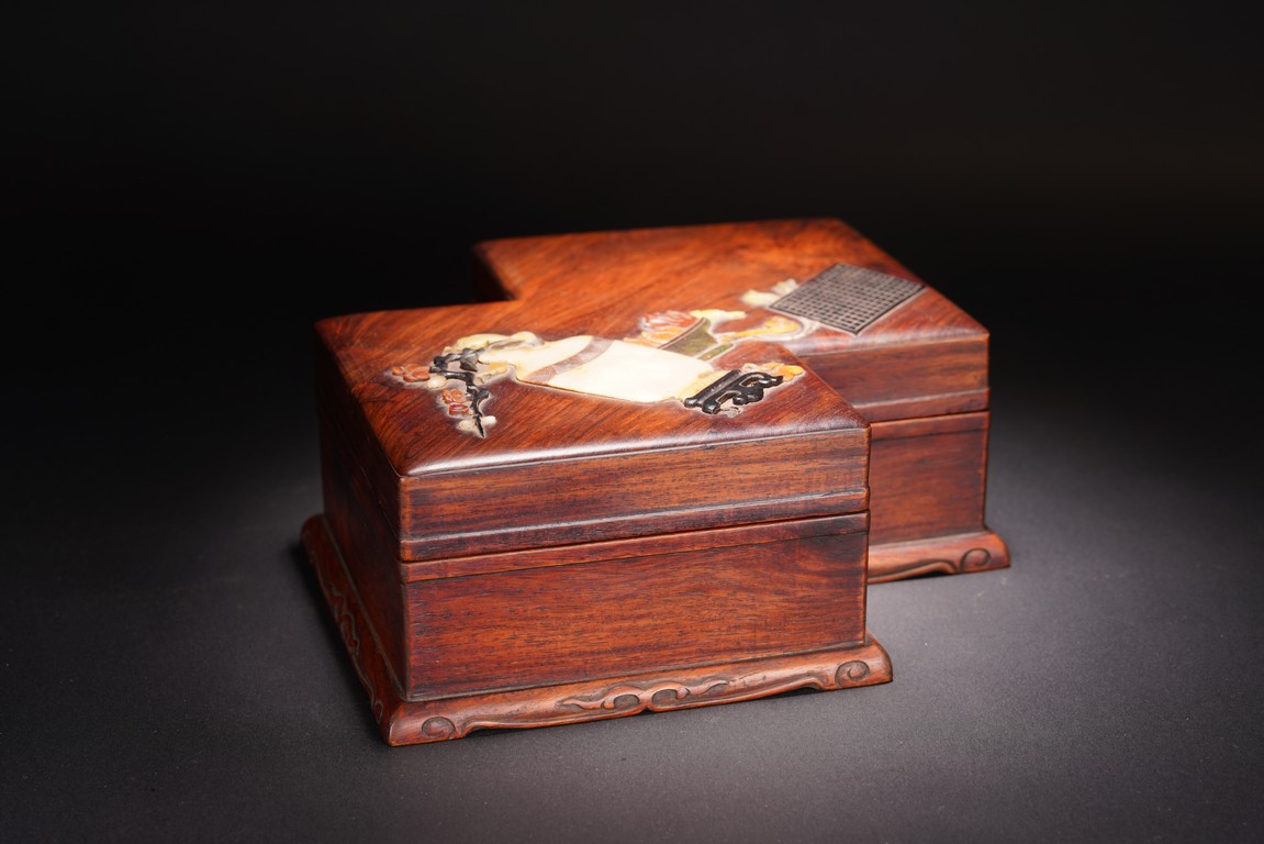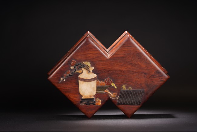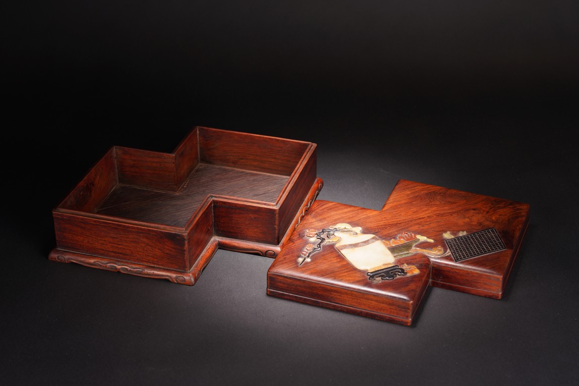 The box top inlaid with flower vase and go board, the wood with typical huanghuali grain.