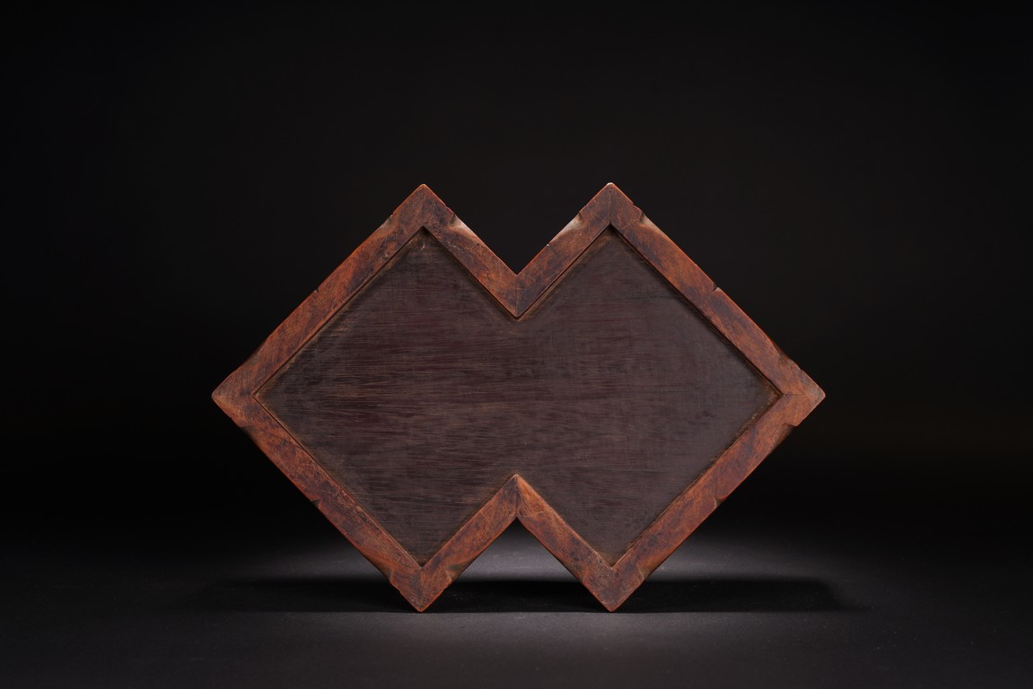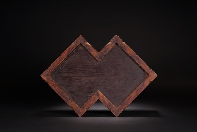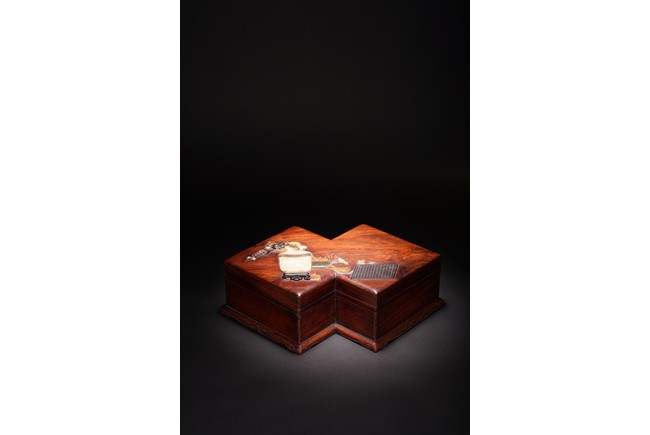 此雙聯盒以精品黃花梨木製作,方形雙聯形,蓋與器身子母口結合,質地堅硬細密,包漿老厚。蓋頂鑲嵌螺鈿、瑪瑙等寶石,繪等瓶花、桃子、佛手等紋飾,紋飾精美,工藝精湛,為傳統紋飾樣式。