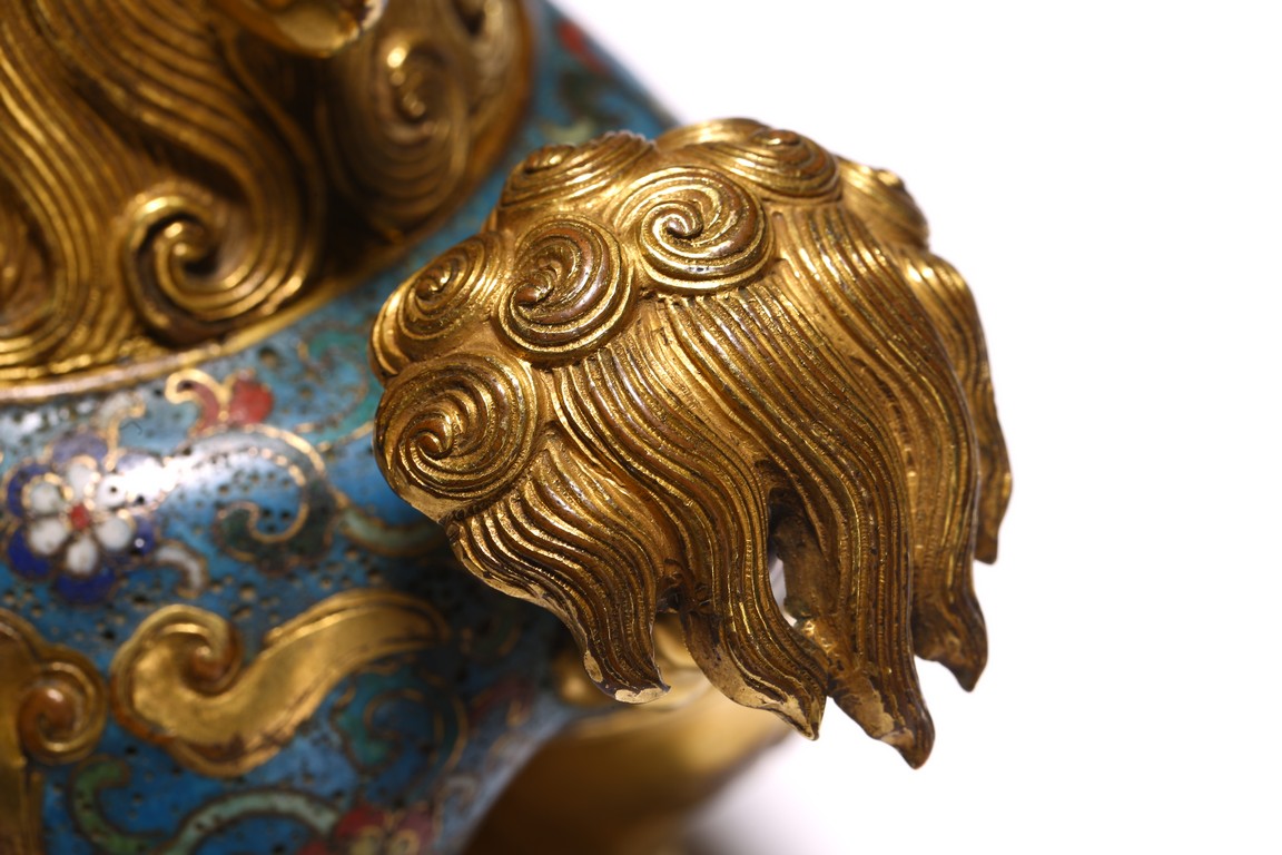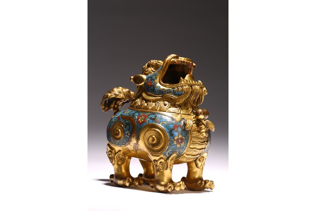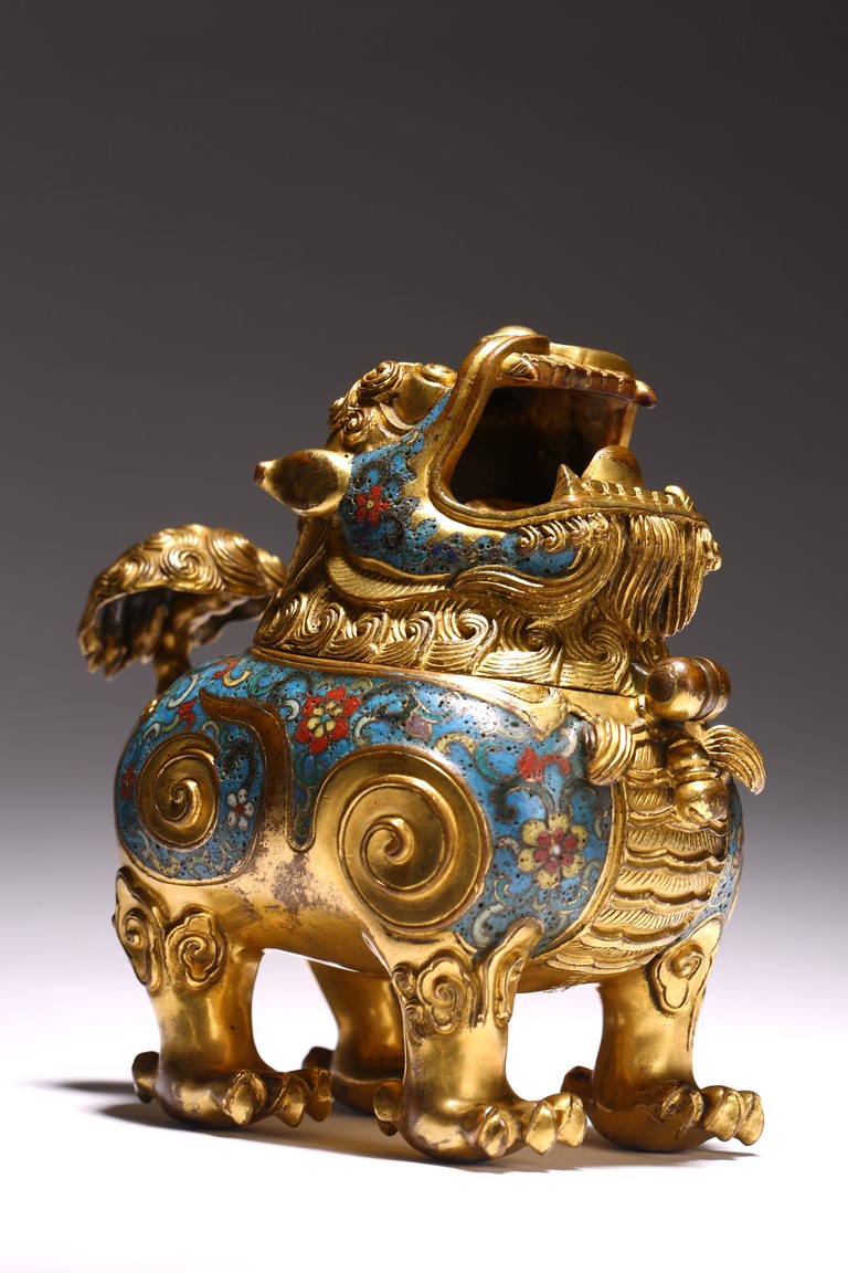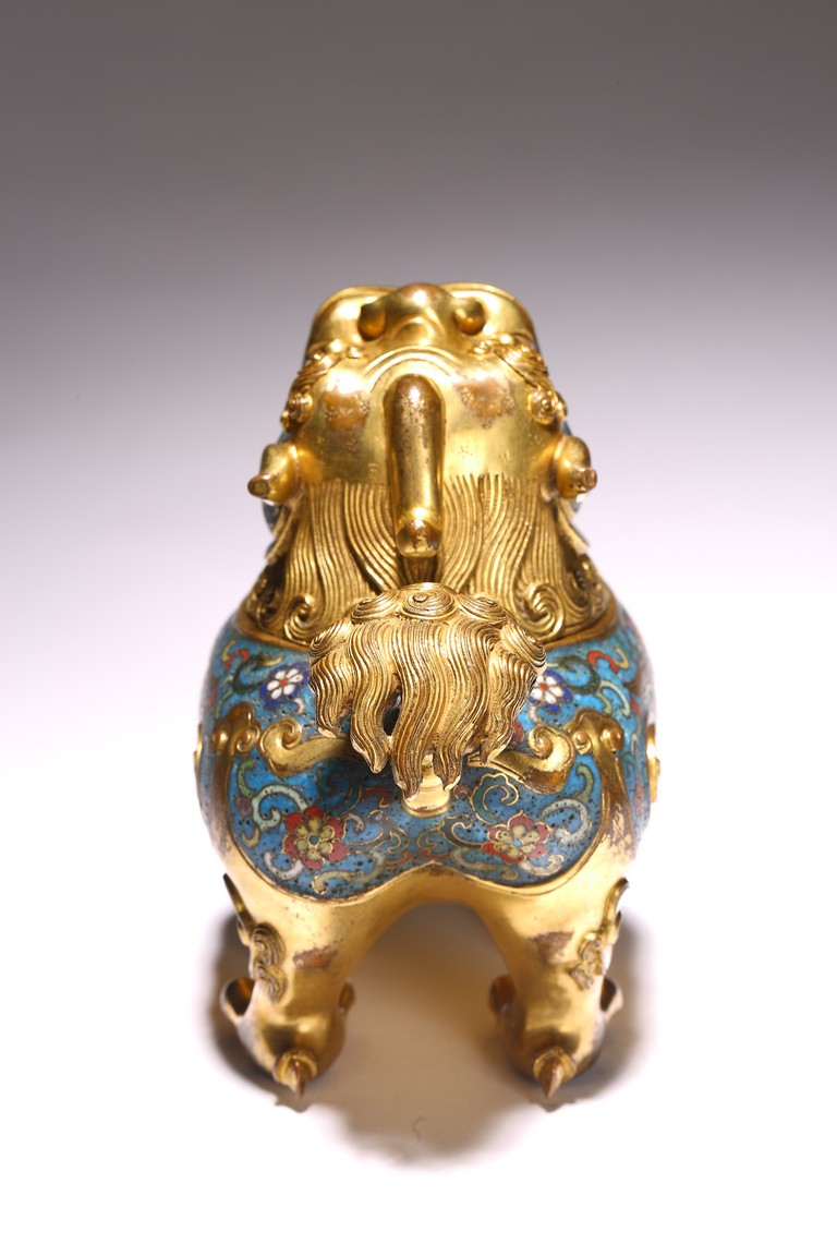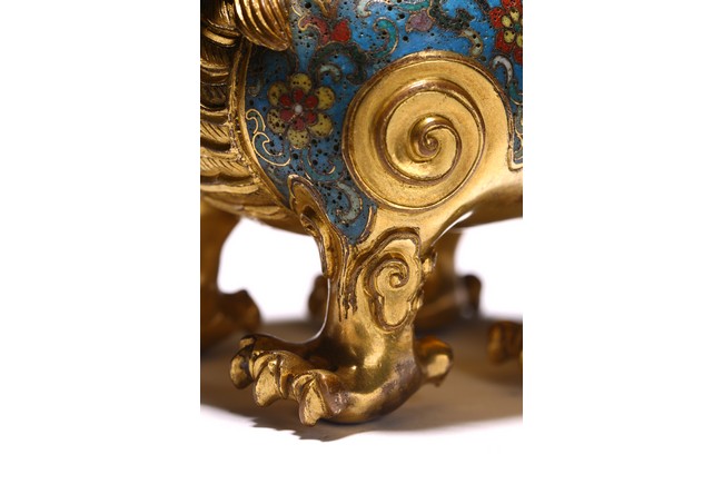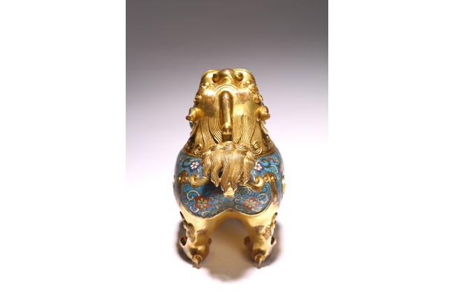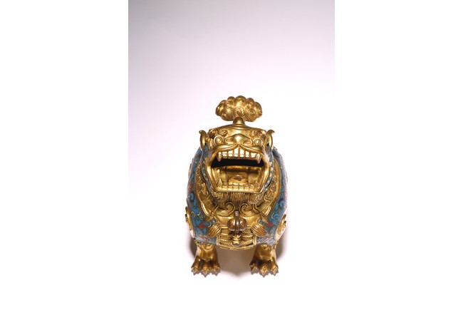 Qing Dynasty period. The beast cast in gilt-bronze, standing four-square on its clawed feet supporting the round hollowed body, the head cast as a cover with large round eyes, mouth wide open with menacing fangs, the body decorated with cloisonne enameled lotus scroll patterns.