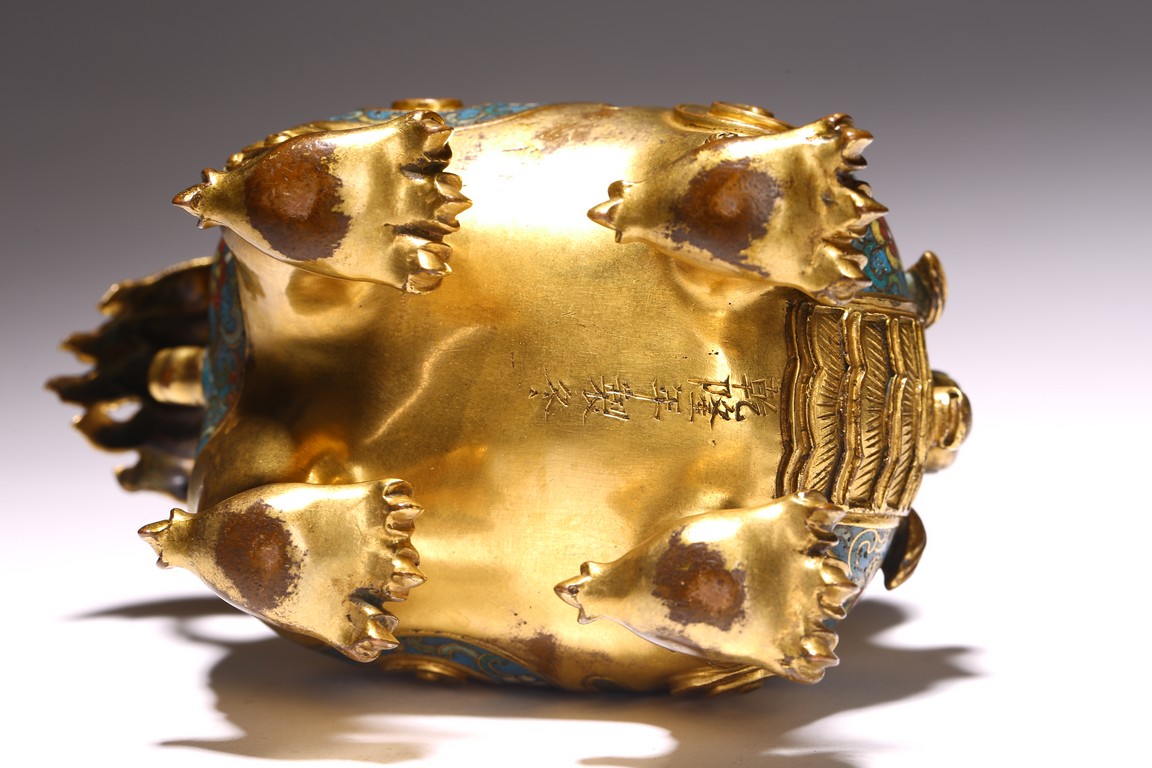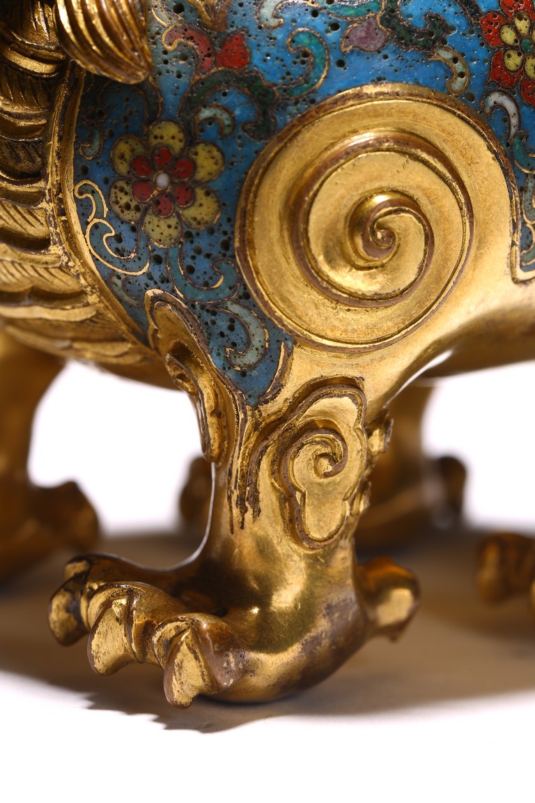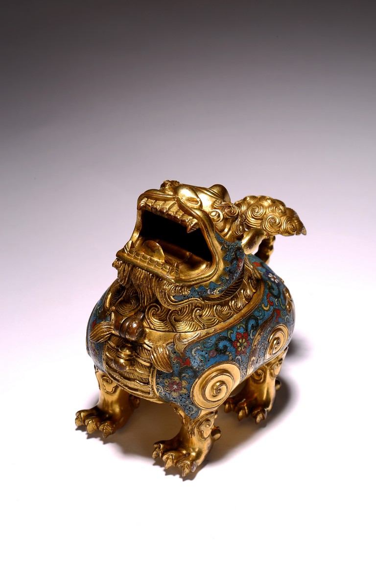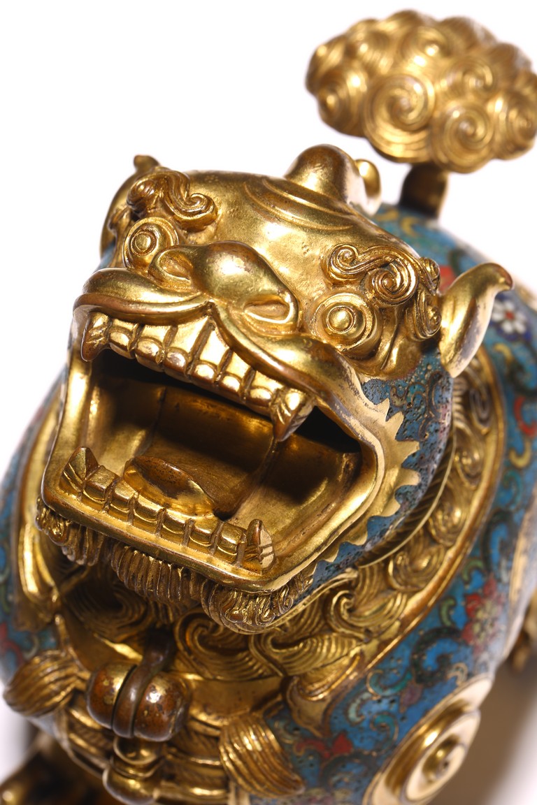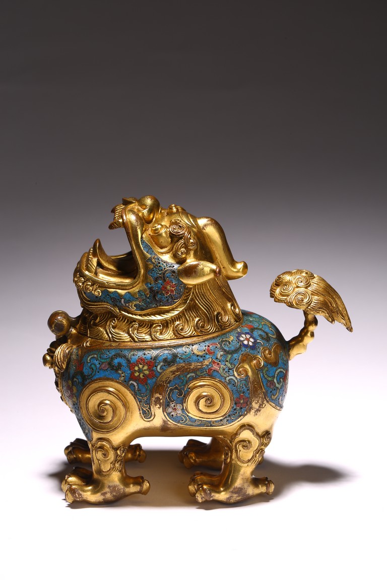 Qing Dynasty period. The beast cast in gilt-bronze, standing four-square on its clawed feet supporting the round hollowed body, the head cast as a cover with large round eyes, mouth wide open with menacing fangs, the body decorated with cloisonne enameled lotus scroll patterns.