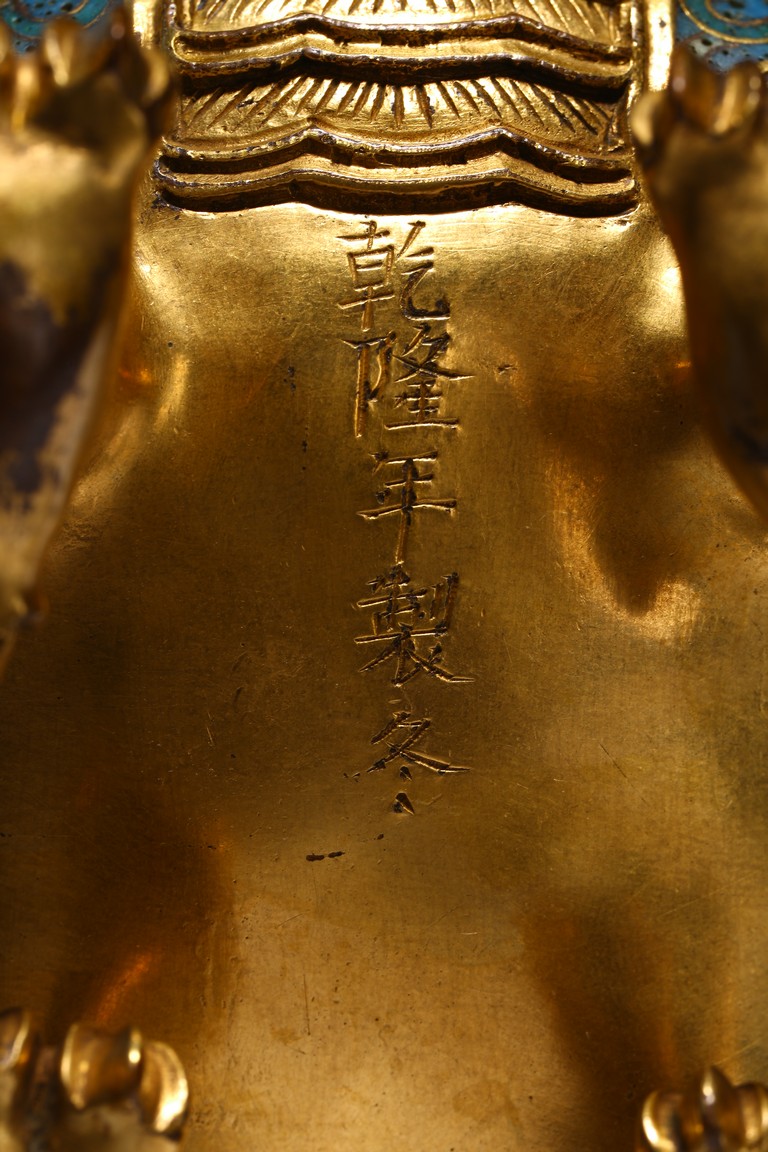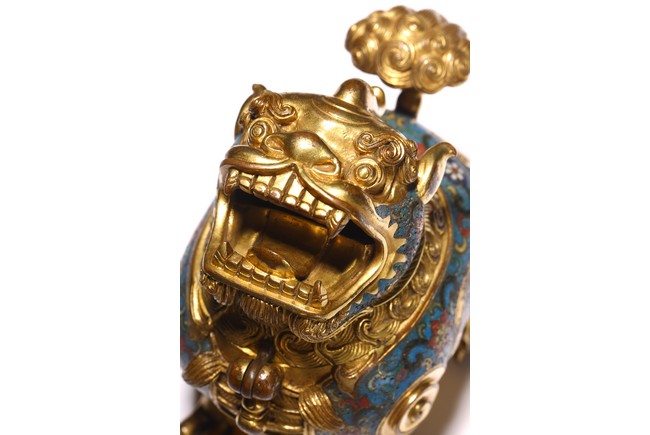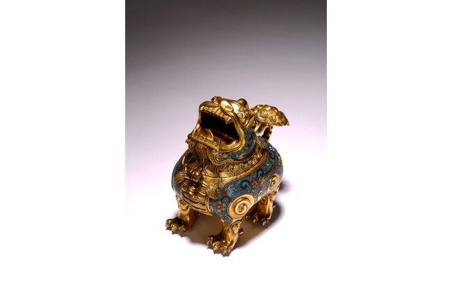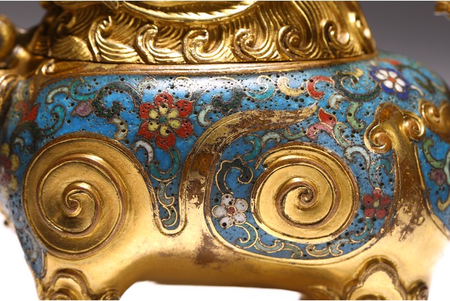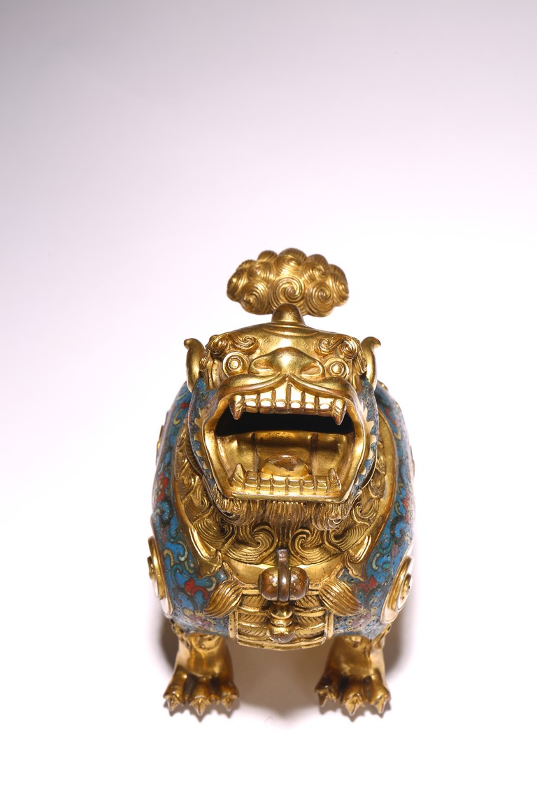 此香蕃以精銅為胎,以古代吉祥瑞獸為造型,通體鎏金,獸身及臉頰掐絲填琺瑯釉。造型別緻美觀,所施琺瑯釉色澤純正,艷麗瑩潤,鎏金厚重,金光璀璨,與琺瑯釉相配愈顯富麗堂皇,展現了清代宮廷所用掐絲琺瑯工藝的風貌特點,為文房精品擺件,值得收藏。