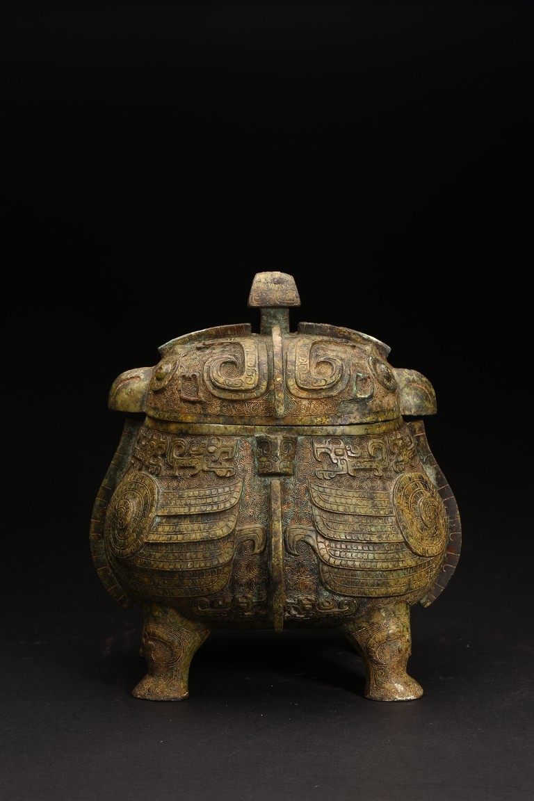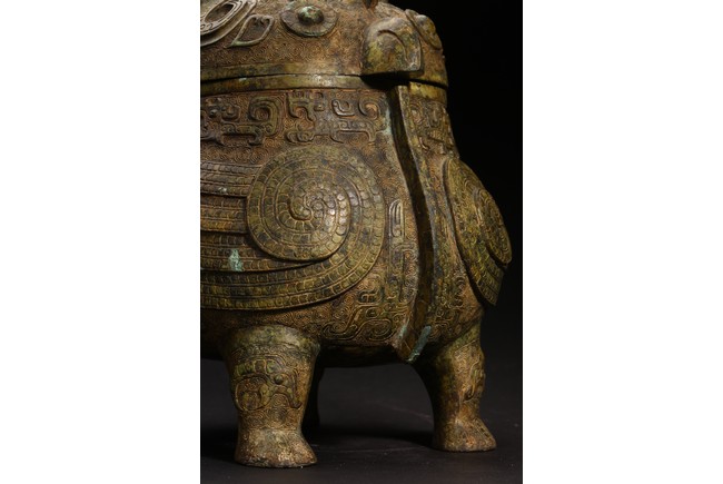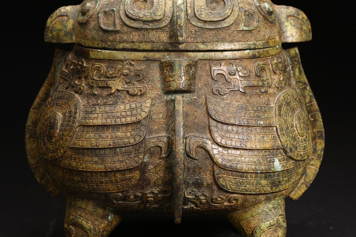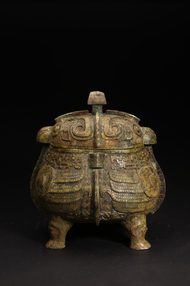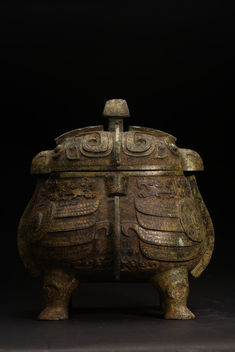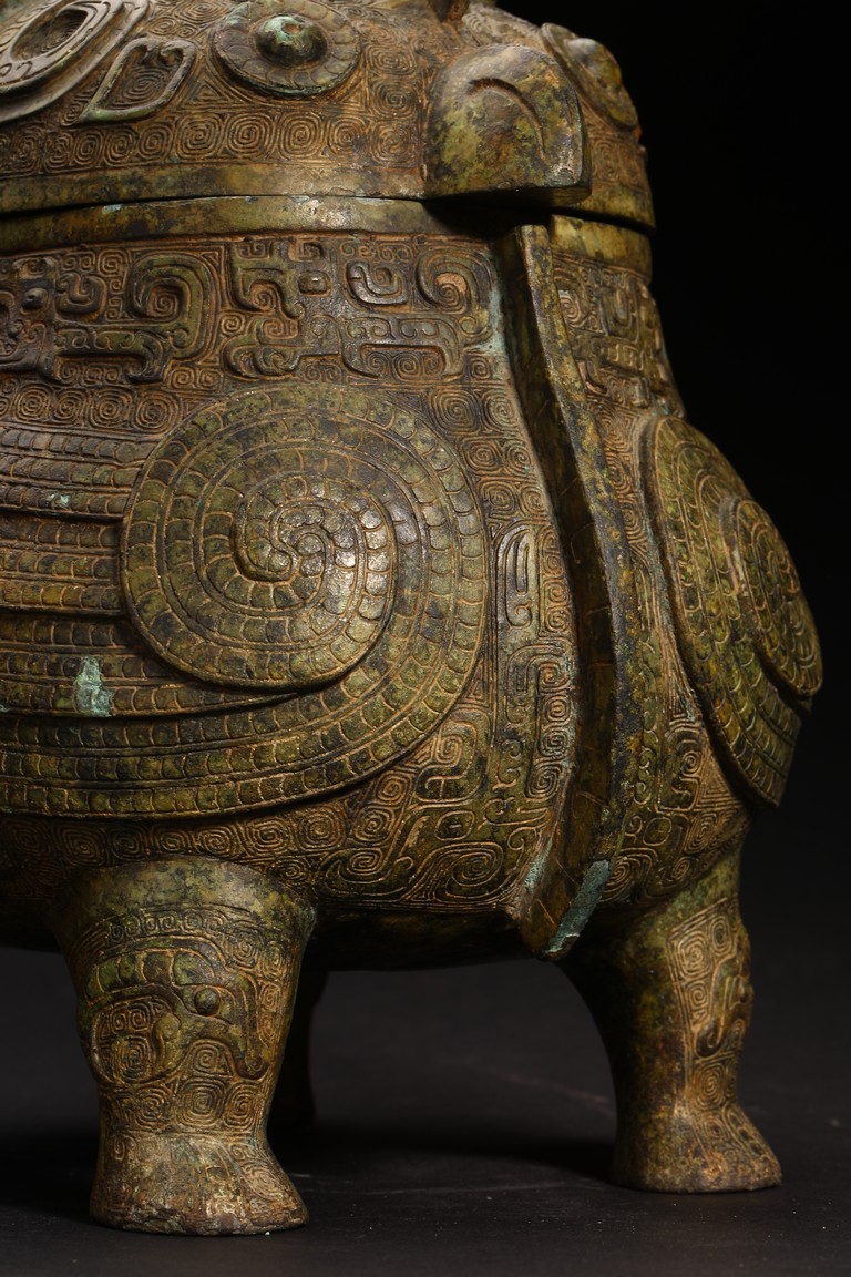 此件造型為商周時期重要的青銅禮器和食器,主要盛放煮熟的黍、稷、稻、粱等食糧用。整體呈兩隻獸鳥形,蓋為兩隻鳥頭,腹部為鳥身,足為兩隻鳥爪,滿飾象形紋飾並鏨刻回紋,造型敦實,形制飽滿,包漿自然瑩潤,保存完好,十分難得。蓋內刻八字銘文。 來源:維吉尼亞州私人藏家舊藏 。類似器型,可參考明尼阿波利斯美術館藏商代青銅鴞型四足卣 Provenance: Property from a Virginia private collection. Compare a similar bronze owl ritual vessel, You, 50.46.118a,b in the collection of Minneapolis Institute of Art