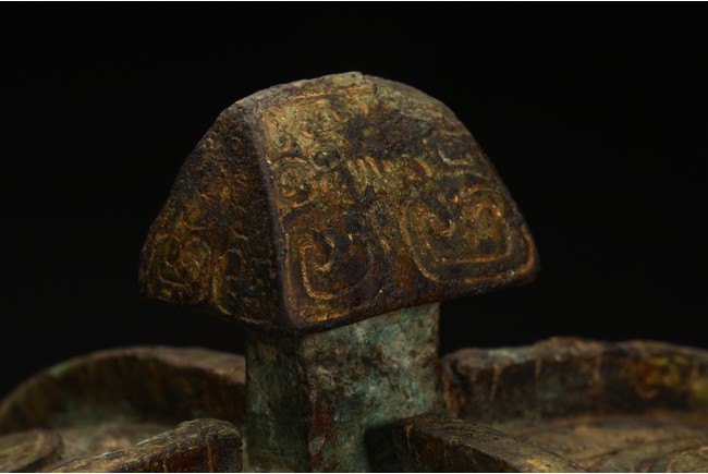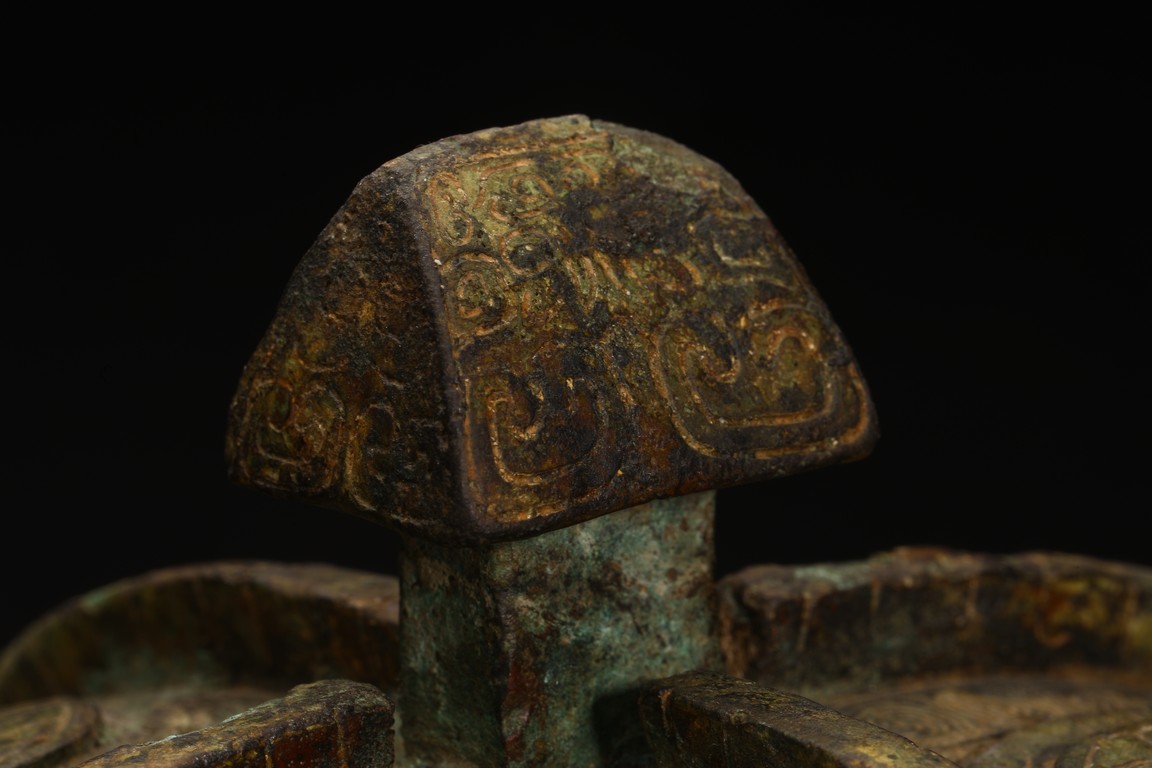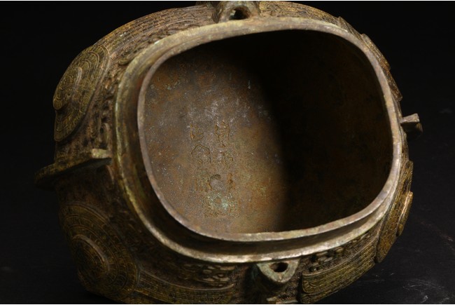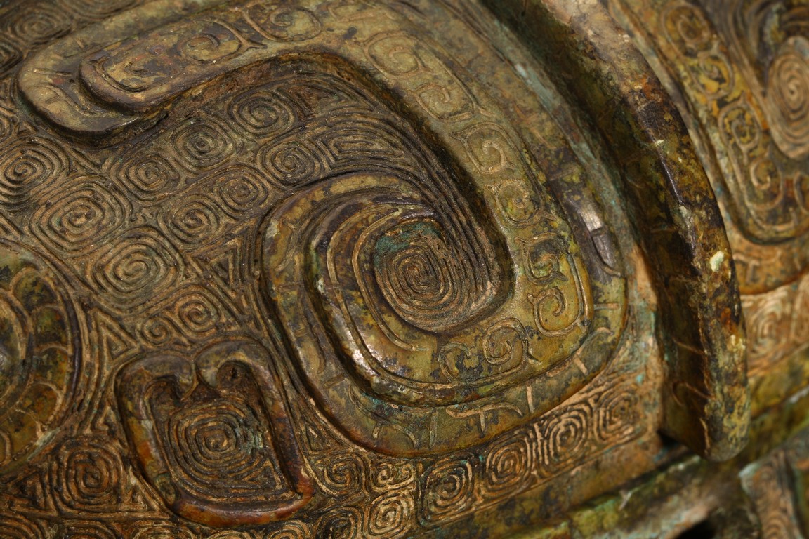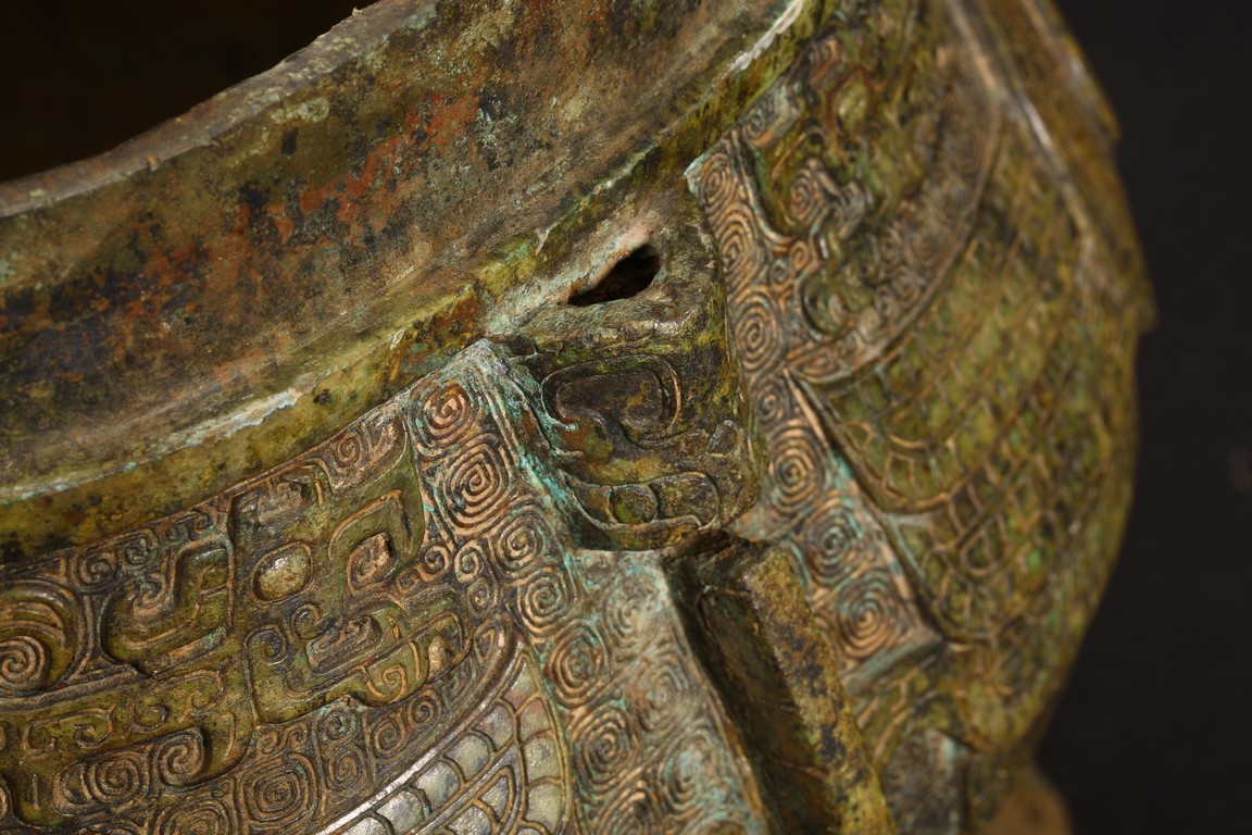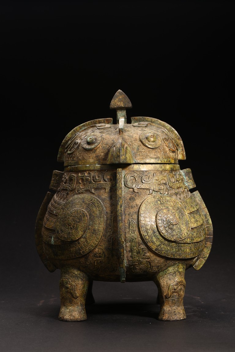 此件造型為商周時期重要的青銅禮器和食器,主要盛放煮熟的黍、稷、稻、粱等食糧用。整體呈兩隻獸鳥形,蓋為兩隻鳥頭,腹部為鳥身,足為兩隻鳥爪,滿飾象形紋飾並鏨刻回紋,造型敦實,形制飽滿,包漿自然瑩潤,保存完好,十分難得。蓋內刻八字銘文。 來源:維吉尼亞州私人藏家舊藏 。類似器型,可參考明尼阿波利斯美術館藏商代青銅鴞型四足卣 Provenance: Property from a Virginia private collection. Compare a similar bronze owl ritual vessel, You, 50.46.118a,b in the collection of Minneapolis Institute of Art