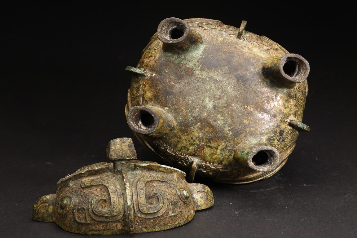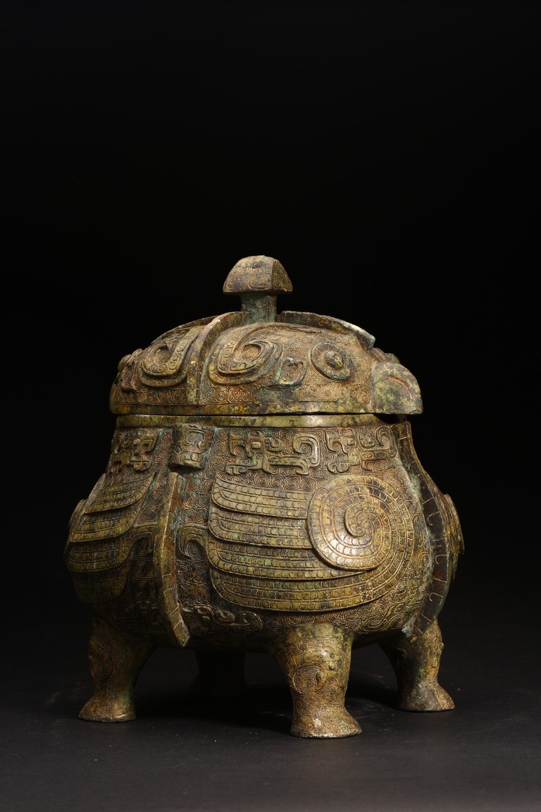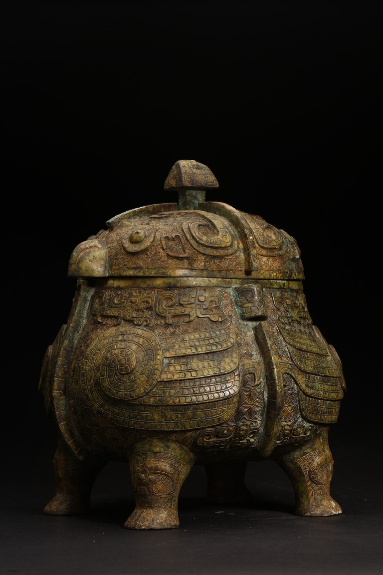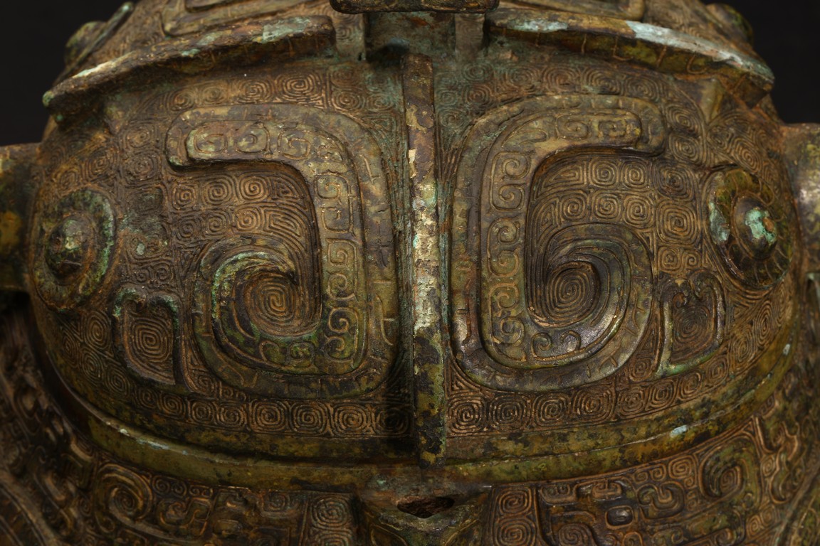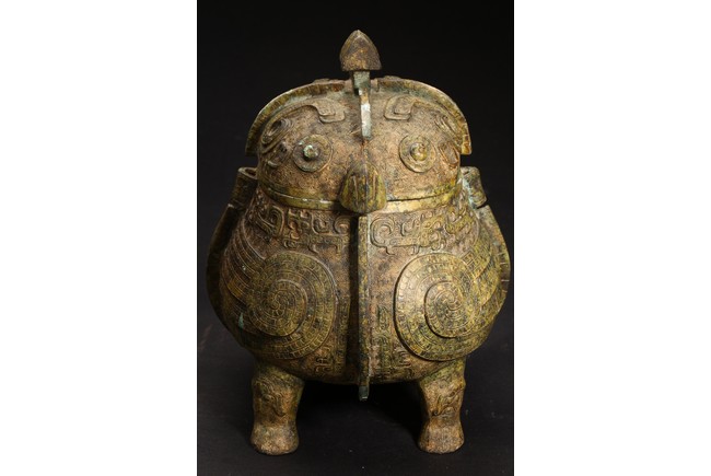Shang Dynasty period or later. Of oval section in the form of two addorsed owls, their rounded bodies supported on four stout legs, cast in high relief with four wings, the domed fitted cover cast on each side with a pair of large round protuberant eyes centered on a sharp hooked beak, the heads further adorned with two pairs of C-shaped ears, all reserved on dense leiwen ground, below a segmented bud-shaped finial cast, with malachite encrustation. The inside of cover inscribed with eight characters.