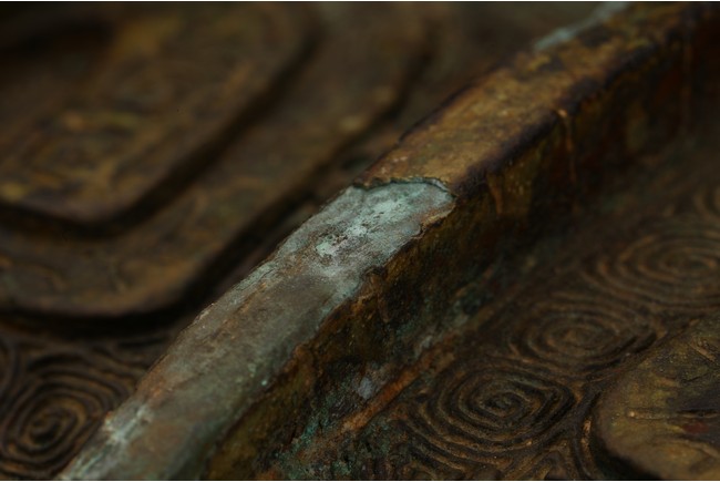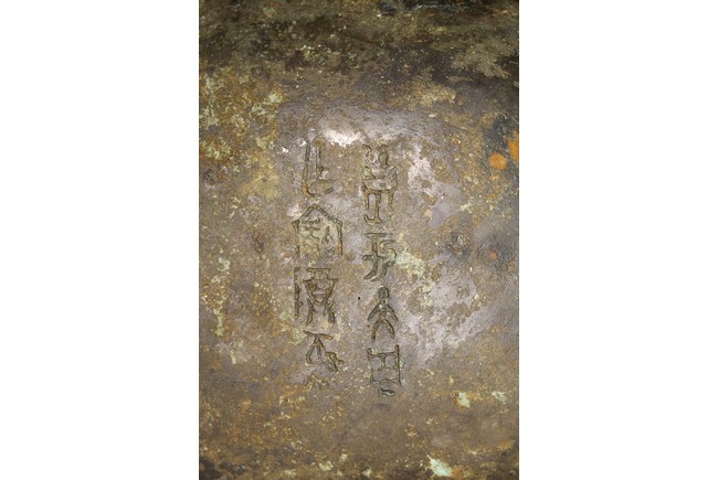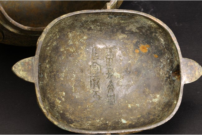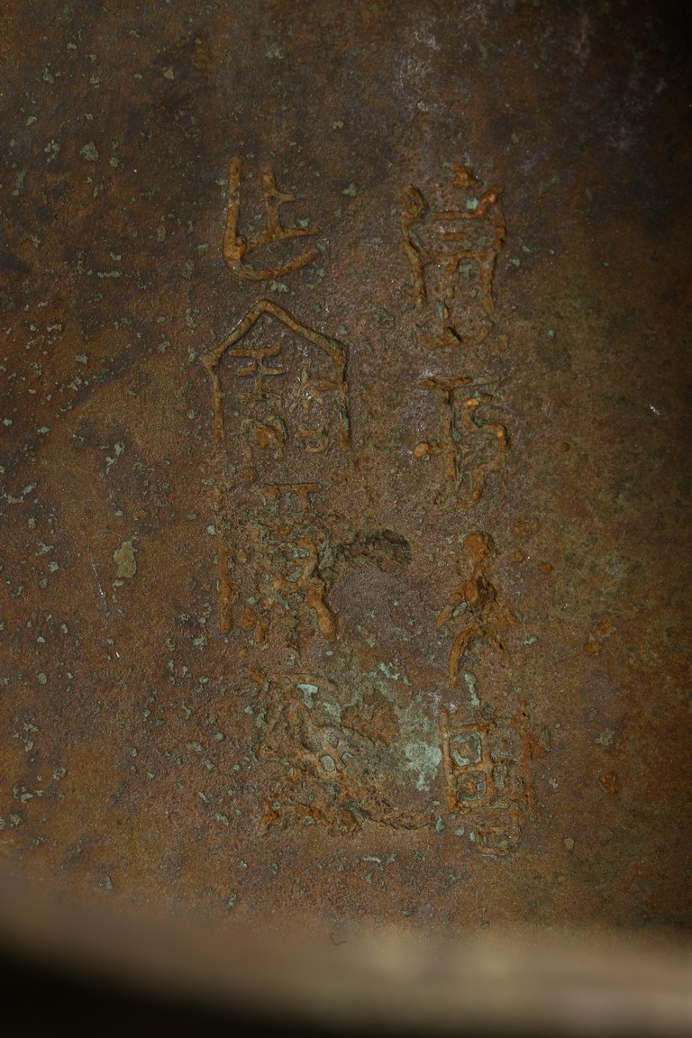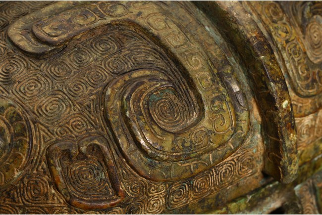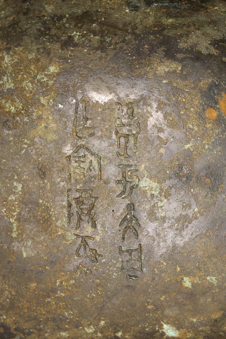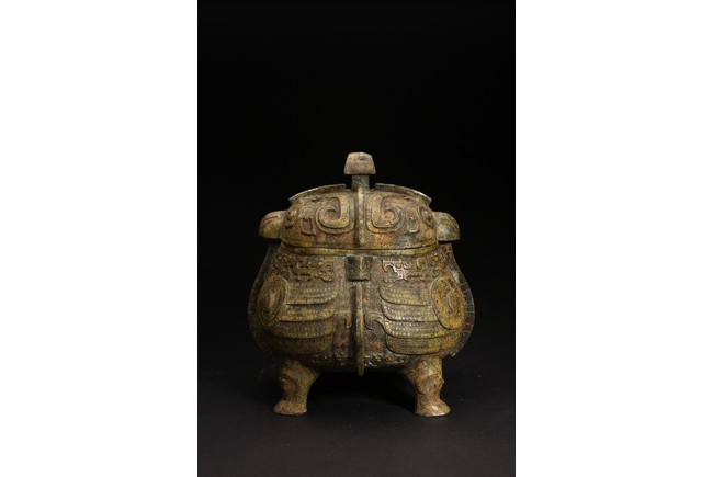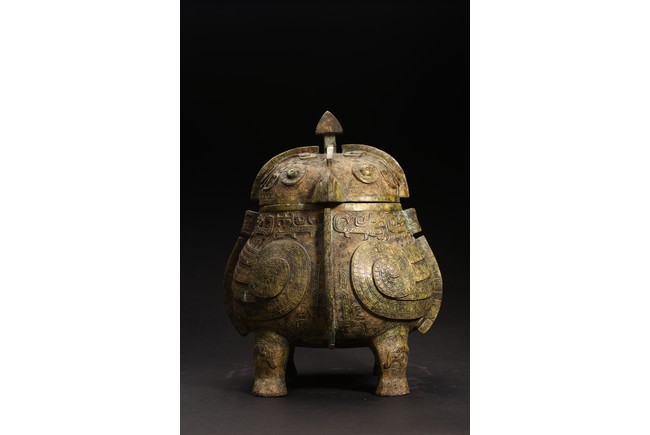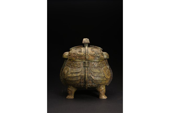 Shang Dynasty period or later. Of oval section in the form of two addorsed owls, their rounded bodies supported on four stout legs, cast in high relief with four wings, the domed fitted cover cast on each side with a pair of large round protuberant eyes centered on a sharp hooked beak, the heads further adorned with two pairs of C-shaped ears, all reserved on dense leiwen ground, below a segmented bud-shaped finial cast, with malachite encrustation. The inside of cover inscribed with eight characters.