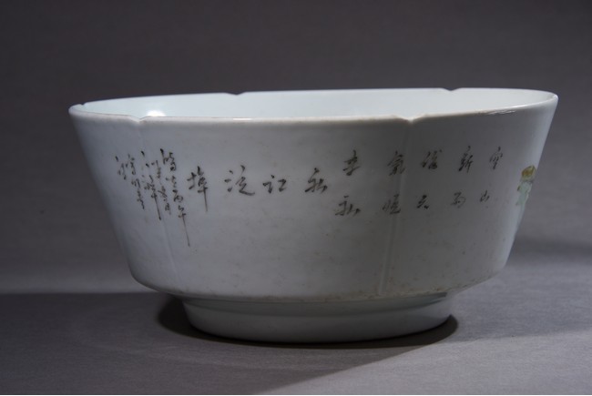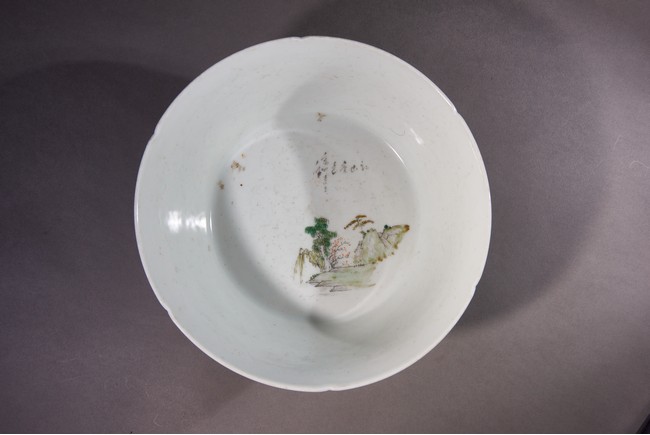 Painted to the exterior with a continuous landscape scene and interior with inscriptions.