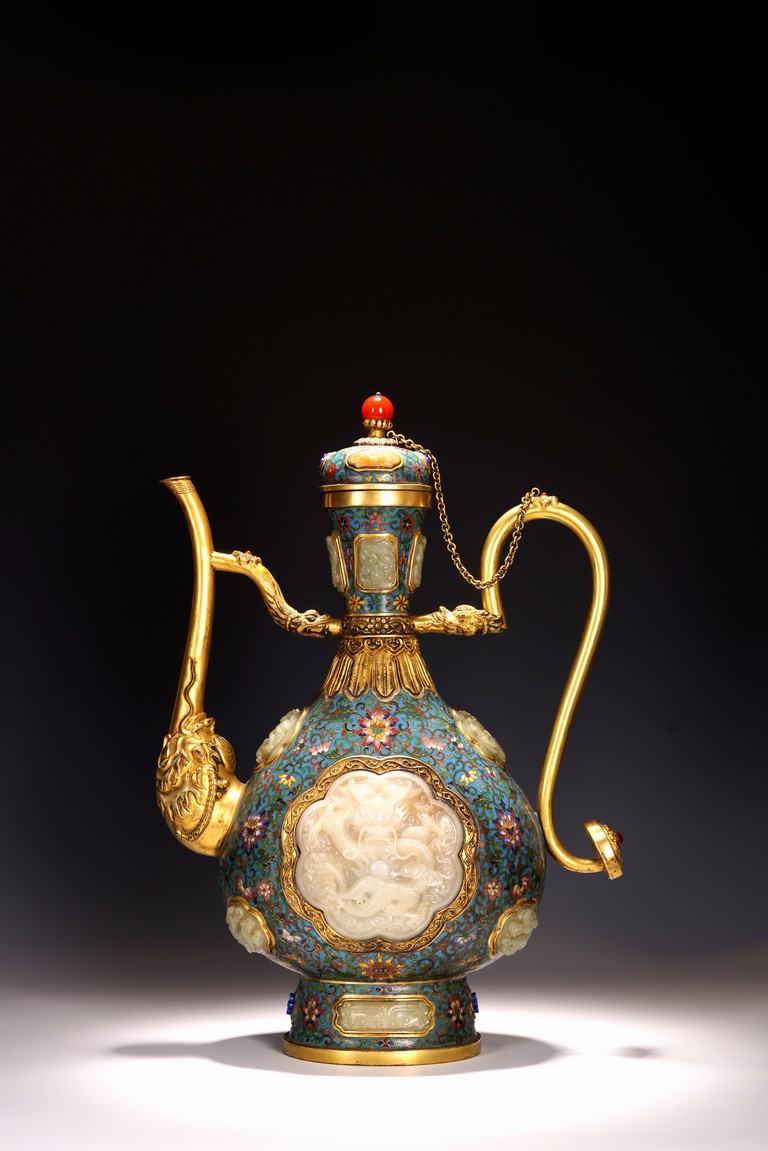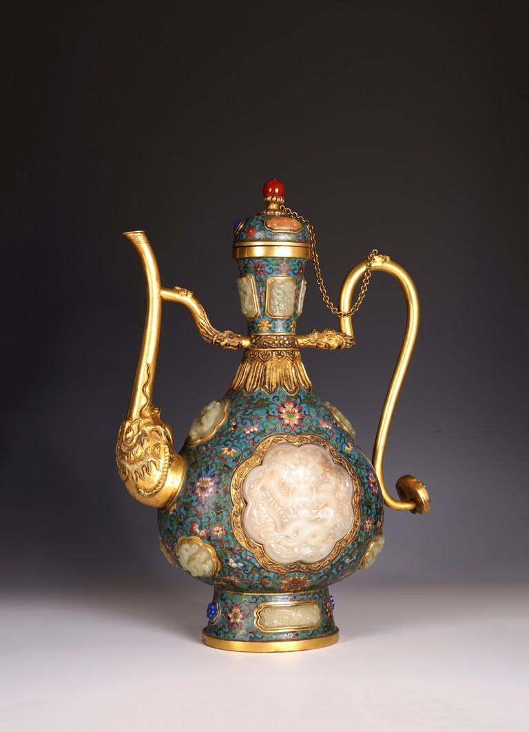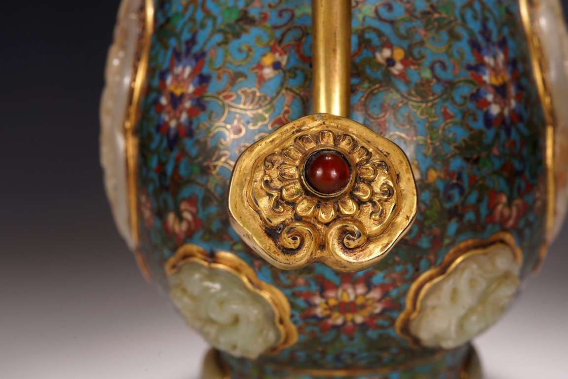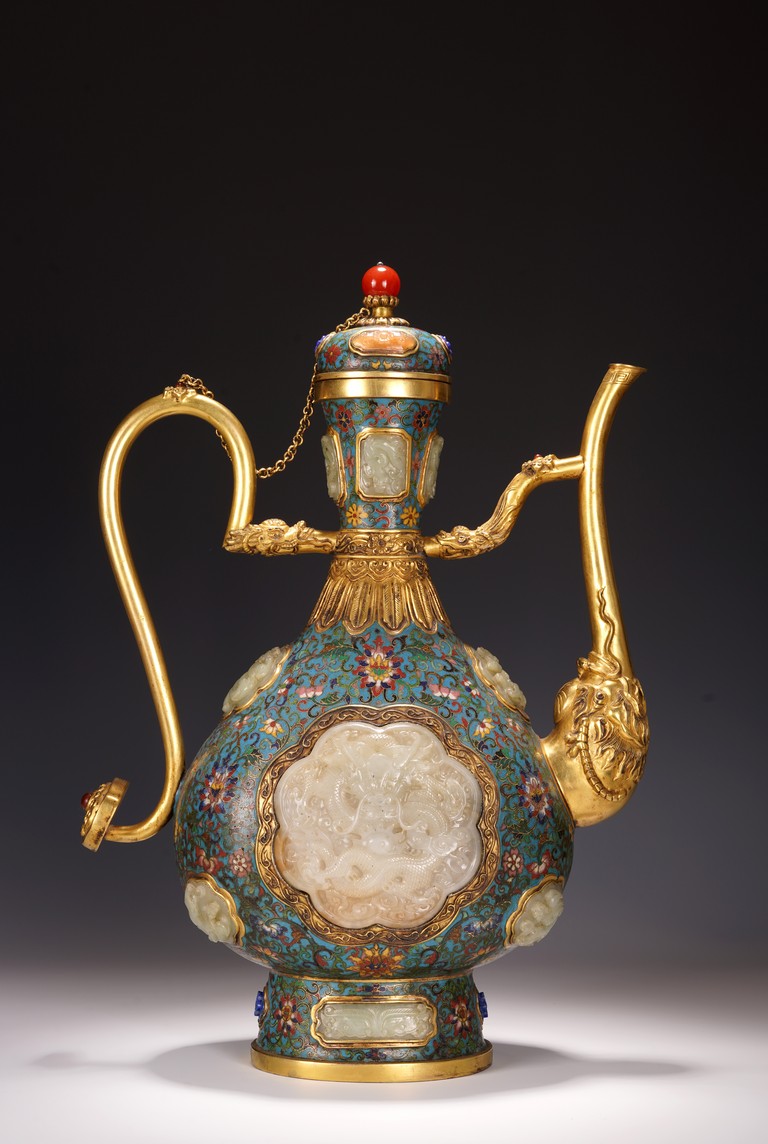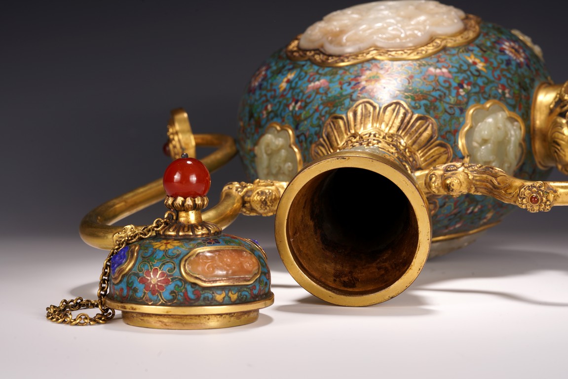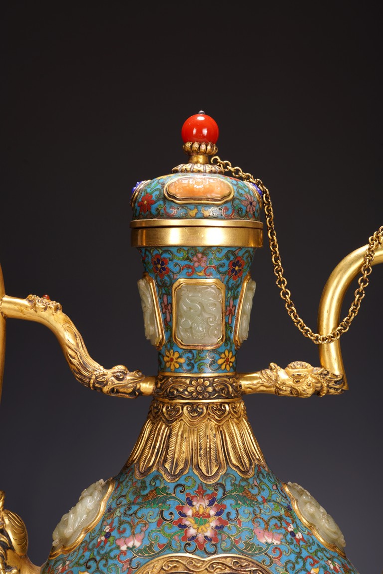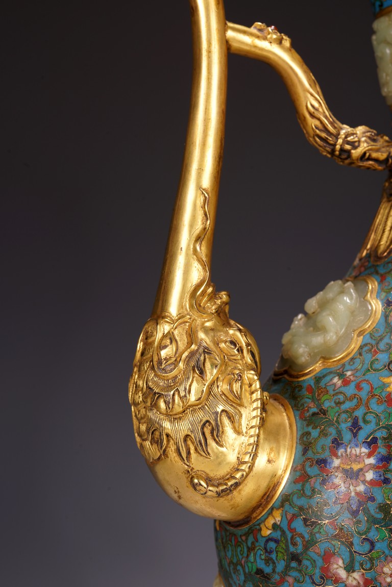 此執壺以精銅為材,整體為西域風格,圓口束頸,鼓腹下垂,圈足,足牆較高,帶獸,細長流,如意彎把。流、把、頸部、口及足以銅鎏金裝飾,器身通體掐絲填琺瑯釉,於藍色地上繪畫纏枝花卉紋,並開光嵌大大小小的玉花片十幾塊,腹部為龍紋海棠形玉花片。做工精湛,器形穩重,華麗大氣,包漿自然,保存完好,宮廷氣息濃厚,值得收藏。 來源:南加州帕薩迪拉家族收藏 Provenance: Property from a private family collection, Pasadena