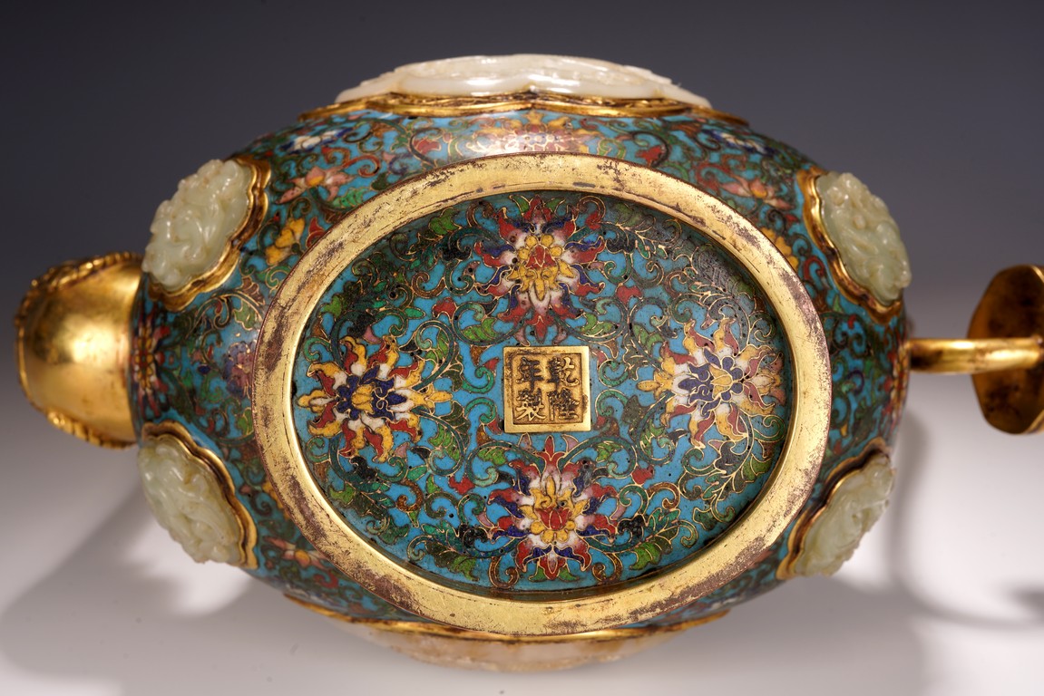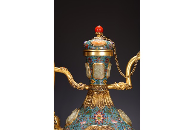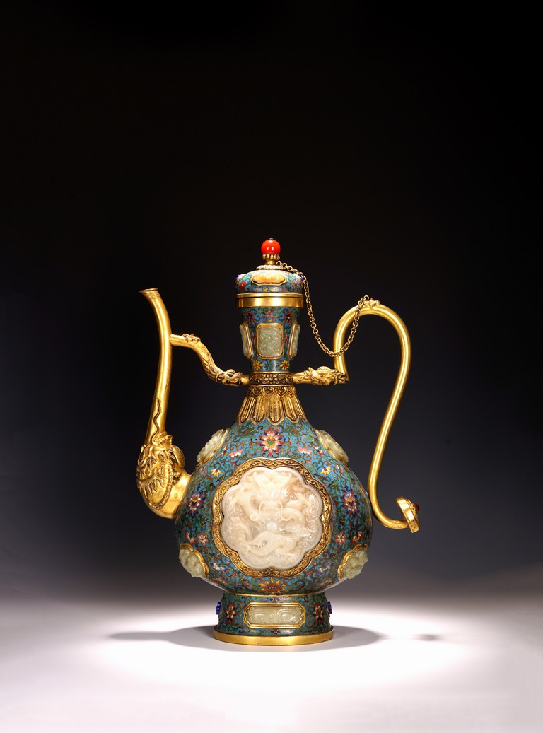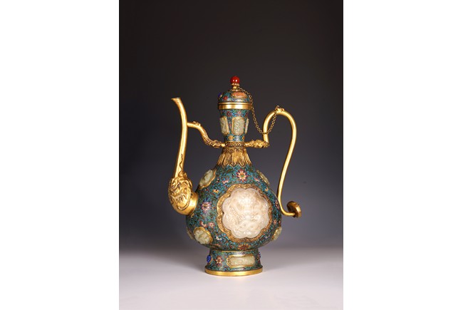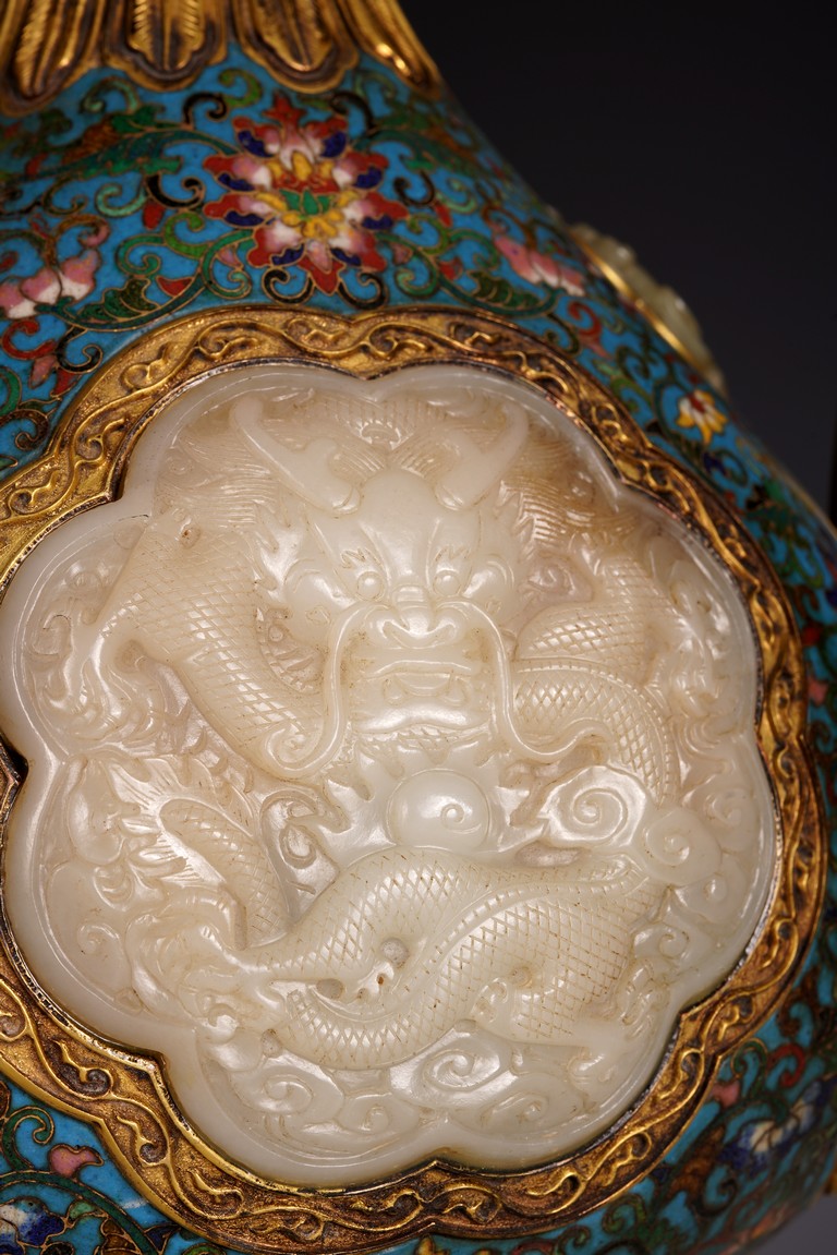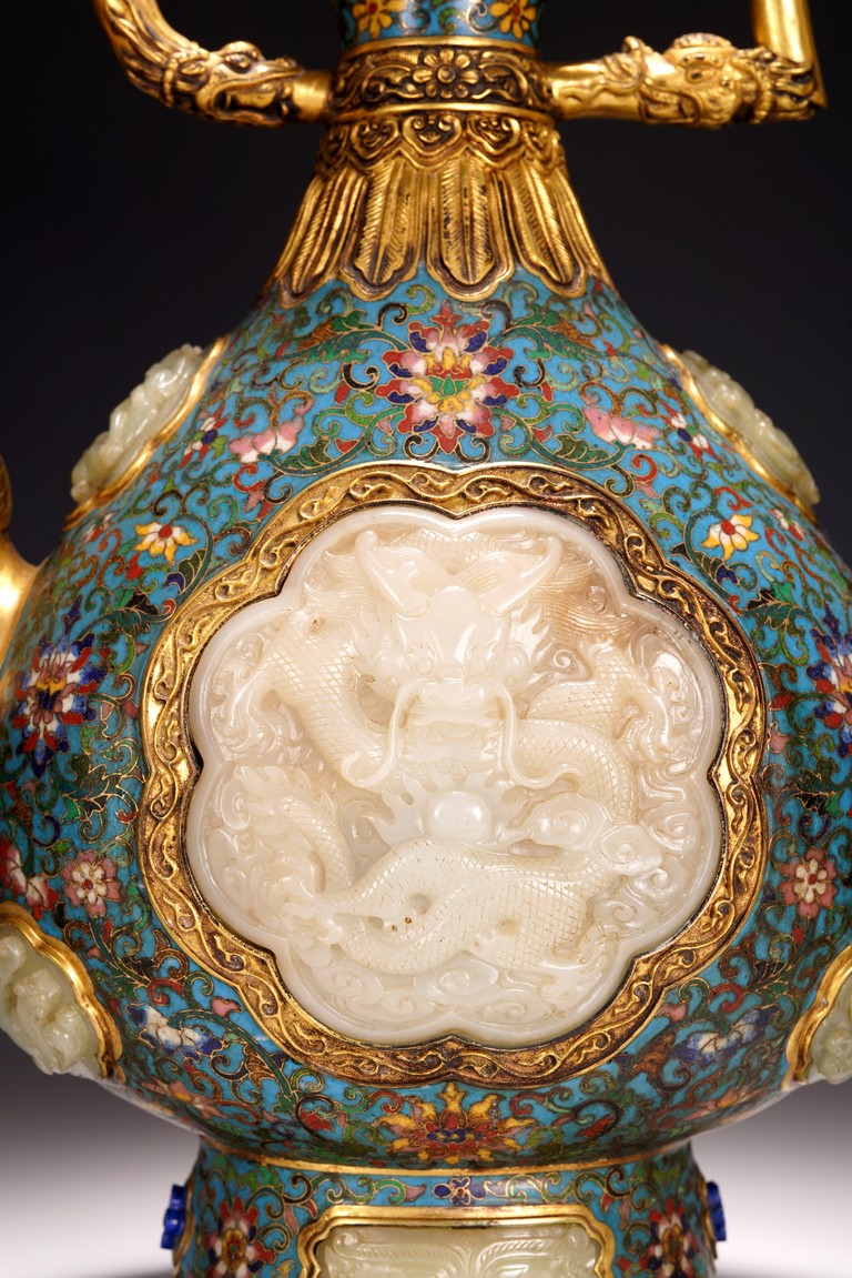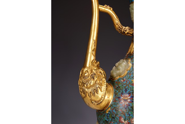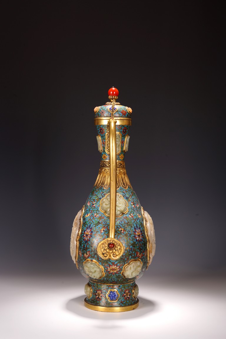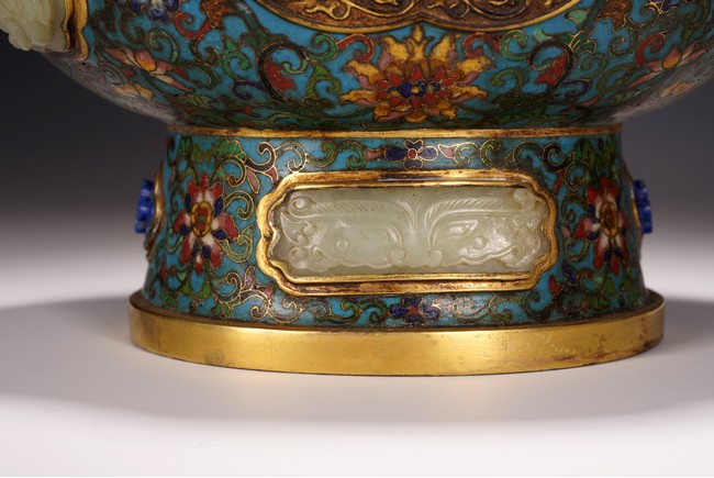 此執壺以精銅為材,整體為西域風格,圓口束頸,鼓腹下垂,圈足,足牆較高,帶獸,細長流,如意彎把。流、把、頸部、口及足以銅鎏金裝飾,器身通體掐絲填琺瑯釉,於藍色地上繪畫纏枝花卉紋,並開光嵌大大小小的玉花片十幾塊,腹部為龍紋海棠形玉花片。做工精湛,器形穩重,華麗大氣,包漿自然,保存完好,宮廷氣息濃厚,值得收藏。 來源:南加州帕薩迪拉家族收藏 Provenance: Property from a private family collection, Pasadena