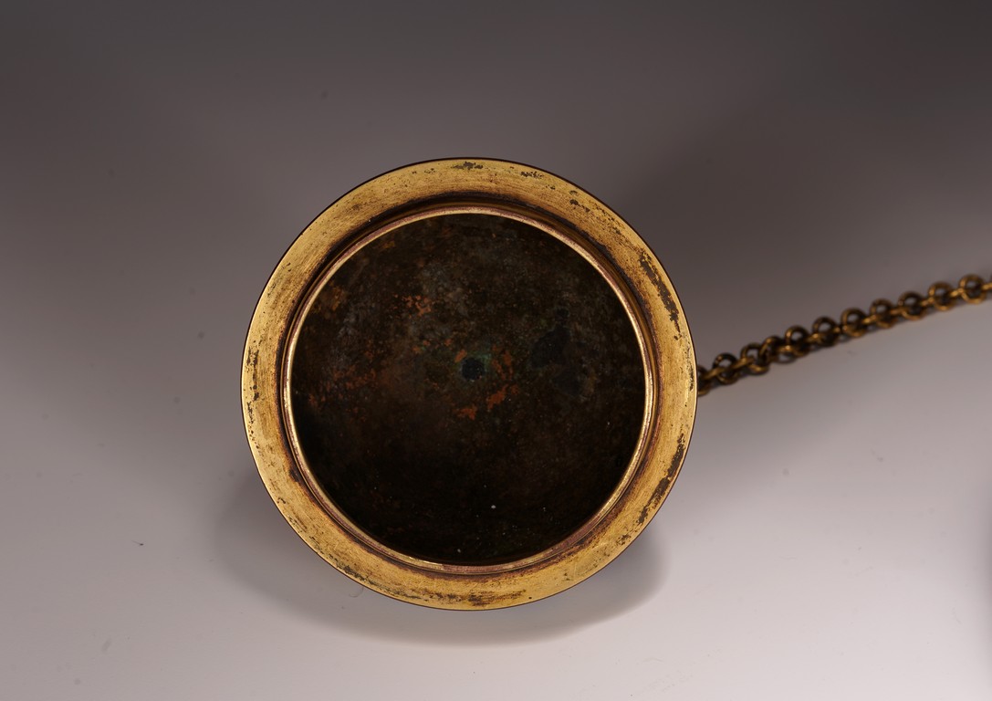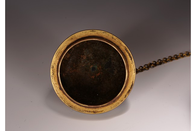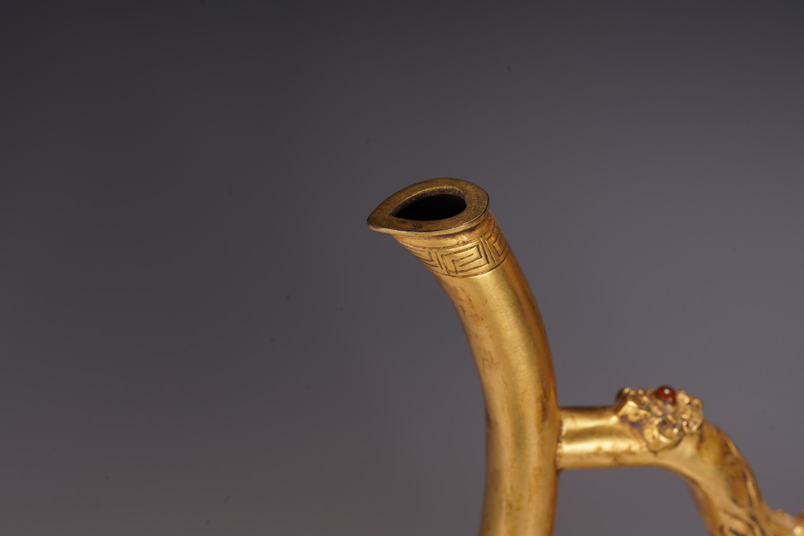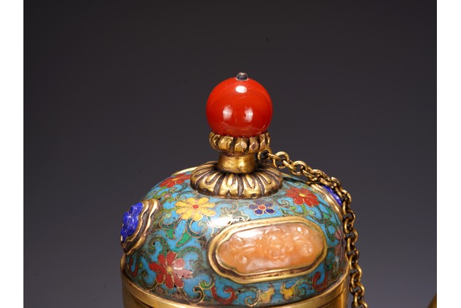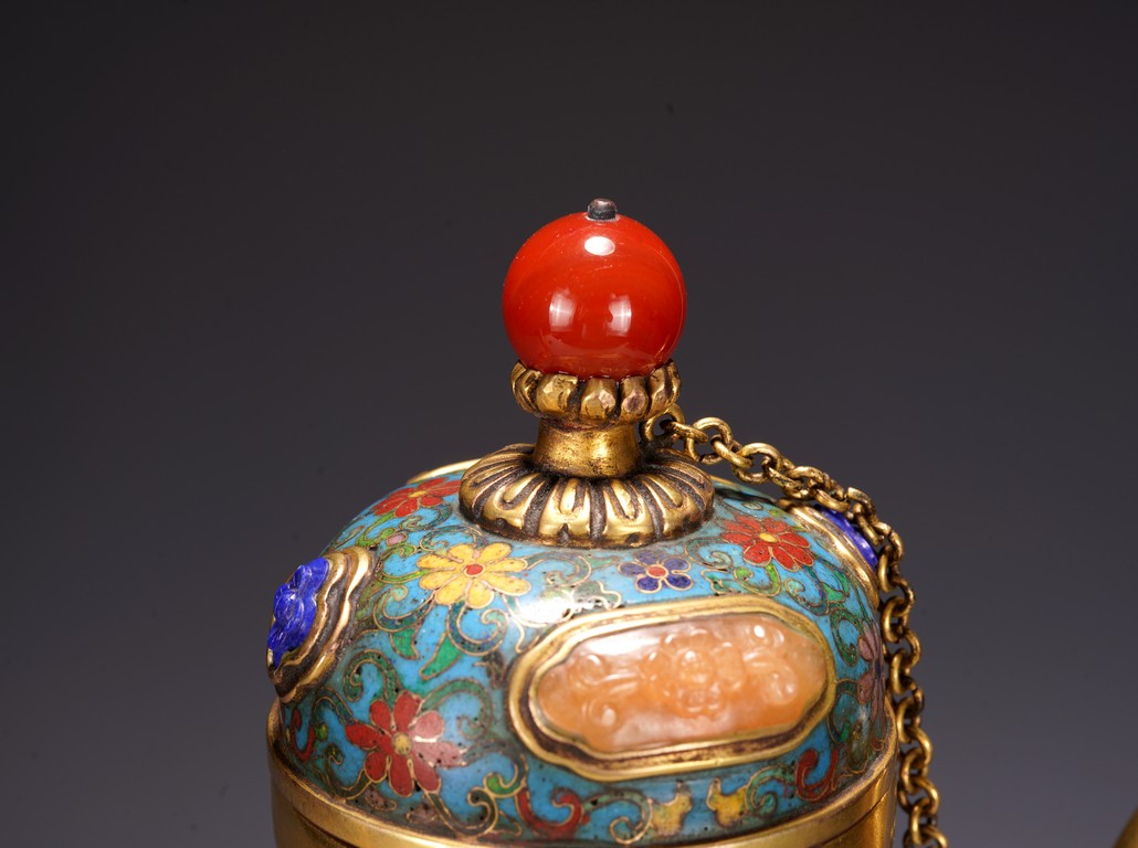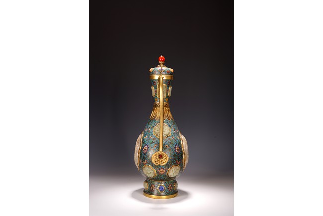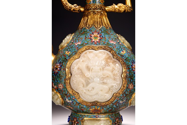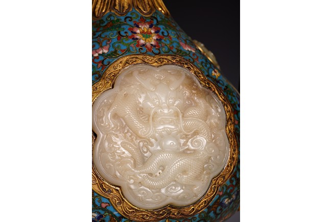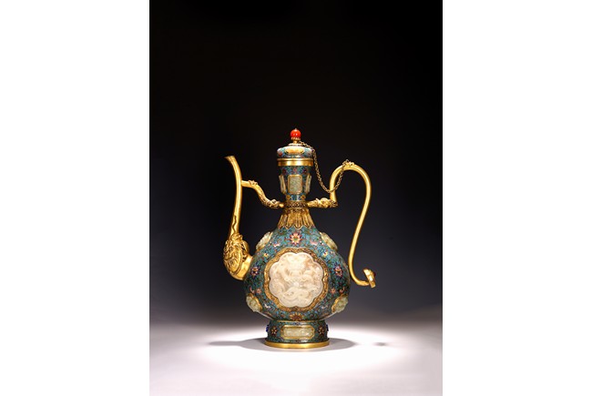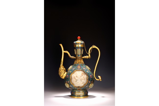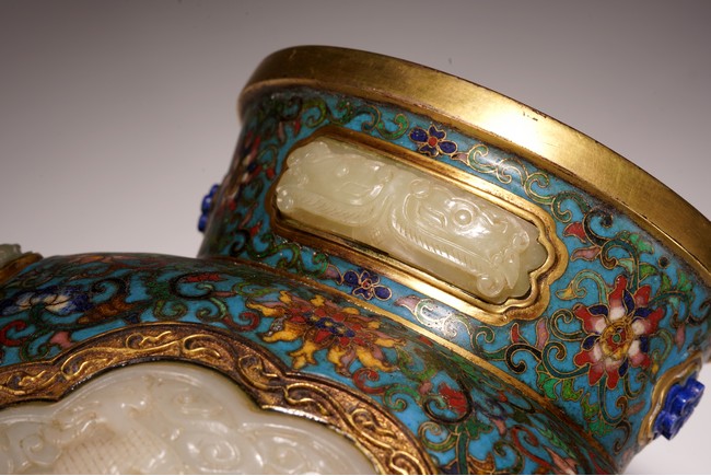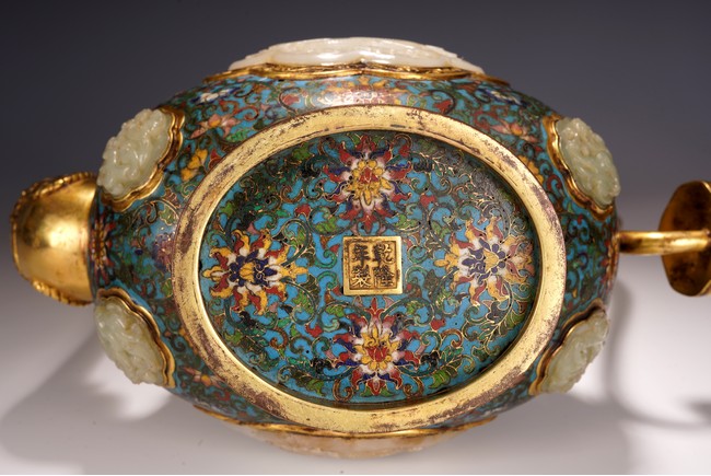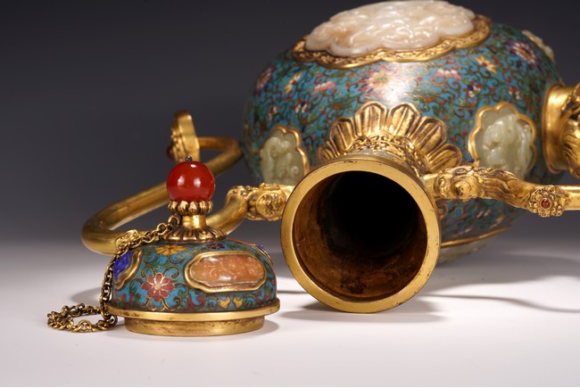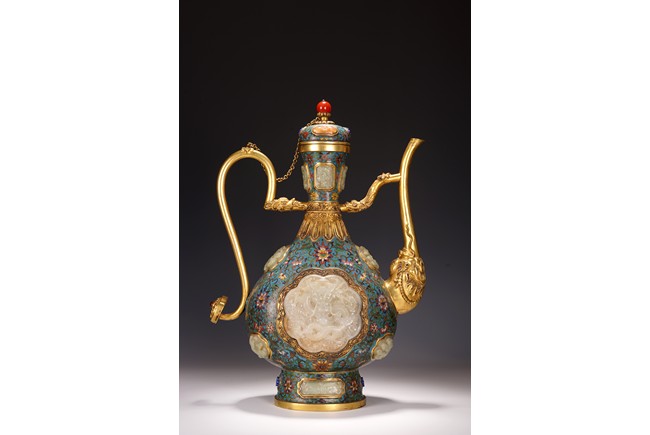 此執壺以精銅為材,整體為西域風格,圓口束頸,鼓腹下垂,圈足,足牆較高,帶獸,細長流,如意彎把。流、把、頸部、口及足以銅鎏金裝飾,器身通體掐絲填琺瑯釉,於藍色地上繪畫纏枝花卉紋,並開光嵌大大小小的玉花片十幾塊,腹部為龍紋海棠形玉花片。做工精湛,器形穩重,華麗大氣,包漿自然,保存完好,宮廷氣息濃厚,值得收藏。 來源:南加州帕薩迪拉家族收藏 Provenance: Property from a private family collection, Pasadena
