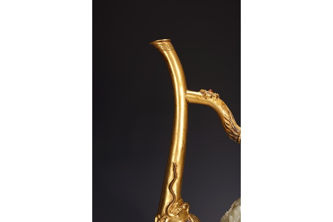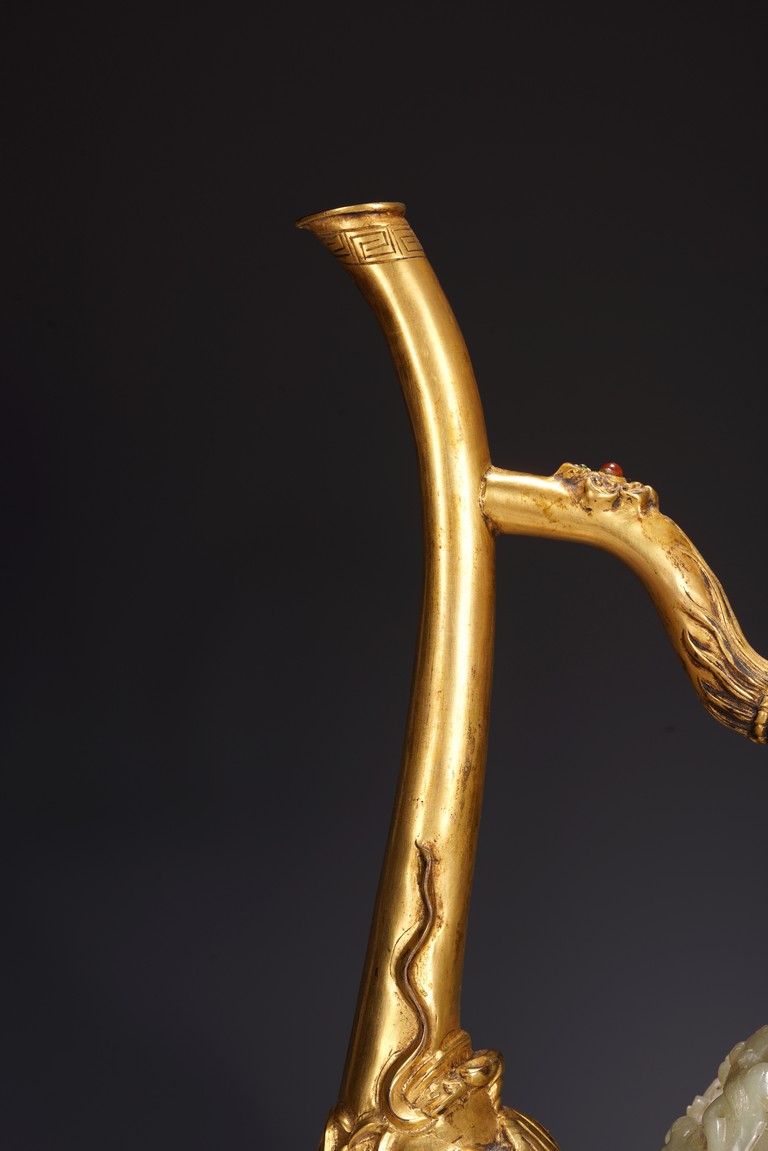 Qing Dynasty Qianlong period. The pear-shaped body rising from a short spreading foot to a tall narrow waisted neck and everted tapering rim, set to one side with an elegant long S-shaped spout issuing from a monster mask and to the other with a similarly shaped handle terminating with a ruyi head, the foot, body, and neck all embellished with carved white jade plaques carved with dragon and mythical beasts, the hardstone embellished cover attached by chain to the handle, the base bearing Qianlong reign mark.