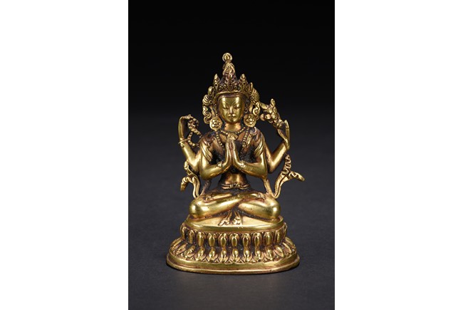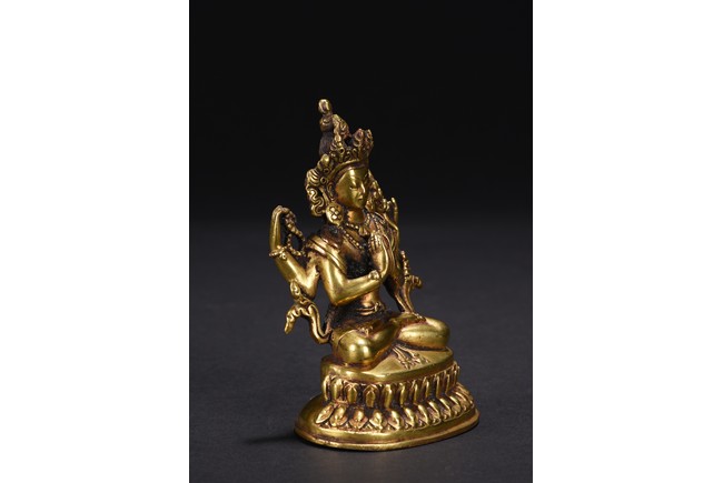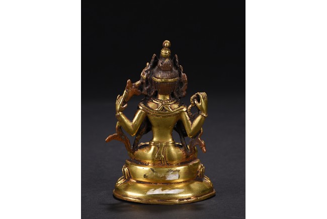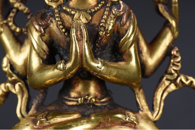 The figure is seated upon a double lotus throne,with primary hands in namaskar mudra and the secondary hands holding a lotus stem,chest adorned with beaded jewelry,the face with benign expression flanked by pendulous ears with circular earrings,topped with pointed crown.