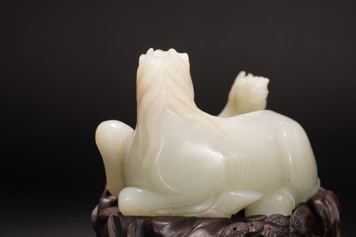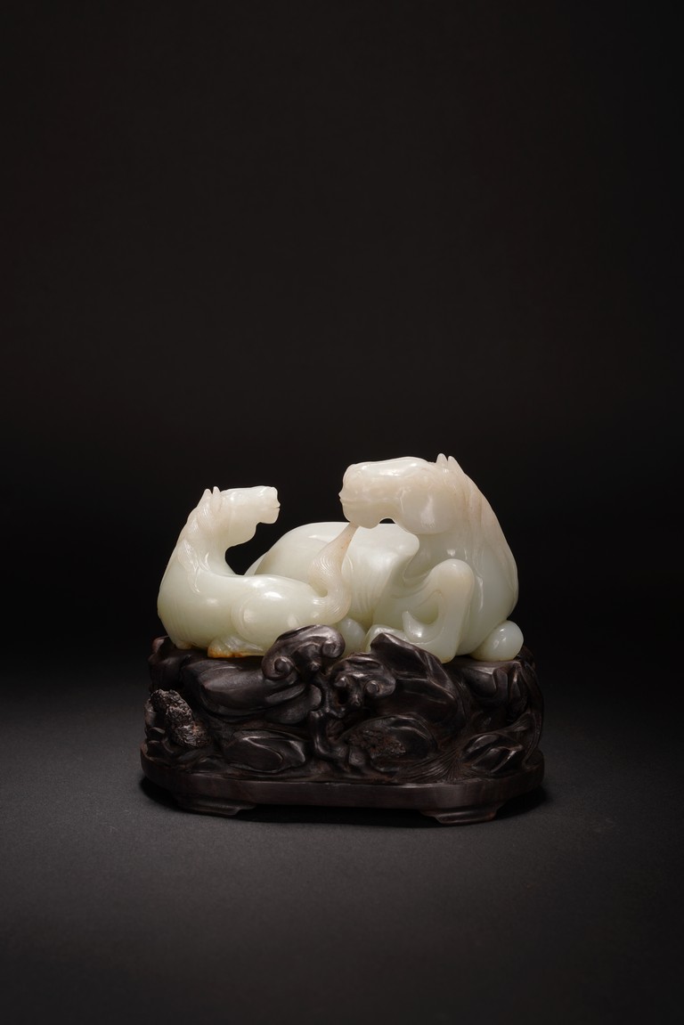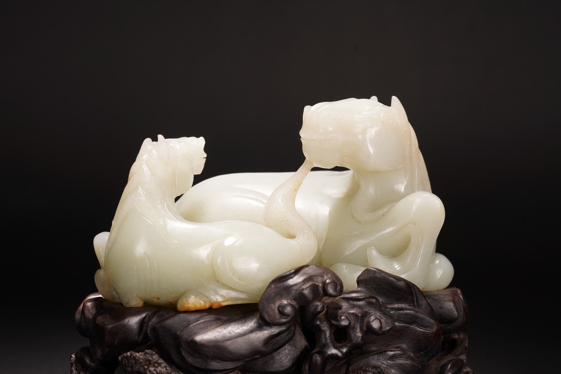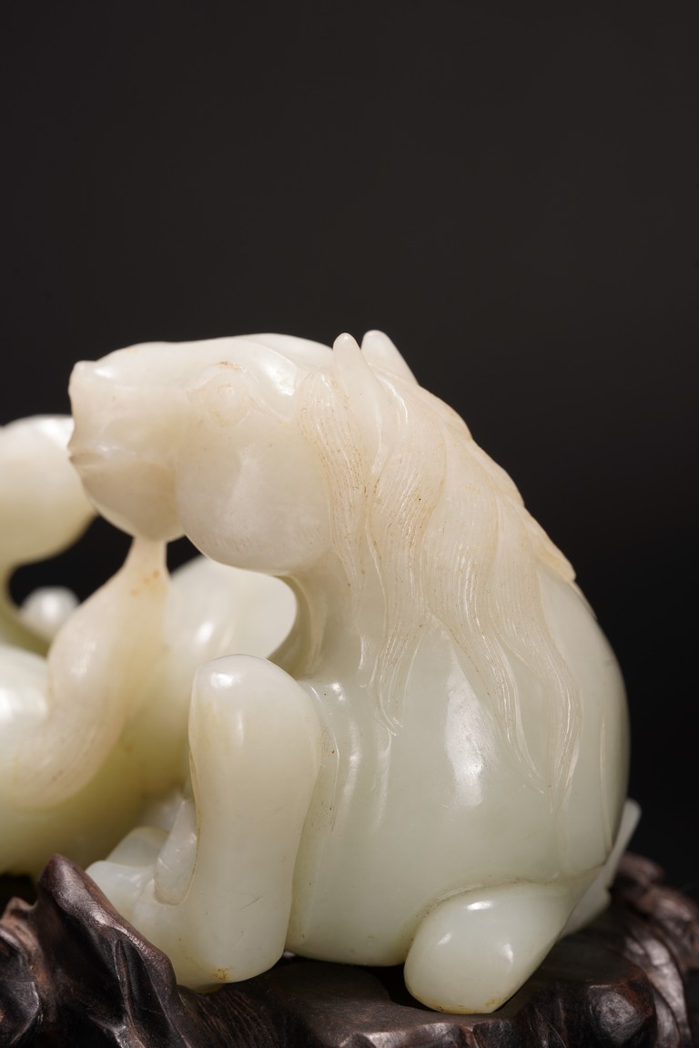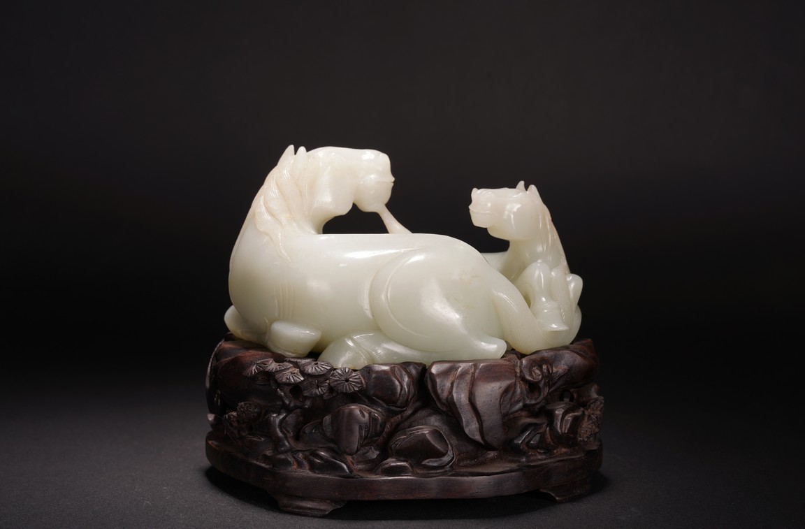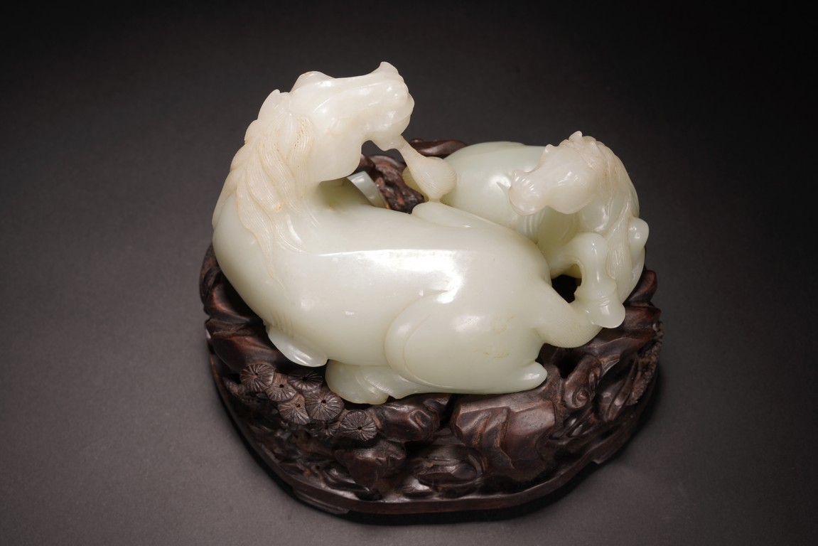 Qing Dynasty period.The jade carved in the round depicting two horses, one with its head turned backwards facing at another lying next to it, each detailed with gentle eyes and well-groomed mane, with the muscular legs tucked underneath bodies, tails detailed with finely incised lines, the stone of smoothly polished white tone with minor russet inclusions underside, supported on wood stand.