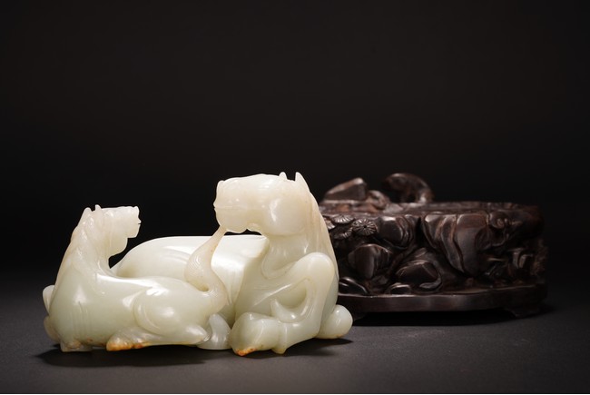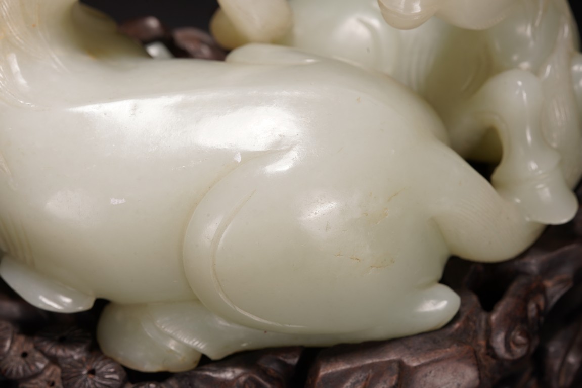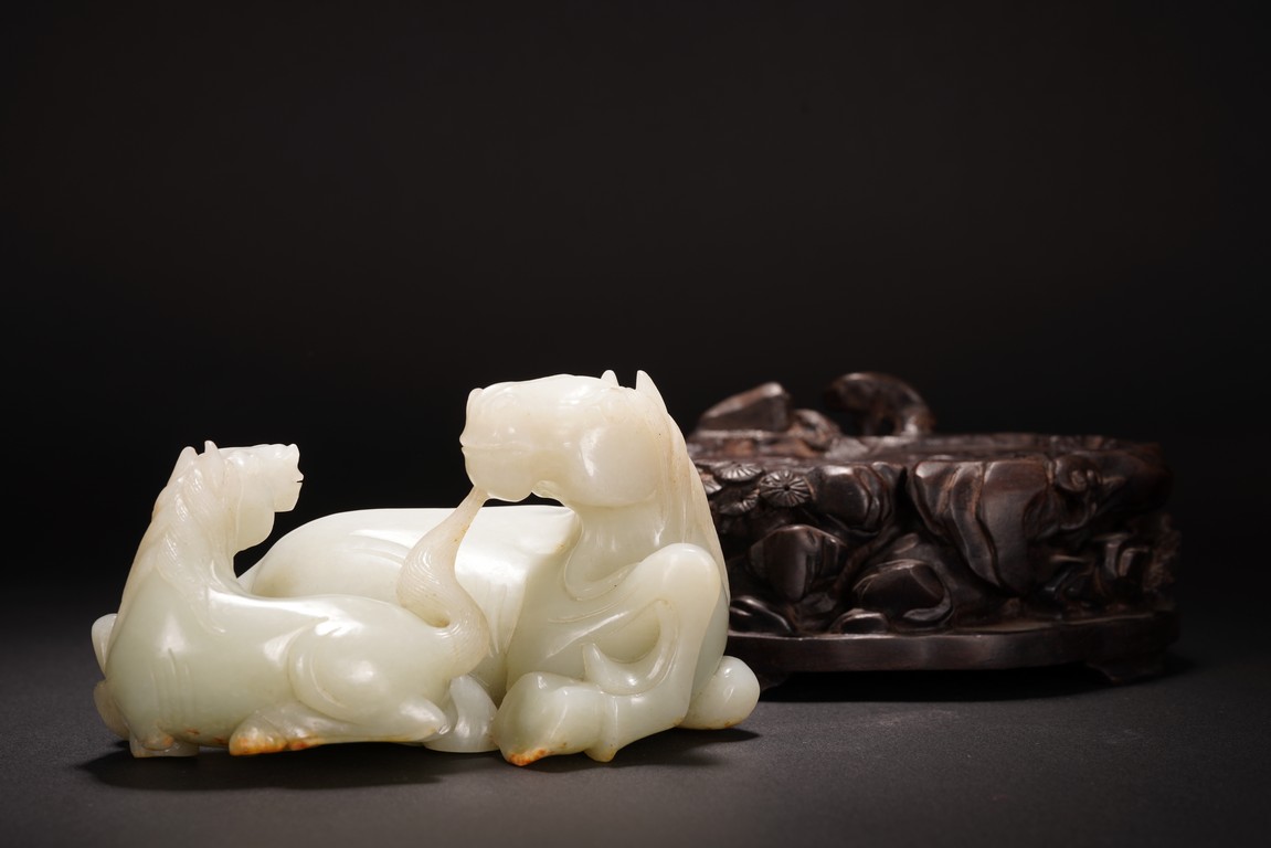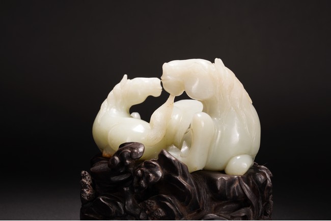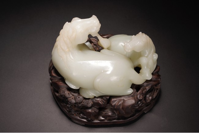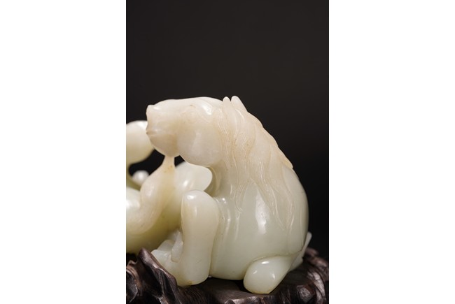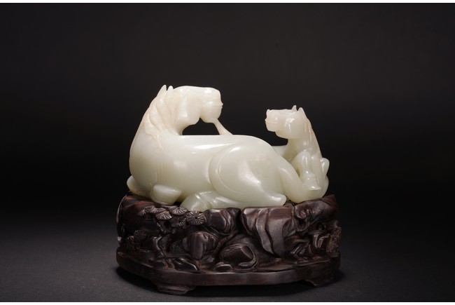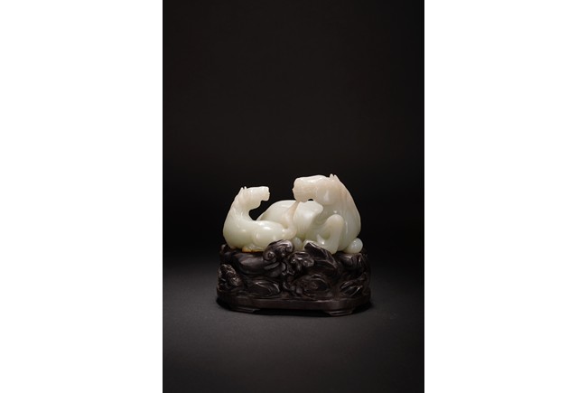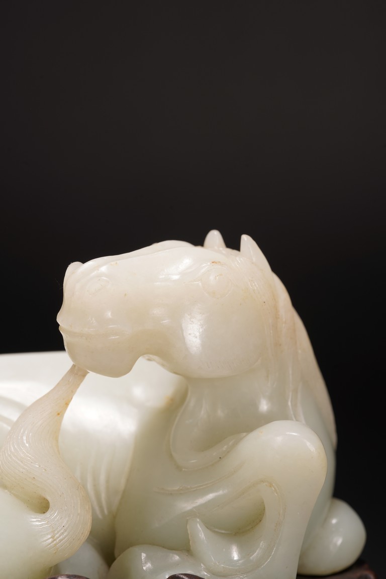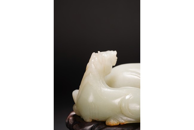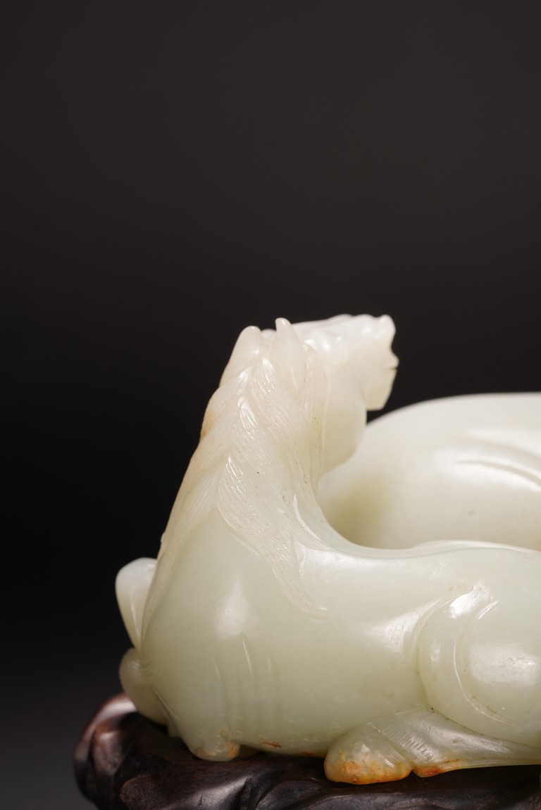 Qing Dynasty period.The jade carved in the round depicting two horses, one with its head turned backwards facing at another lying next to it, each detailed with gentle eyes and well-groomed mane, with the muscular legs tucked underneath bodies, tails detailed with finely incised lines, the stone of smoothly polished white tone with minor russet inclusions underside, supported on wood stand.
