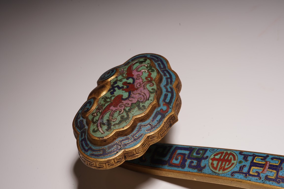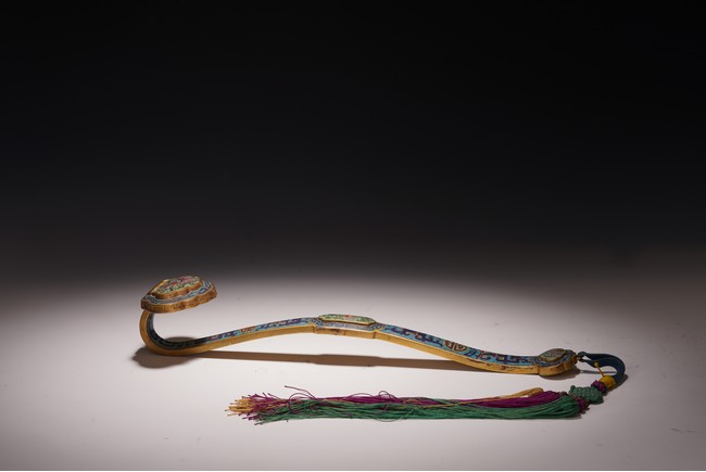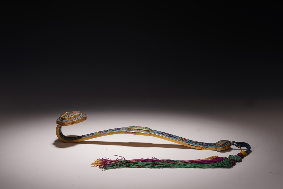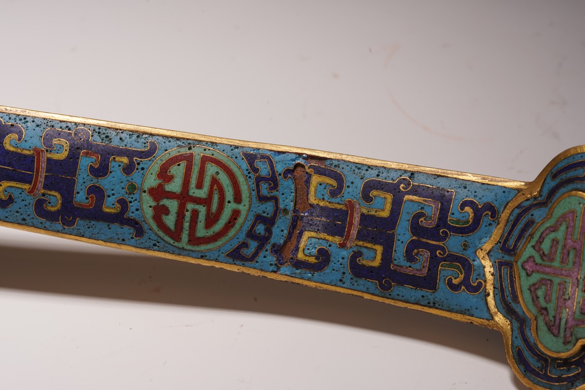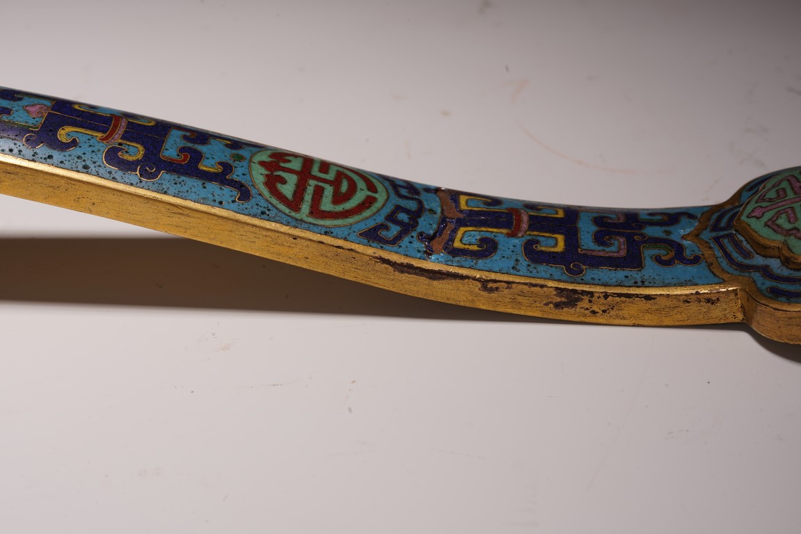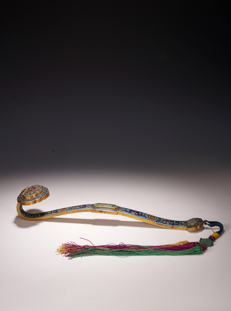 此如意以精銅為材,通體鎏金,掐絲填琺瑯釉,整體呈“S”形,如意頭開光內繪蝙蝠紋飾,柄身中部略寬作方柄,上雕纏枝花紋,尾部開光繪壽字紋。通體裝飾華美精緻,填補嚴謹細緻,器表打磨光滑。製作精良,雍容典雅,寓意吉祥,頗為珍貴。 類似藏品可參考費城美術館(Philadelphia Museum of Art)藏清代掐絲琺瑯如意,編號1909-37
