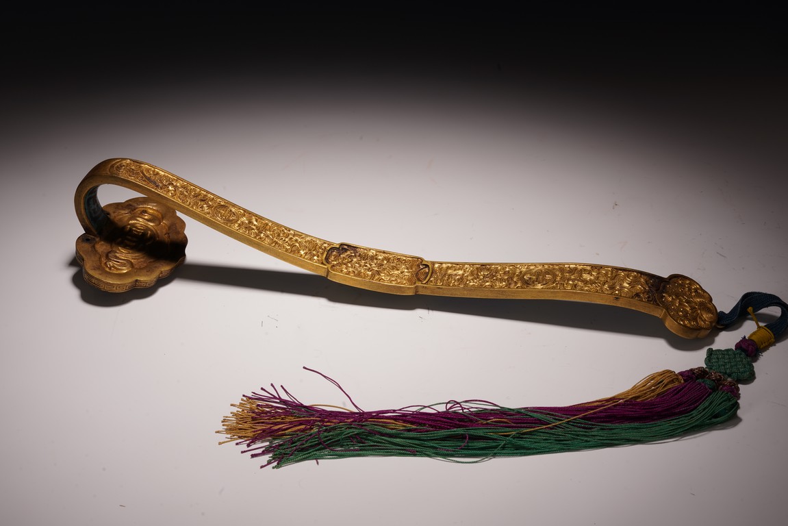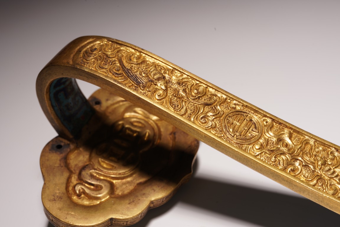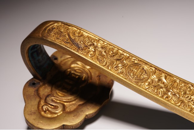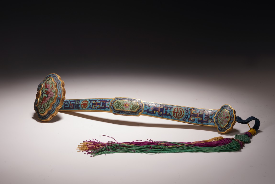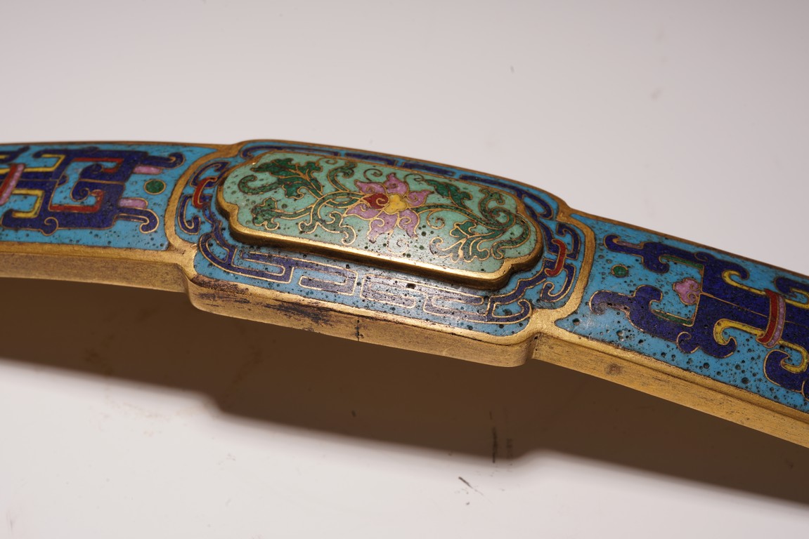 此如意以精銅為材,通體鎏金,掐絲填琺瑯釉,整體呈“S”形,如意頭開光內繪蝙蝠紋飾,柄身中部略寬作方柄,上雕纏枝花紋,尾部開光繪壽字紋。通體裝飾華美精緻,填補嚴謹細緻,器表打磨光滑。製作精良,雍容典雅,寓意吉祥,頗為珍貴。 類似藏品可參考費城美術館(Philadelphia Museum of Art)藏清代掐絲琺瑯如意,編號1909-37
