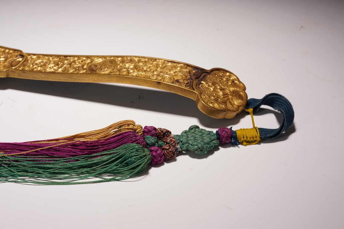 Qing Dynasty period. The head, mid-section, and end each inset with a raised panel enclosing an auspicious bat, a leafy lotus bloom, and a stylized shou character above buddhist symbol, the reverse cast in gilt bronze in relief to depict auspicious bats and shou medallion amidst rising clouds.