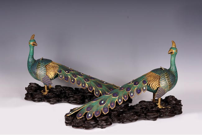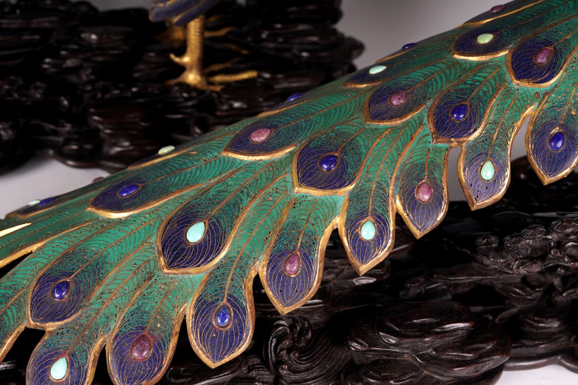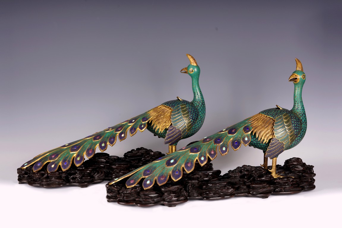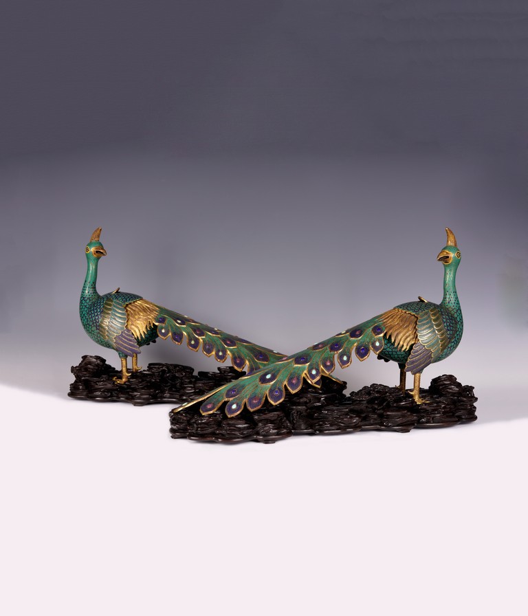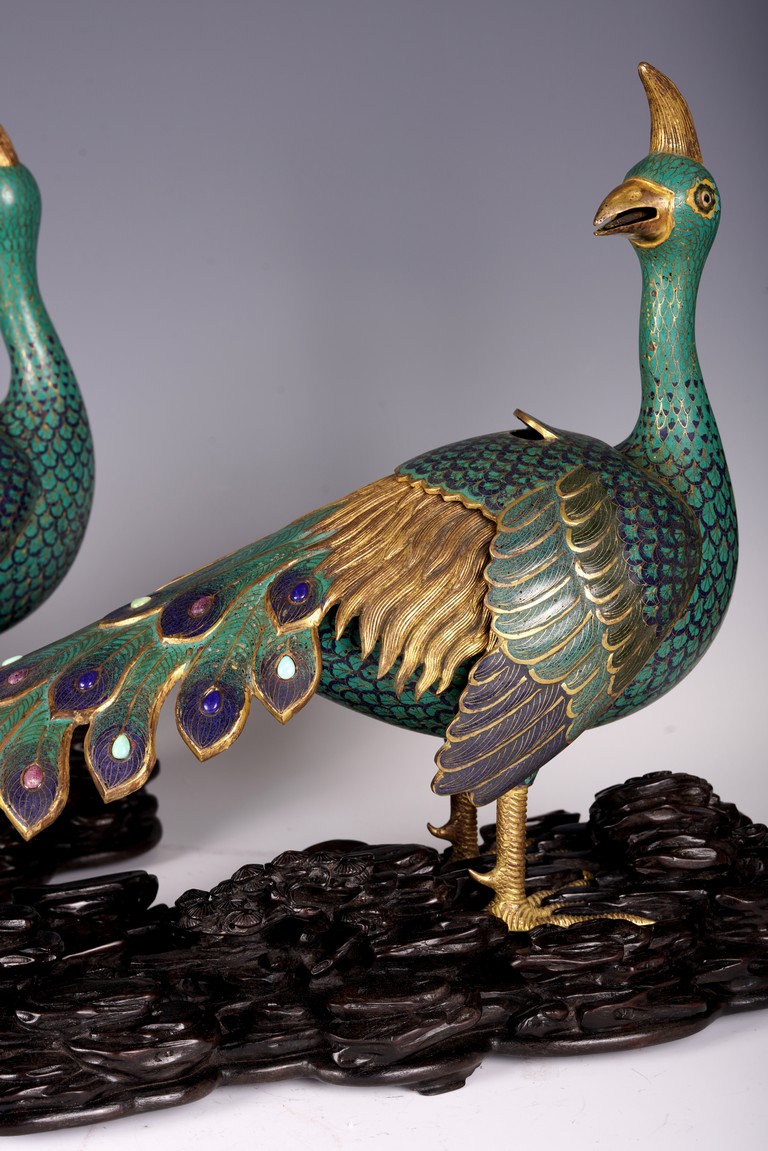 Qing Dynasty period. The peacocks are modelled standing on clawed feet, the heads topped by gilt feathered crests and with pointed gilt beaks turning back looking towards their long trailing tails of gems inlaid overlapping feathers. They are intricately enamelled in shades of turquoise & blue with gilt wire highlights, the back and wings are decorated with colorful feathers forming a detachable cover for the hollow, all supported on hardwood stands.