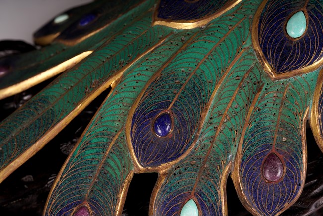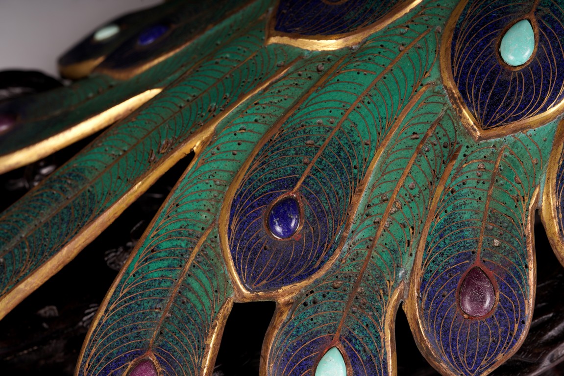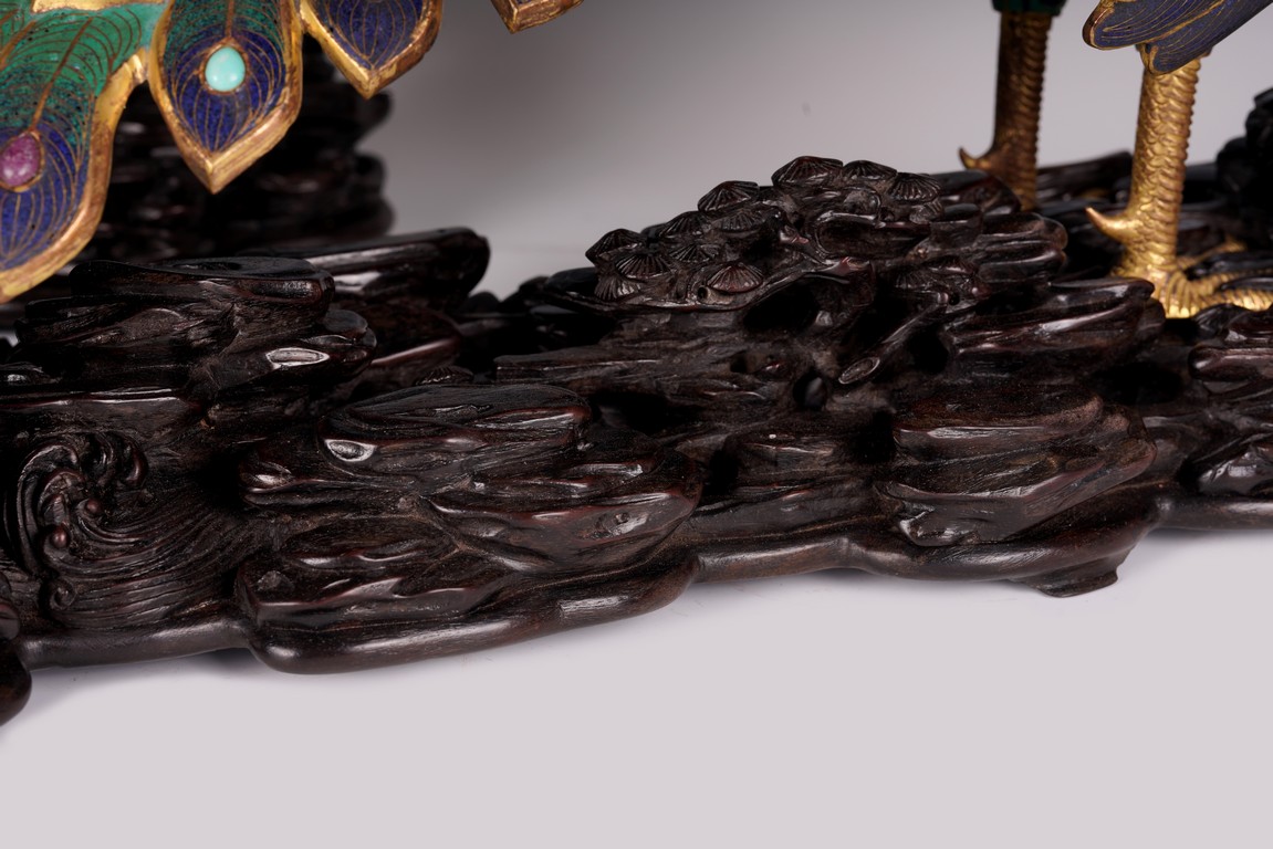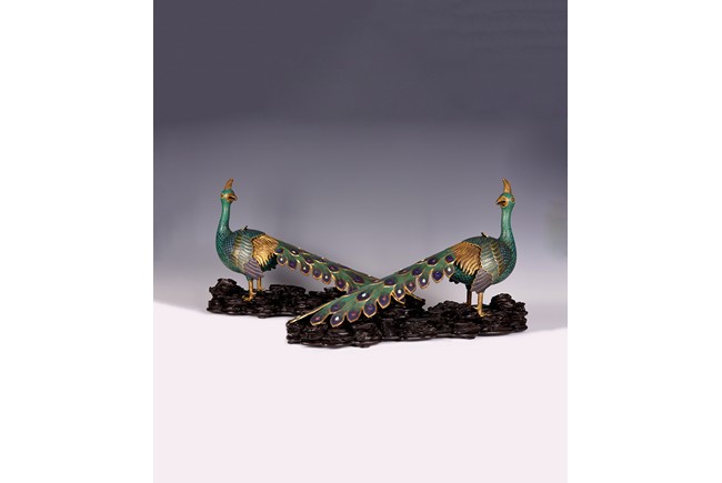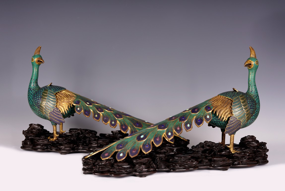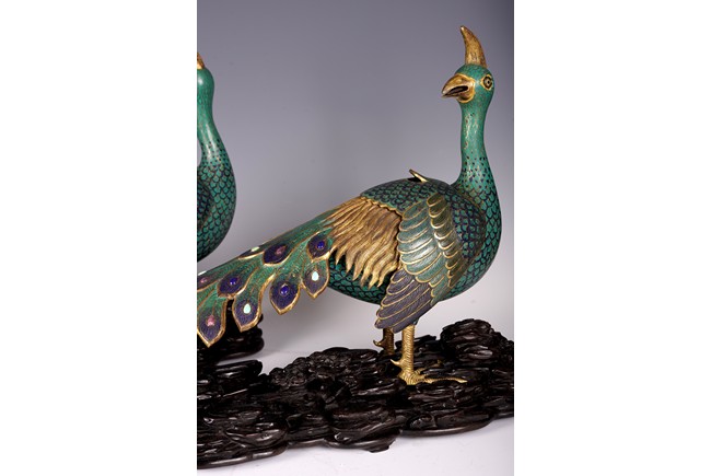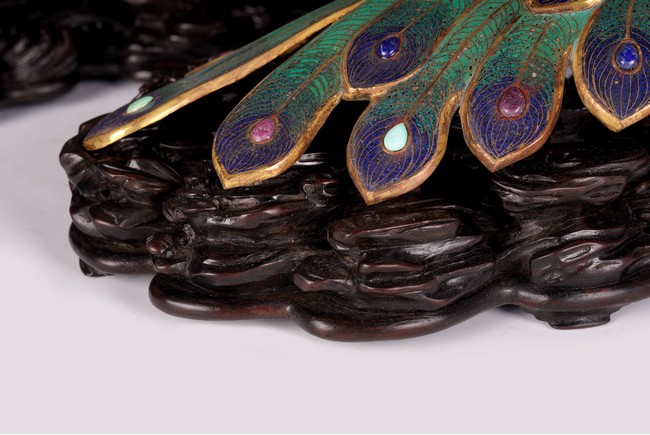 Qing Dynasty period. The peacocks are modelled standing on clawed feet, the heads topped by gilt feathered crests and with pointed gilt beaks turning back looking towards their long trailing tails of gems inlaid overlapping feathers. They are intricately enamelled in shades of turquoise & blue with gilt wire highlights, the back and wings are decorated with colorful feathers forming a detachable cover for the hollow, all supported on hardwood stands.