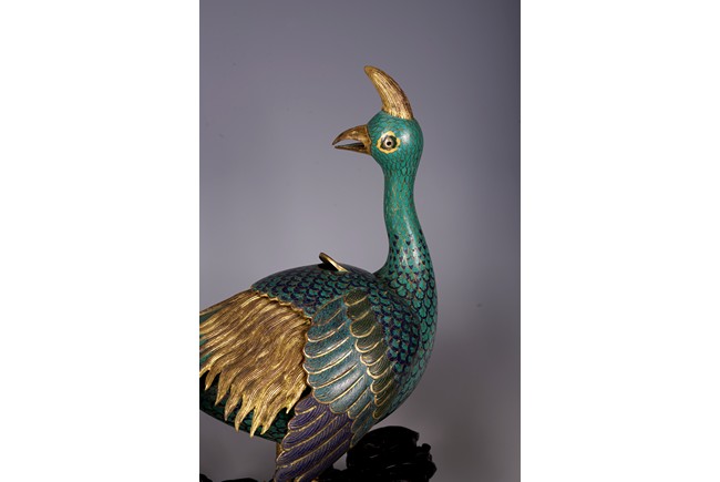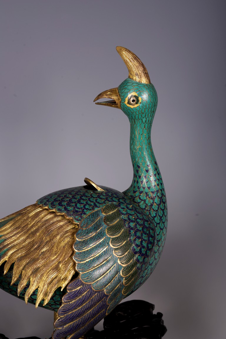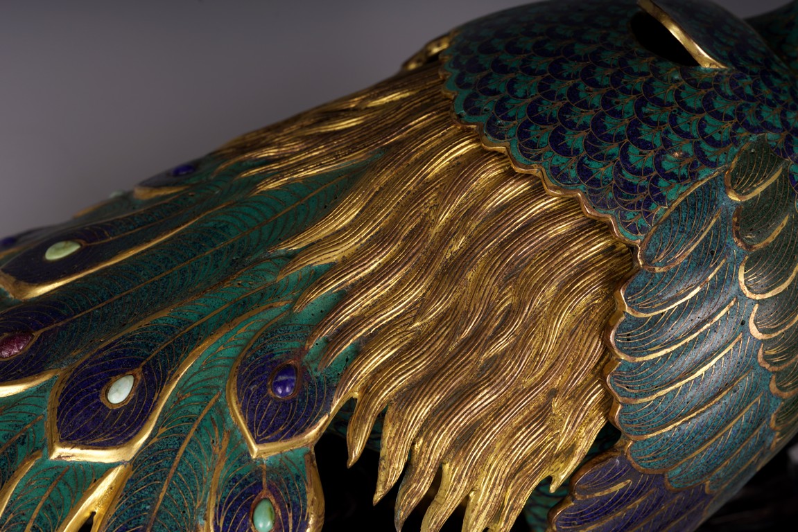 此對鳳凰為銅胎上掐絲填琺瑯嵌寶工藝,束鳳凰造型,後掐絲填墨、黃、藍、紅、綠色釉,其尾部每支翎羽分嵌紅寶、青金石、松石、翡翠等寶石。圓首尖喙,細頸,身軀修長,長層自然擺地。制用精美,規矩大氣,生動傳神,十分罕見,為值得收藏的案上精緻擺件。