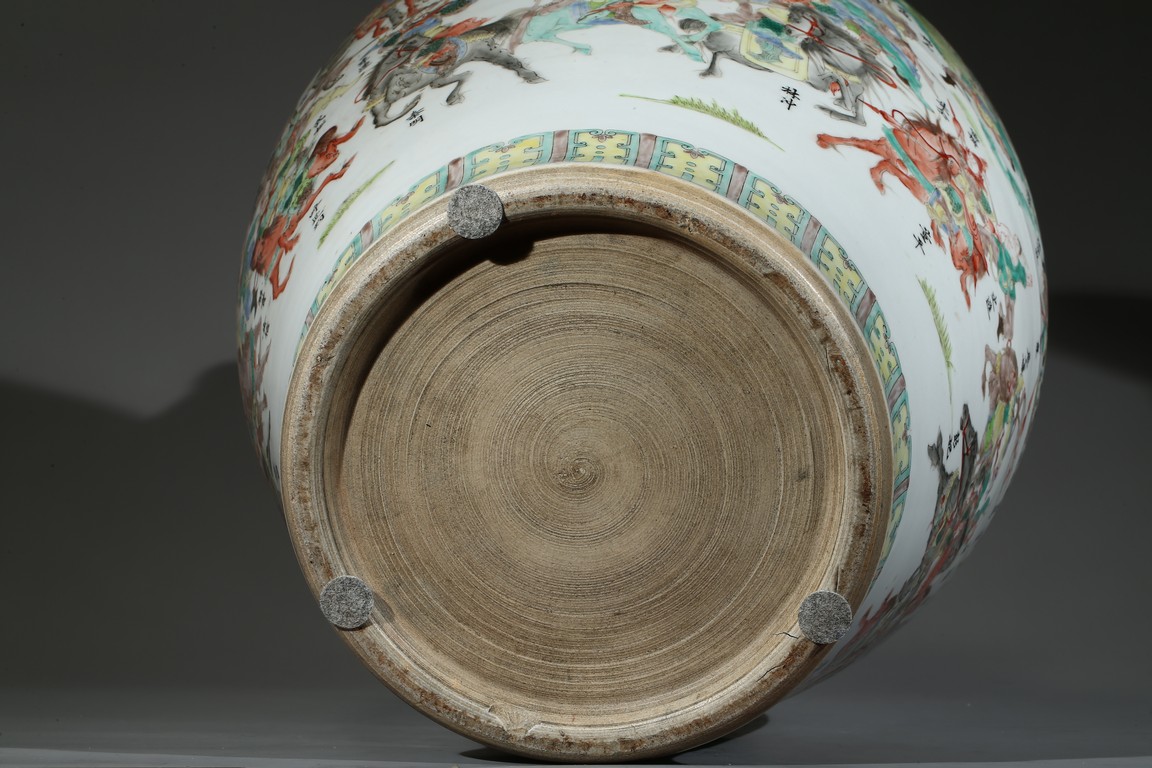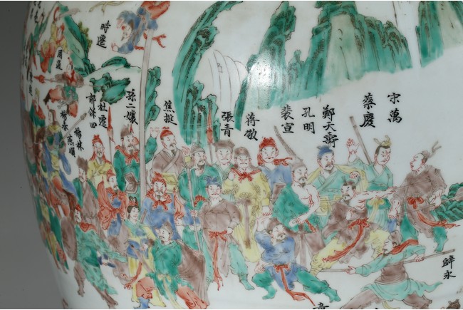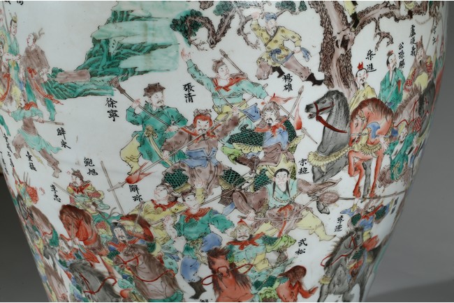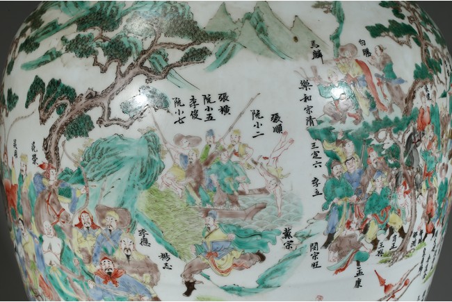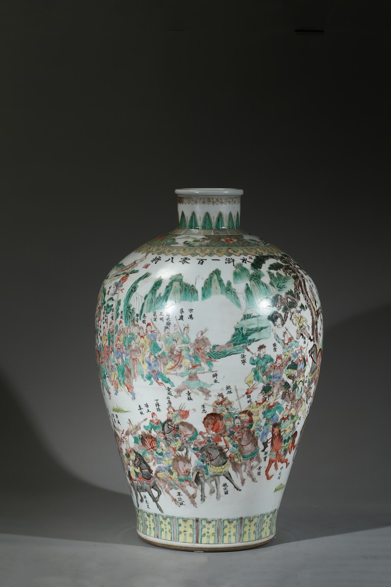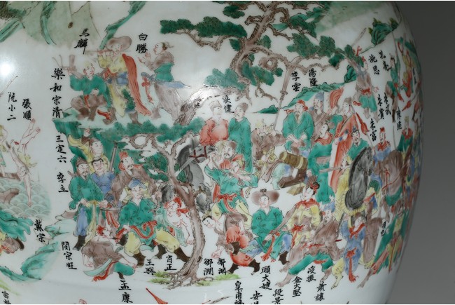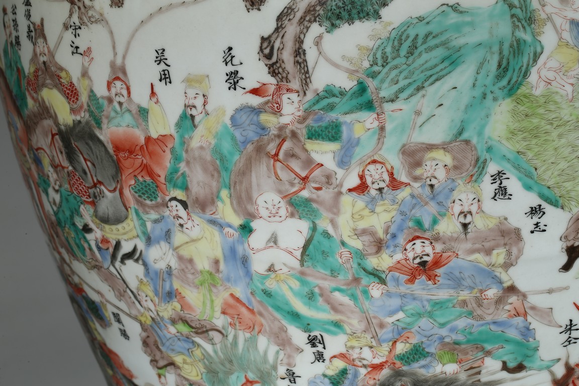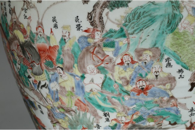 直口,鼓腹,腹部下收,圈足。全器以五彩通體繪《水滸傳》一百零八將作為主題裝飾,佈局高低錯落有致,繪畫精細,人物神態生動,每人都具有不同表情,既有草莽率真之氣,又有王霸貴冑之風,既顯閒適雅緻之韻,又呈神怪詭異之影,人物不同,風格不同,表情不同,個個呼之欲出,栩栩如生,纖細柔美,精緻入微,勾勒奇巧。從人物造型,筆墨結構,到神情氣韻,無不表現了工匠對人物的刻苦用心,其間更是穿插以飛雲圓日,山石草木。整體器形規整,體型巨大,色彩鮮豔,實屬難得。