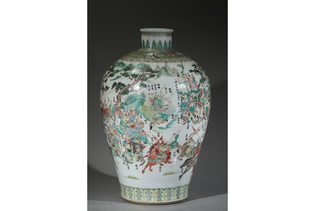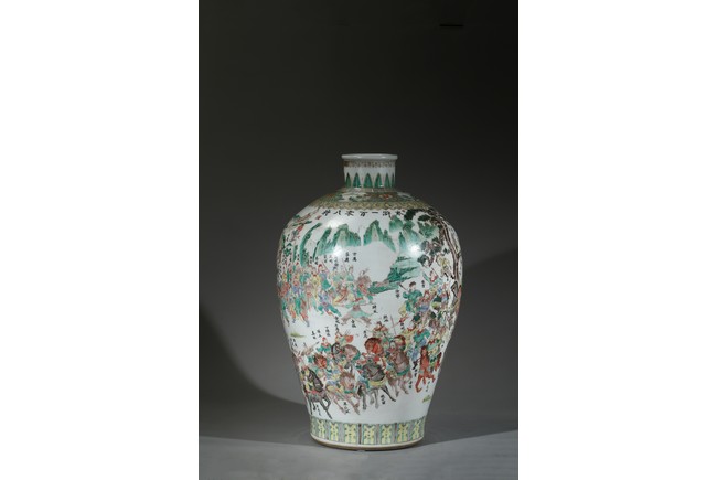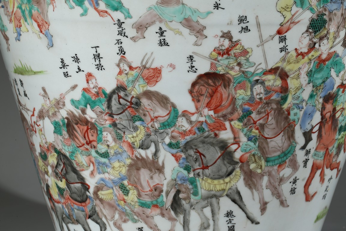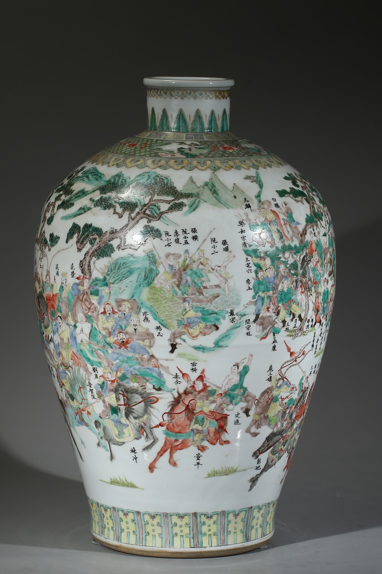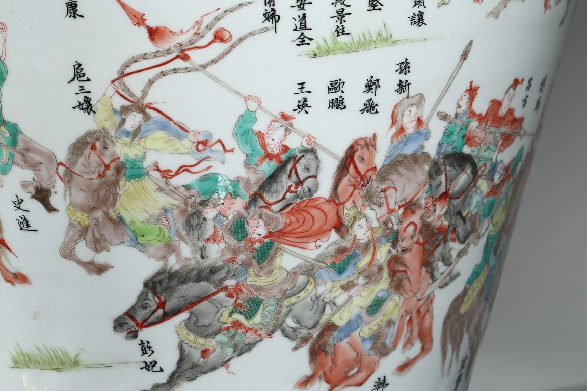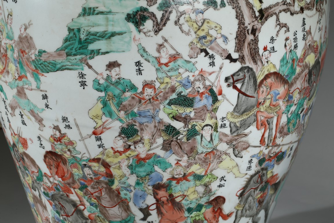 Qing Dynasty period. The vase is boldly decorated with a continuous scene depicting 108 heroes from the classical Chinese novel 'The Water Margin', each with name above, all set in a mountain landscape setting, below a band of ruyi lappets and shaped landscape panels around the neck.