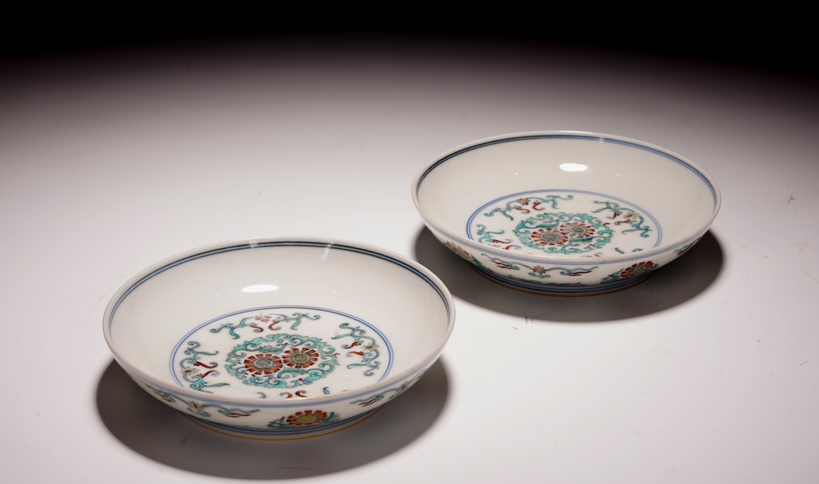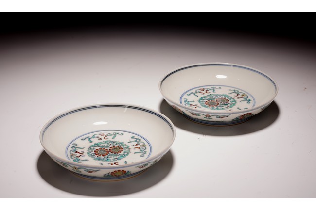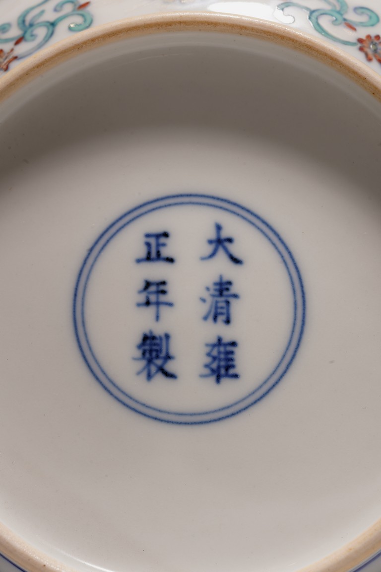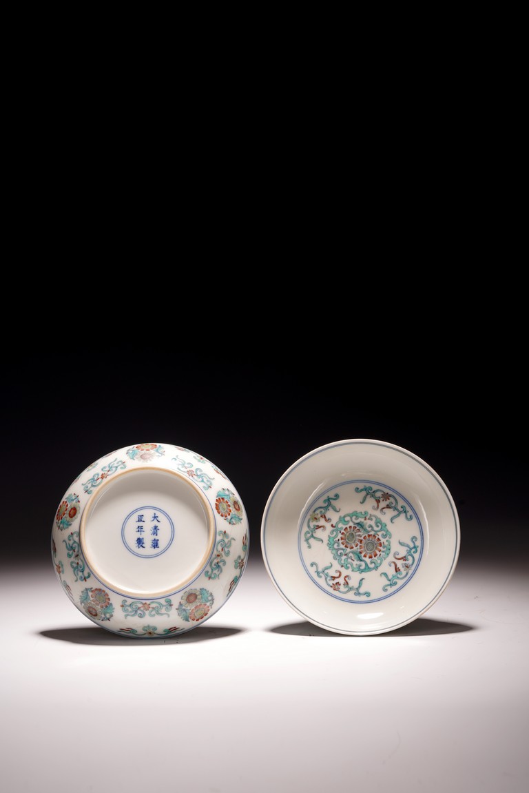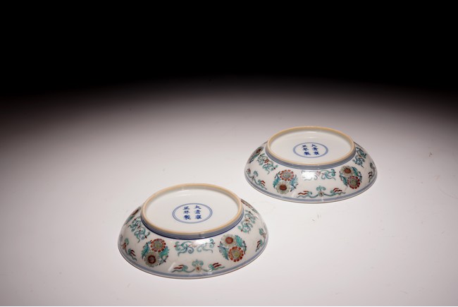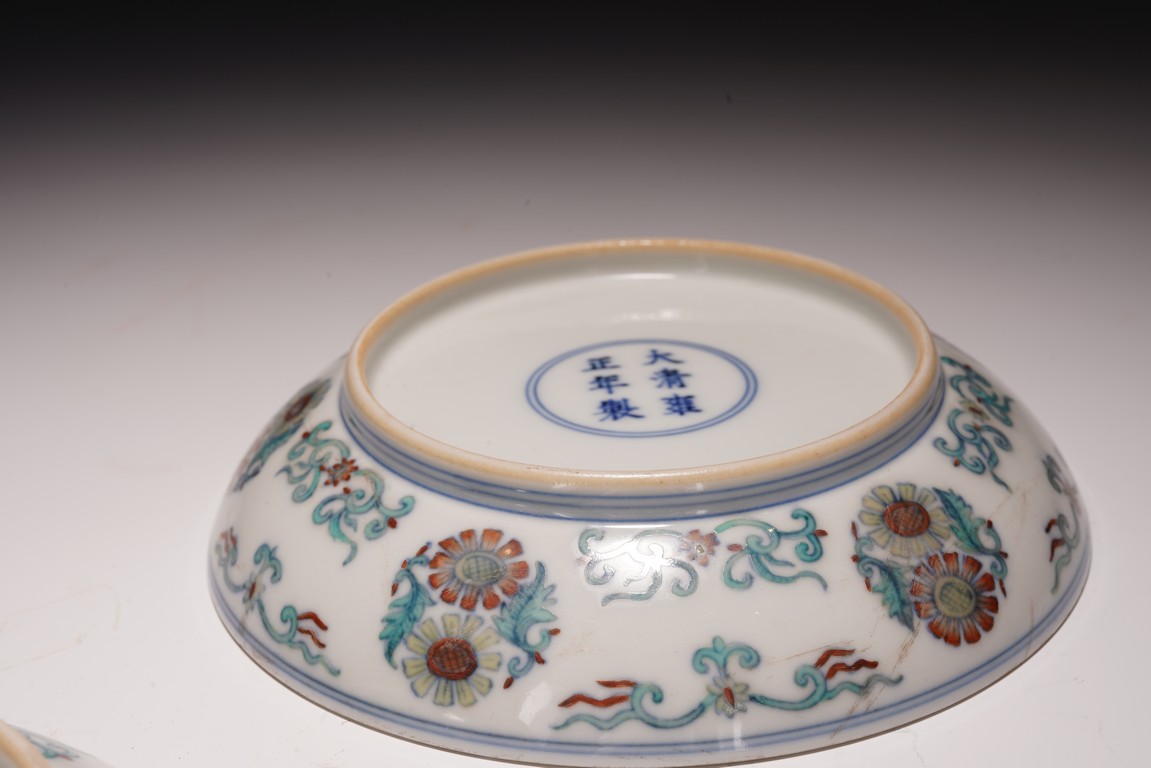 此對盤敞口、淺弧腹、圈足。器型端正,胎質細膩,釉色肥潤,盤心及外壁以鬥彩繪團花似錦紋飾,以青花細勾邊線,填以淺淡紅、綠、黃等彩,嬌豔多研,更顯秀麗清雅。底部落“大清雍正年制”款。整體青花勾勒清晰,填彩精細,佈局疏朗合理,畫工精緻流暢,色澤紛繁亮麗,典雅莊重。