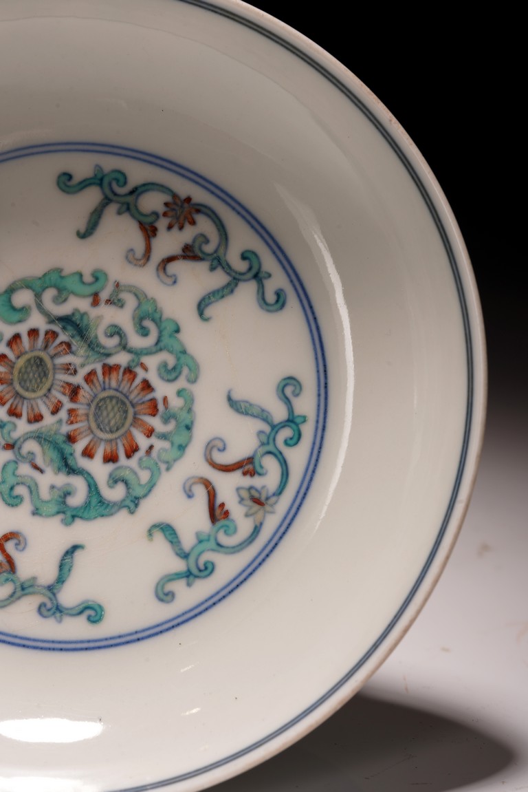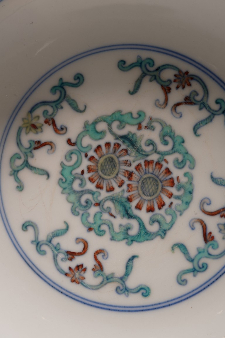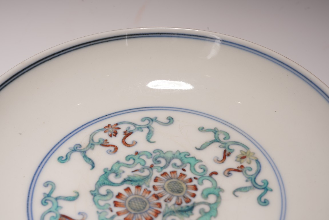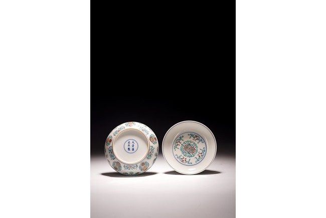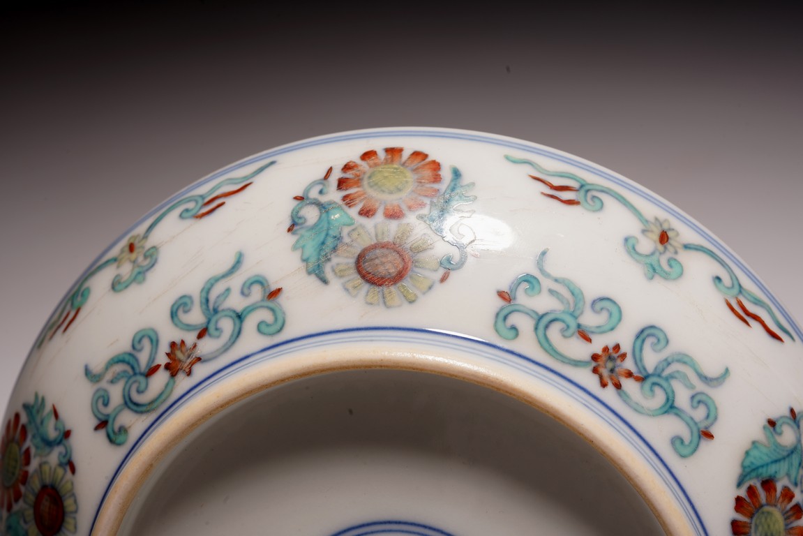 此對盤敞口、淺弧腹、圈足。器型端正,胎質細膩,釉色肥潤,盤心及外壁以鬥彩繪團花似錦紋飾,以青花細勾邊線,填以淺淡紅、綠、黃等彩,嬌豔多研,更顯秀麗清雅。底部落“大清雍正年制”款。整體青花勾勒清晰,填彩精細,佈局疏朗合理,畫工精緻流暢,色澤紛繁亮麗,典雅莊重。