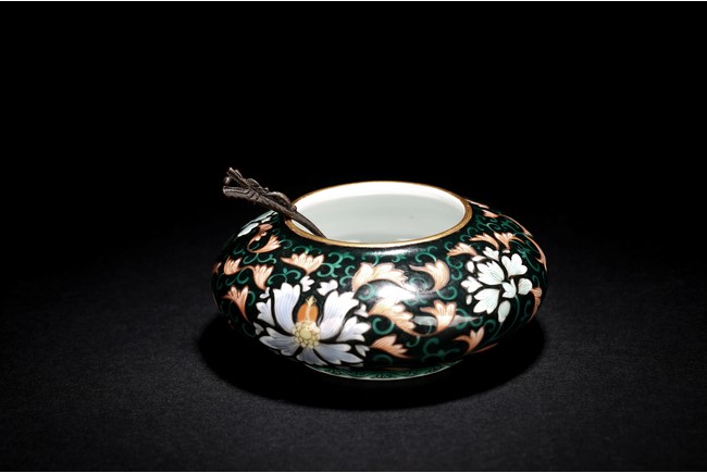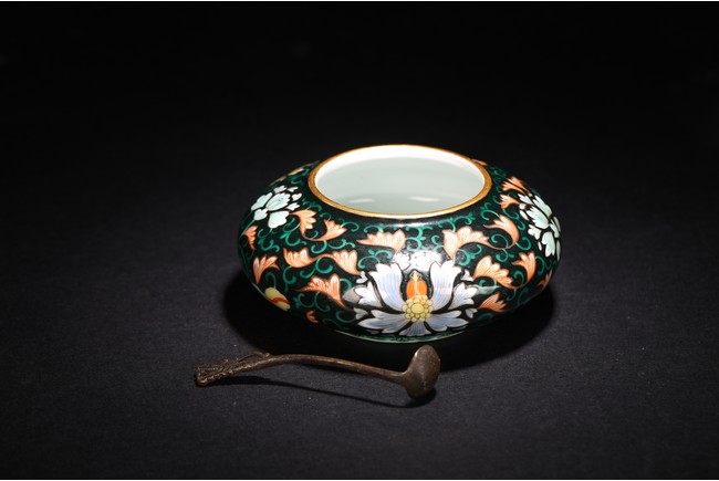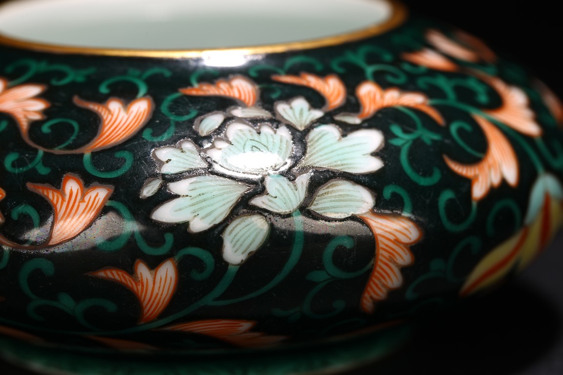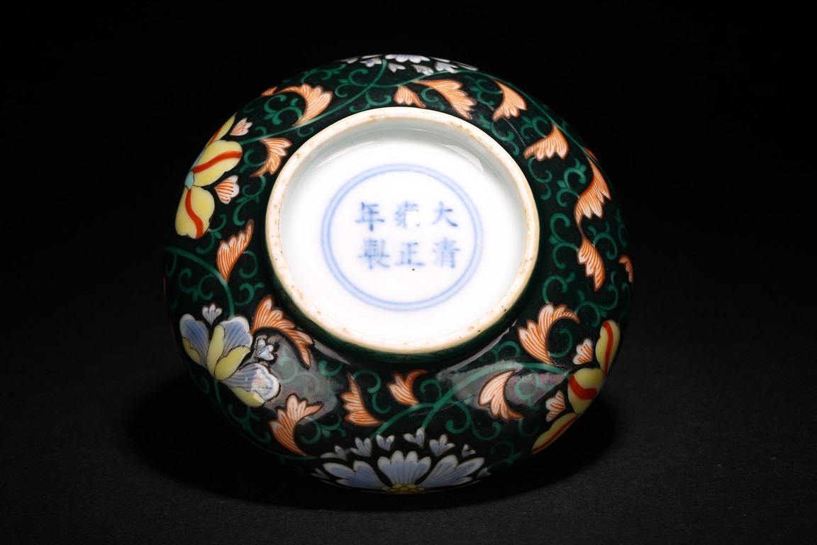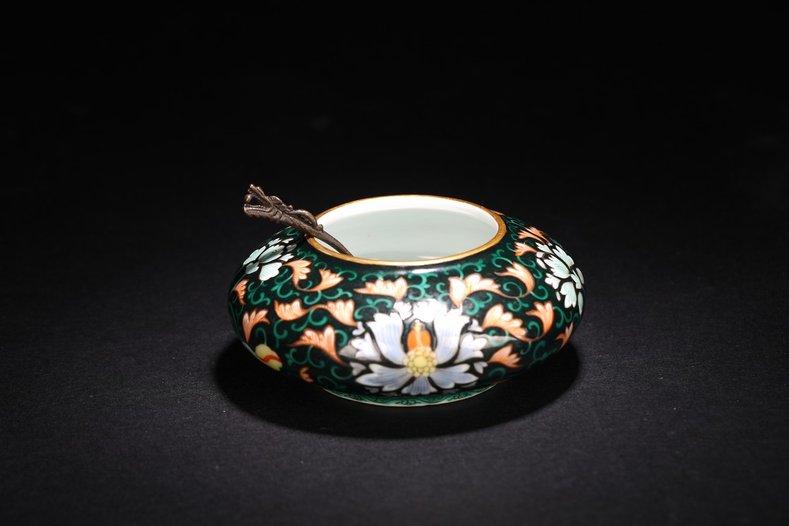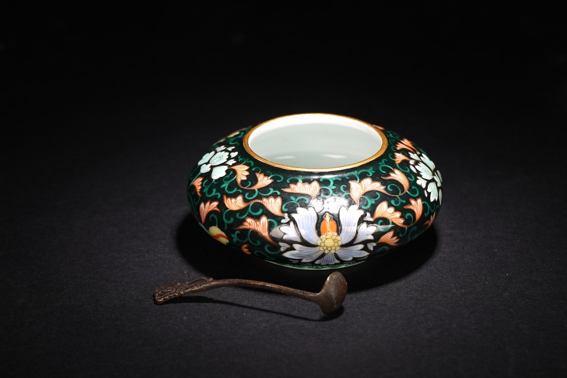 此水盂圓口、溜肩、鼓腹、圈足外撇。外壁以墨色為地,上施紅、綠、黃等色形成素三彩纏枝花卉紋飾,素雅美觀,繪製精細。器型小巧,周正端莊,胎質堅實細膩,釉面潔淨,文房實用佳器。底以青花書“大清雍正年制”六字三行楷書雙圈款。