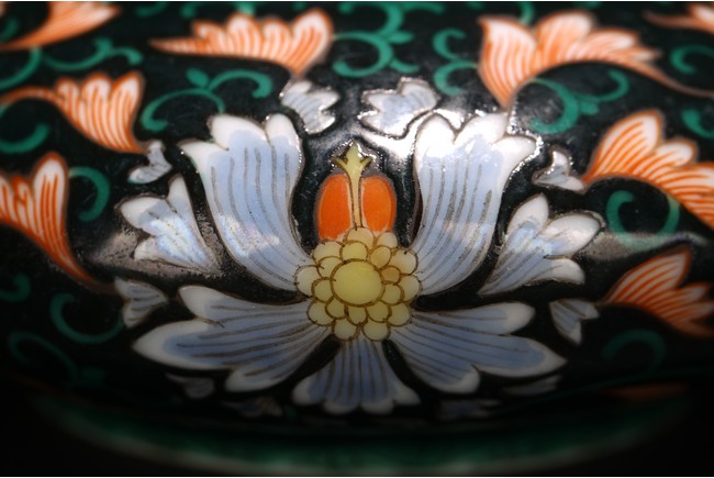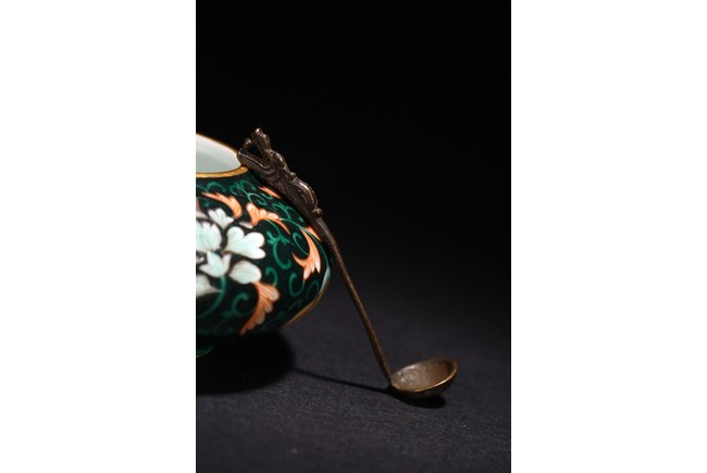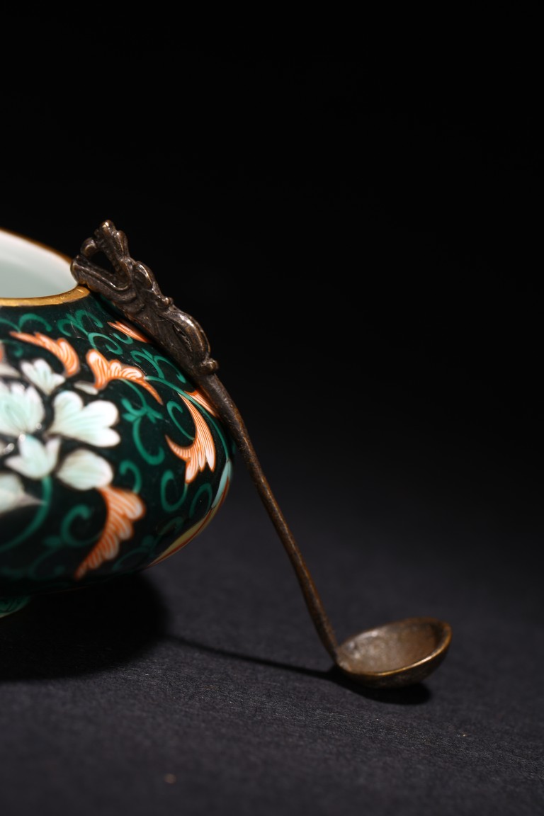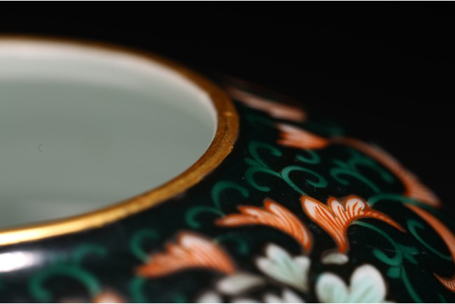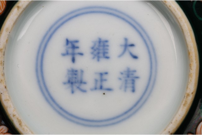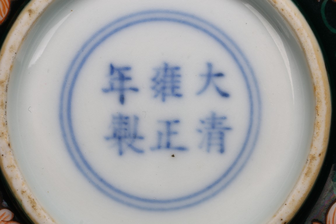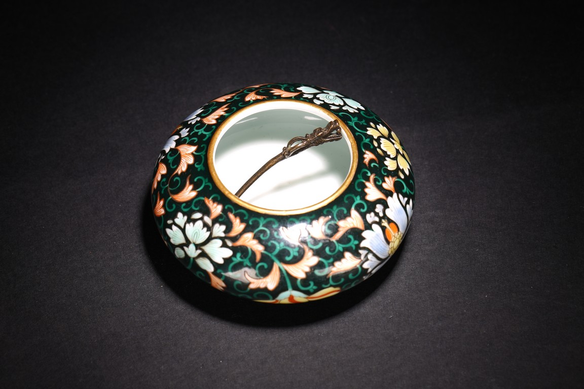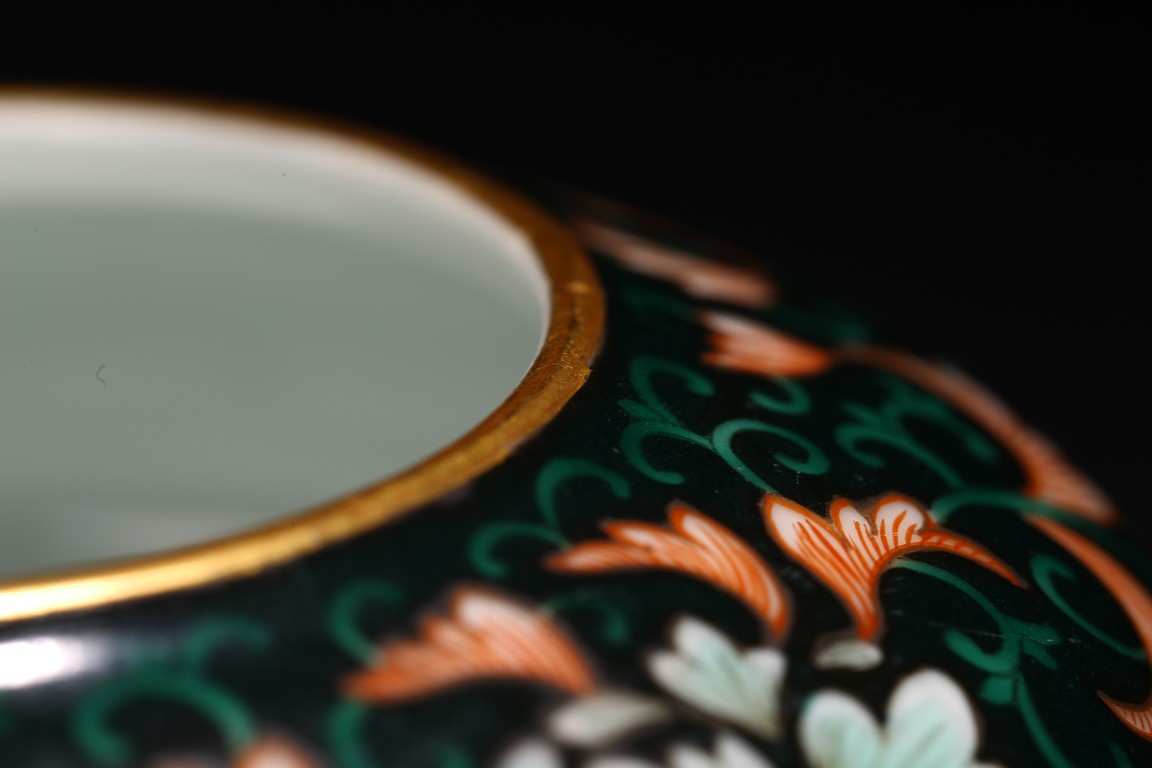 此水盂圓口、溜肩、鼓腹、圈足外撇。外壁以墨色為地,上施紅、綠、黃等色形成素三彩纏枝花卉紋飾,素雅美觀,繪製精細。器型小巧,周正端莊,胎質堅實細膩,釉面潔淨,文房實用佳器。底以青花書“大清雍正年制”六字三行楷書雙圈款。