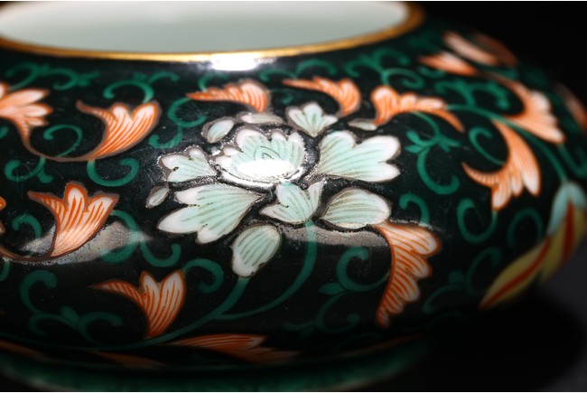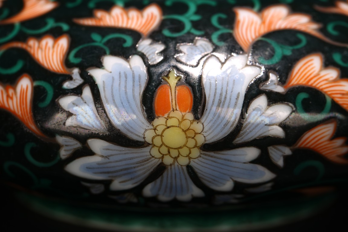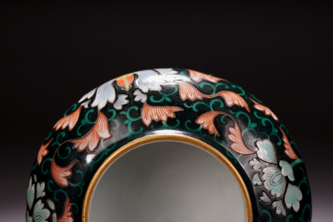 The compressed waterpot decorated with on the black ground exterior with various floral scrolls, the base bearing an apocryphal reign mark.