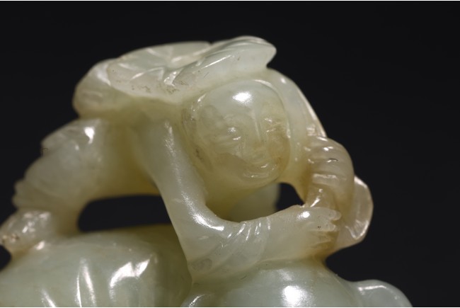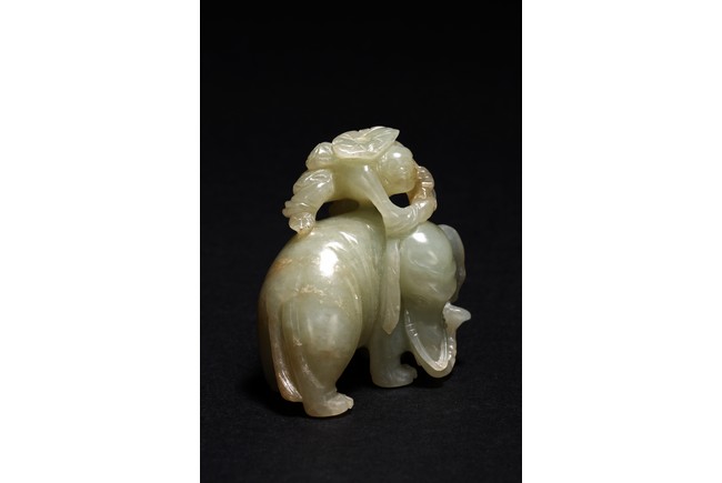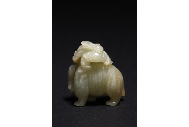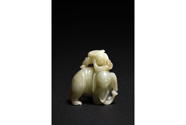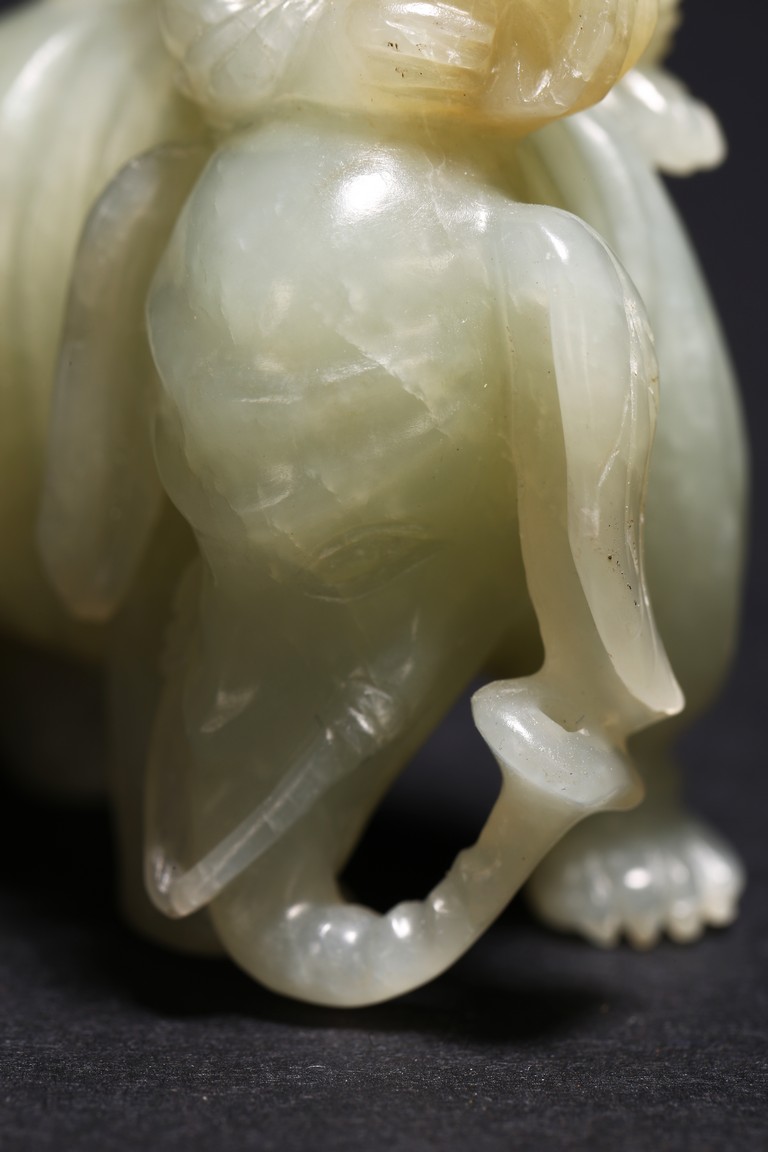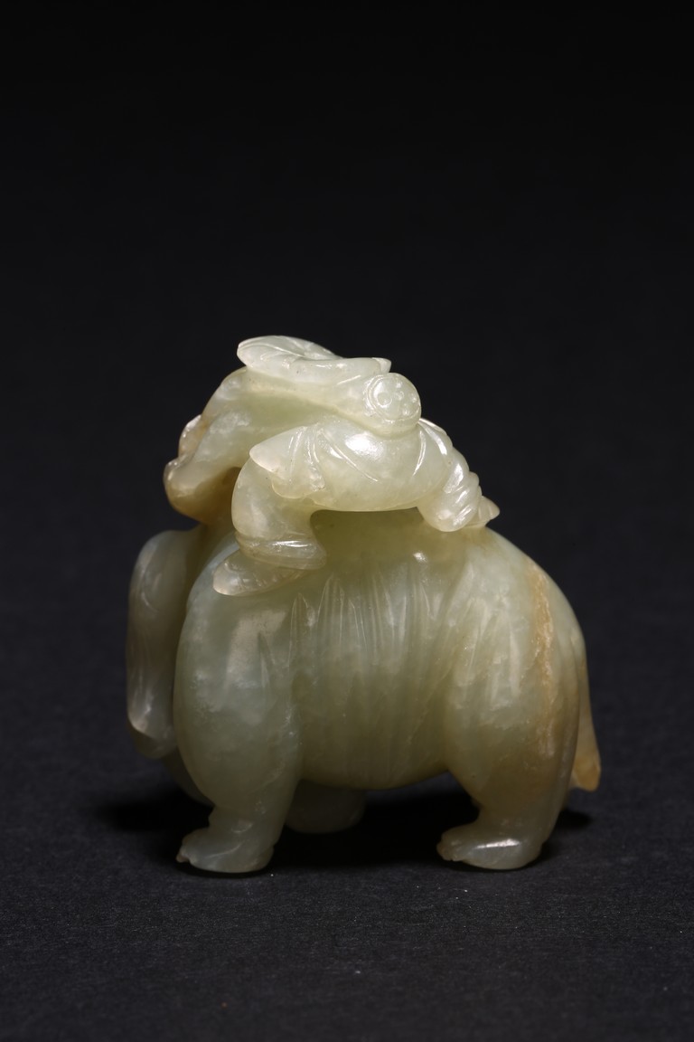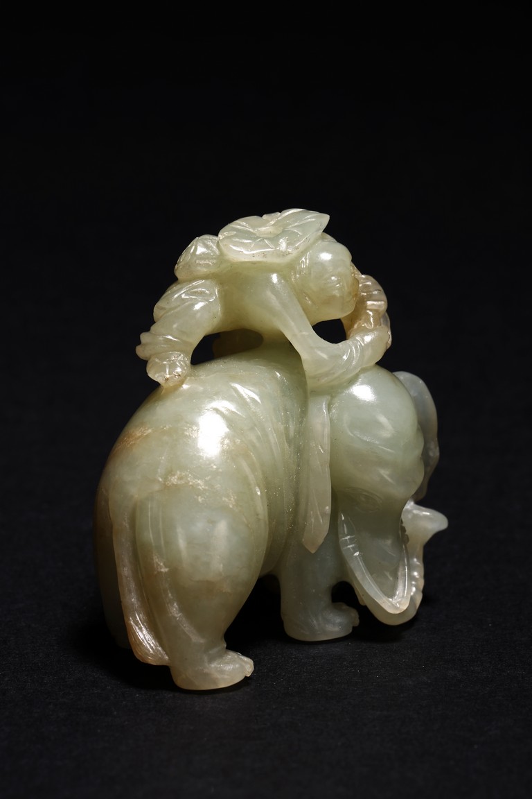 玉質溫潤細膩,局部褐黃色沁色。通體圓雕而成,配合浮雕和線刻等技法,琢童子持蓮攀援於象背之上,大象回首,體態豐盈,健碩溫順,大耳下垂,低首卷鼻,呈現出一派怡然自得的姿態。整器童子面部表情、衣著紋理、大象鬃毛发腳皆刻畫精細,栩栩如生,面面俱到。寓意“太平有象,富貴如意”,也寓意萬象更新。