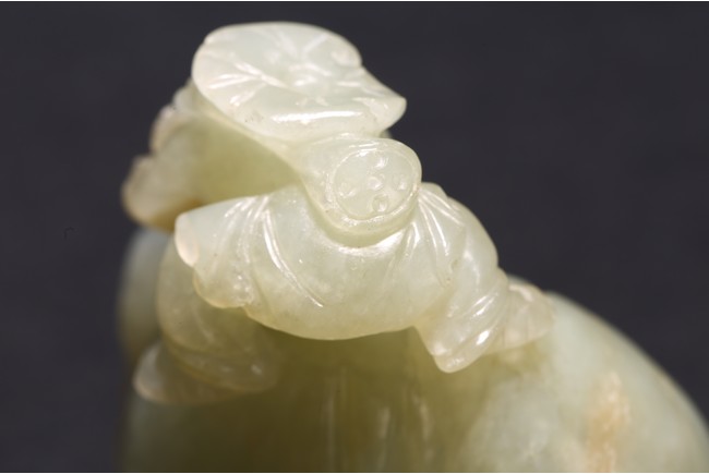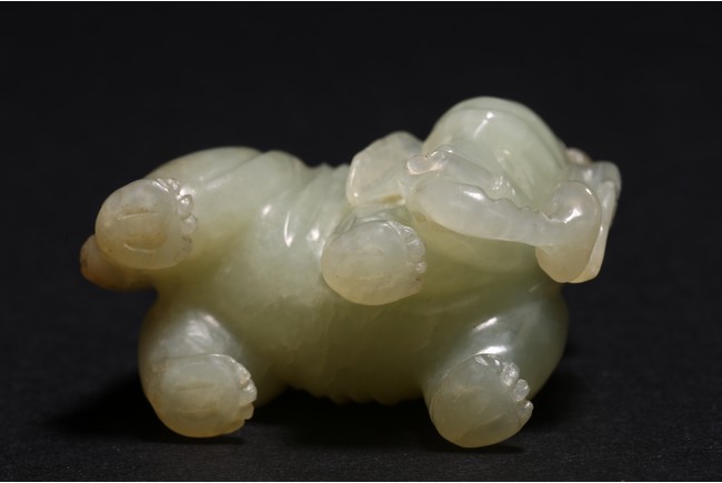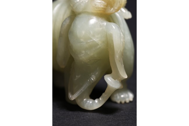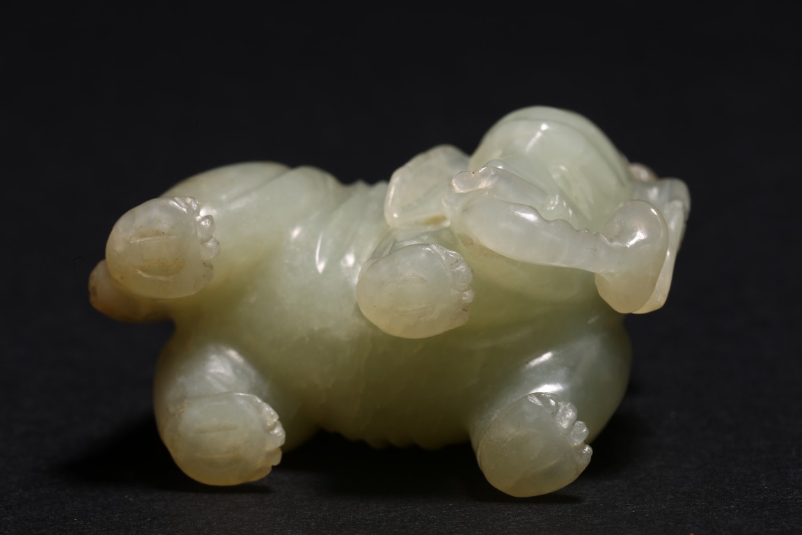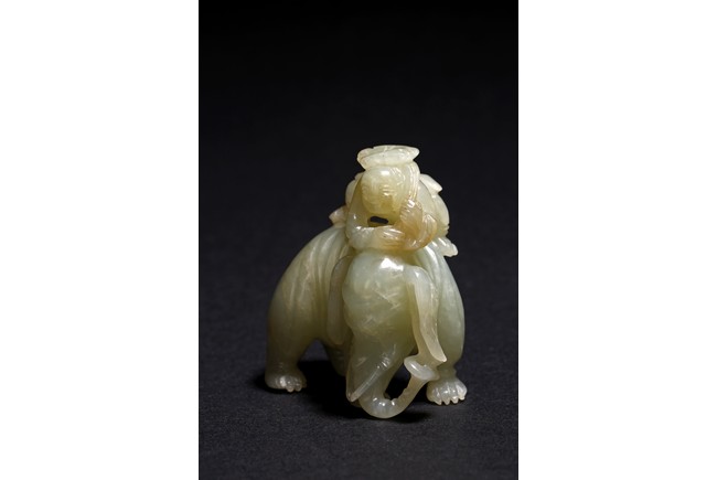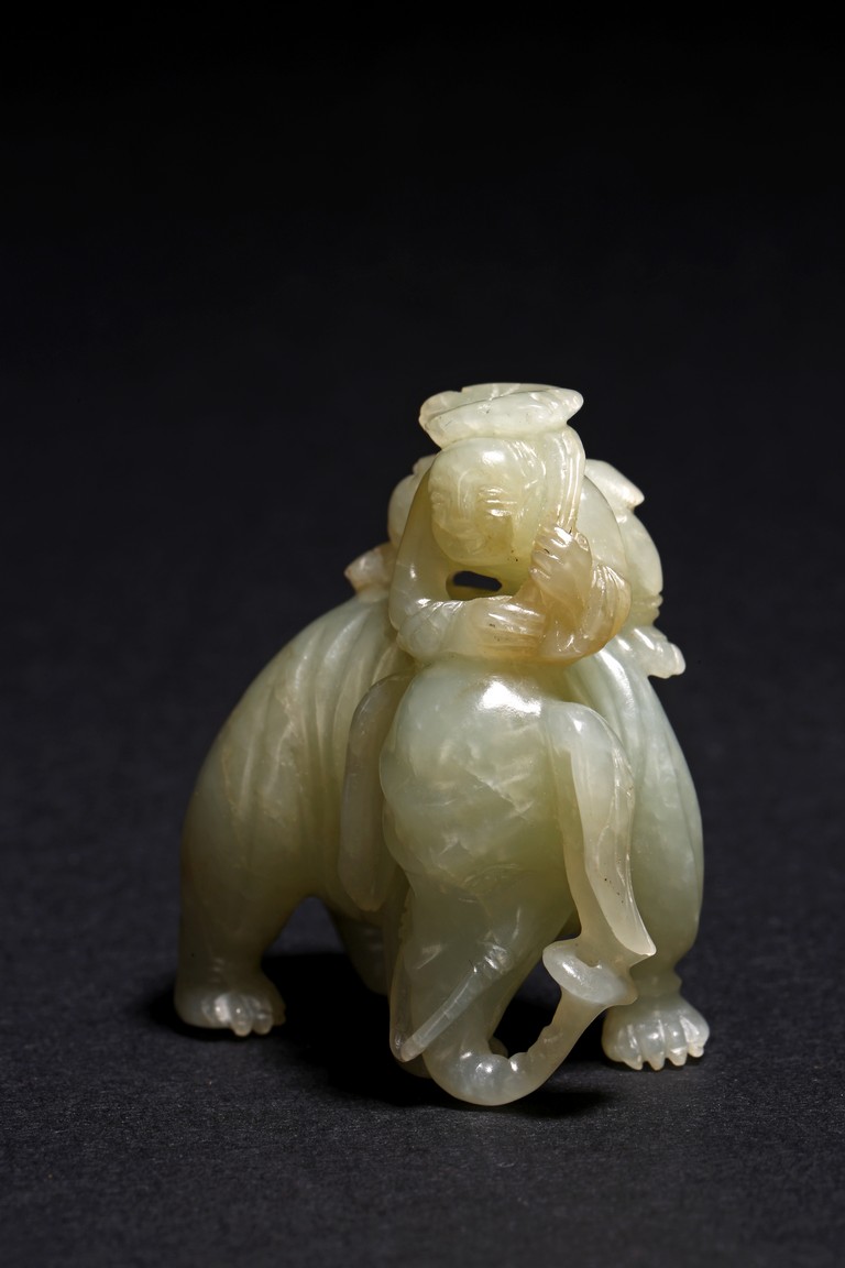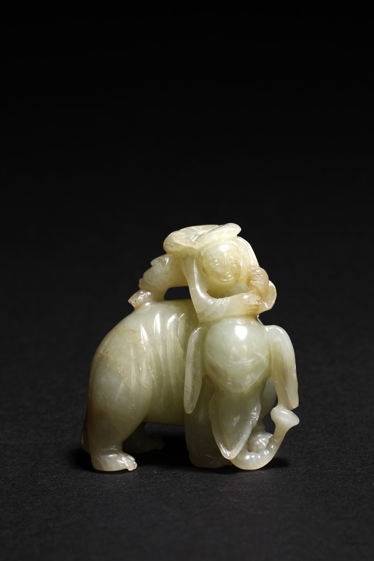 玉質溫潤細膩,局部褐黃色沁色。通體圓雕而成,配合浮雕和線刻等技法,琢童子持蓮攀援於象背之上,大象回首,體態豐盈,健碩溫順,大耳下垂,低首卷鼻,呈現出一派怡然自得的姿態。整器童子面部表情、衣著紋理、大象鬃毛发腳皆刻畫精細,栩栩如生,面面俱到。寓意“太平有象,富貴如意”,也寓意萬象更新。