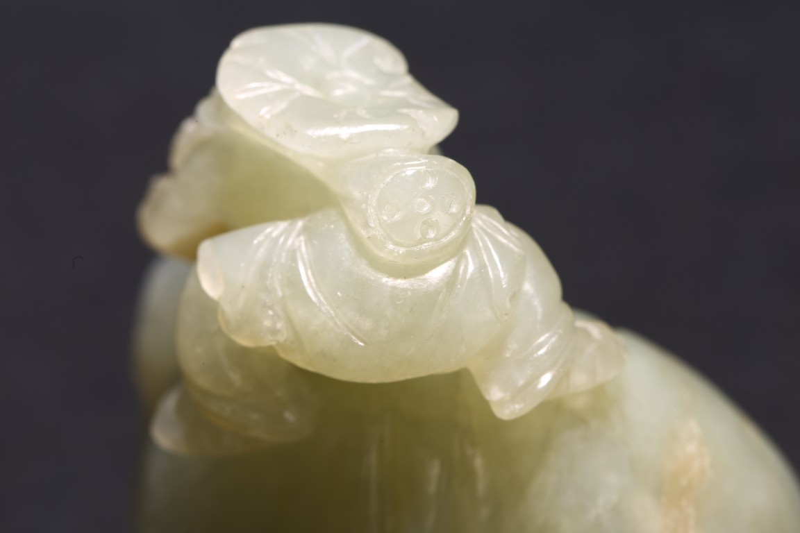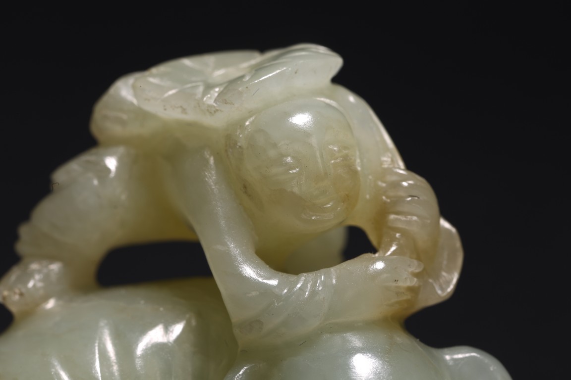 Qing Dynasty period. Carved in the form of boy holding a lotus leaf on top of elephant.