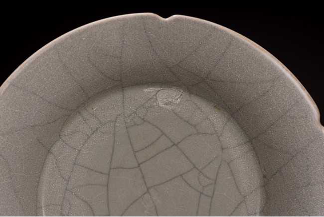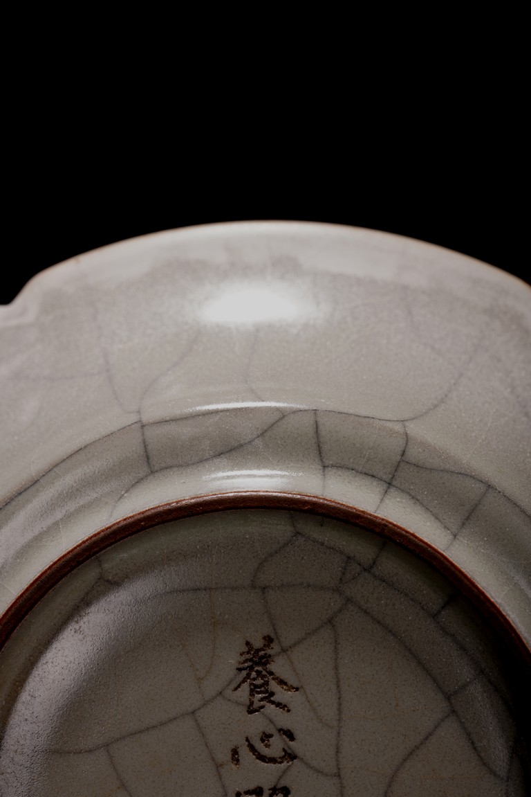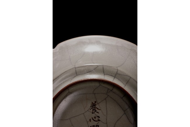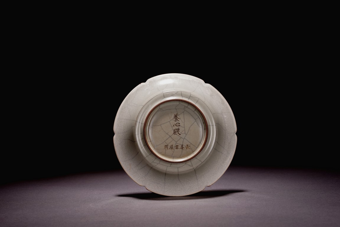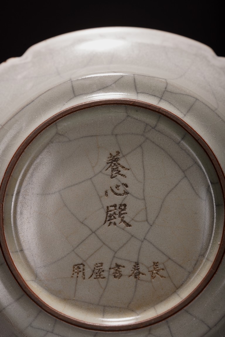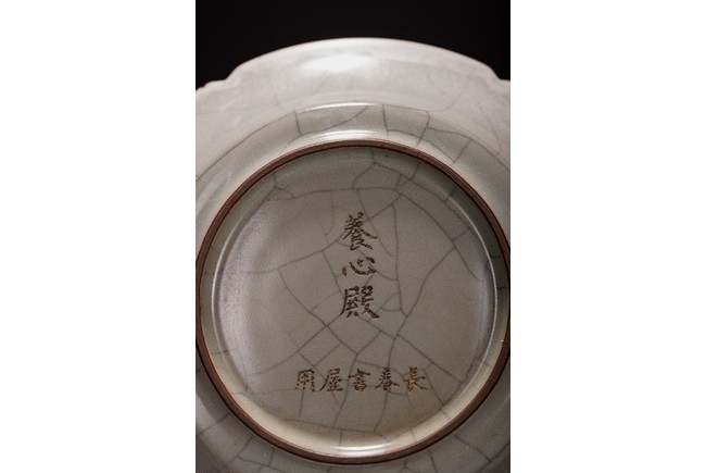 此碟撇口、淺腹、圈足、口沿做梅花狀。整體施青釉,大開片,鐵足,釉色沉穩,釉面潔淨,胎質堅實,形制周正,底後刻“養心殿長春書屋用”款。
