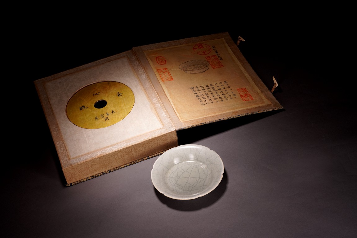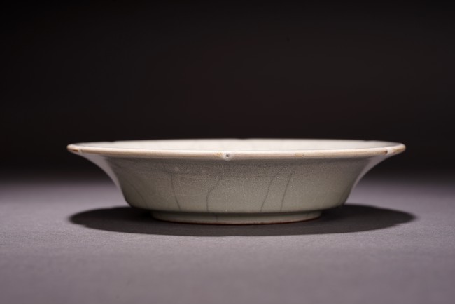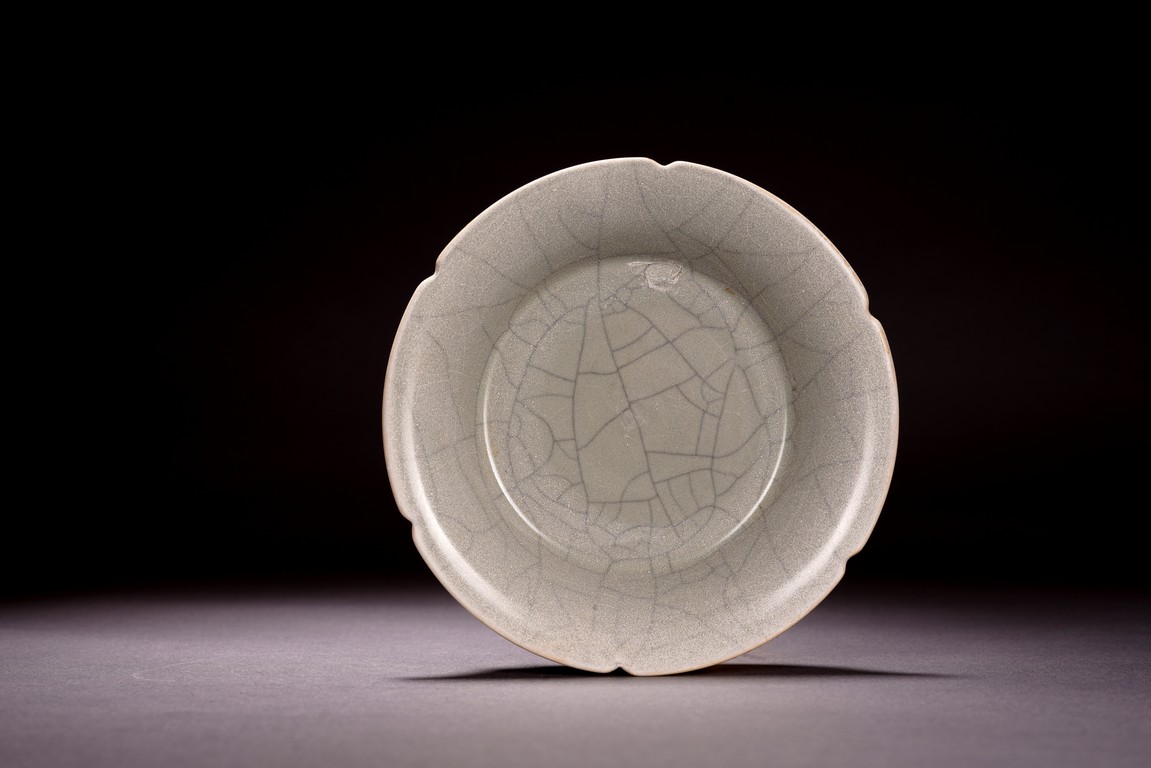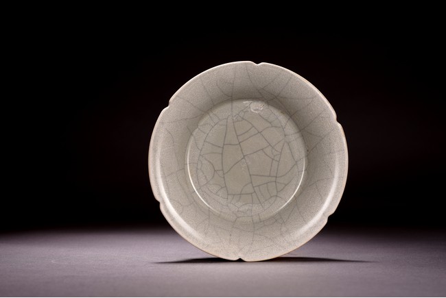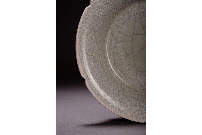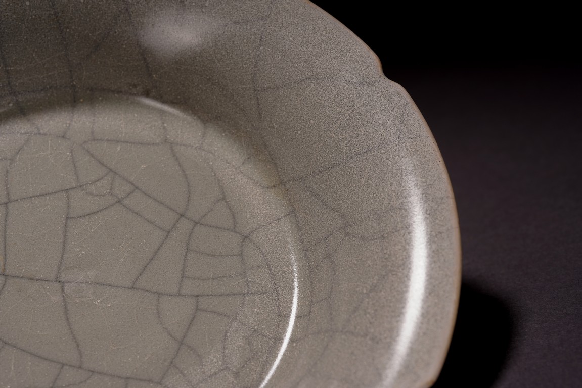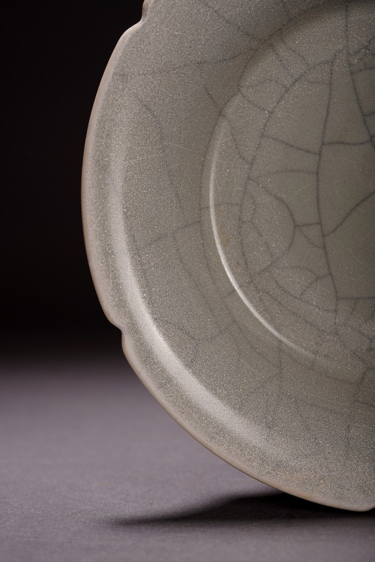 此碟撇口、淺腹、圈足、口沿做梅花狀。整體施青釉,大開片,鐵足,釉色沉穩,釉面潔淨,胎質堅實,形制周正,底後刻“養心殿長春書屋用”款。
