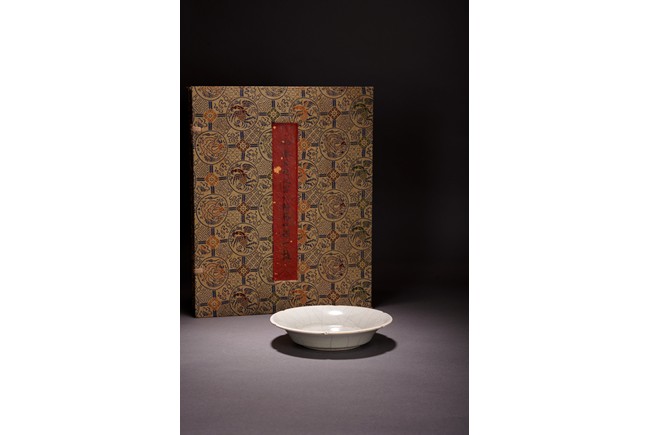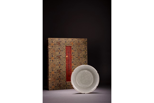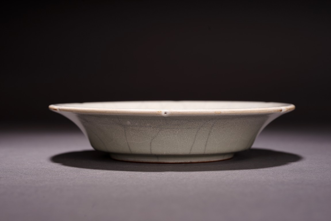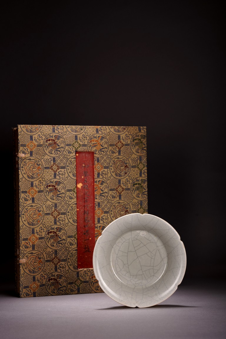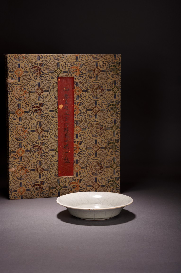 Republic period. The celadon glazed dish inscribed with apocryphal inscription on the base, accompanied with an imperial style box.