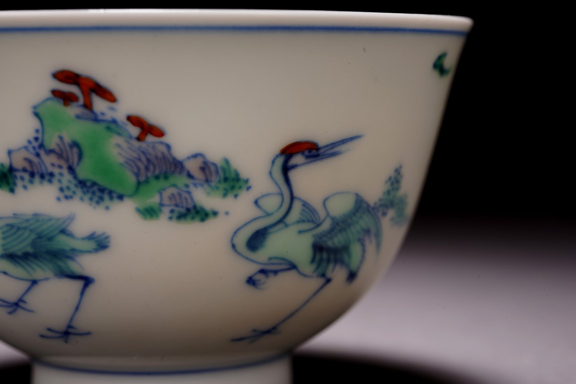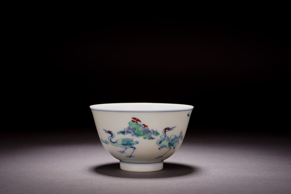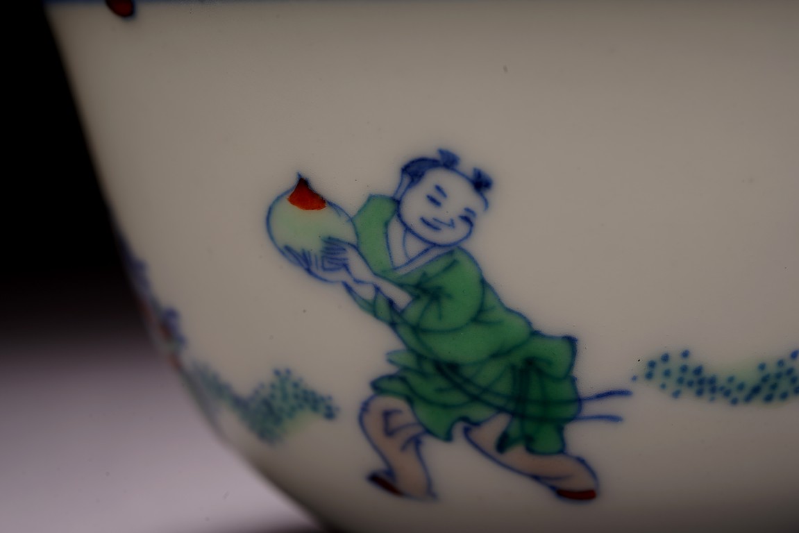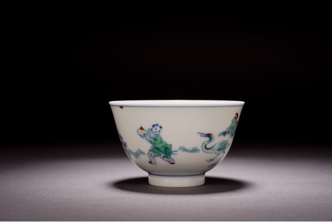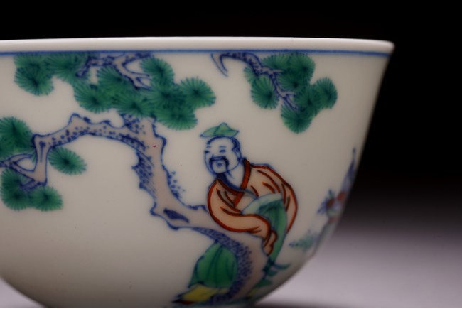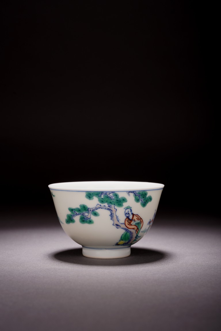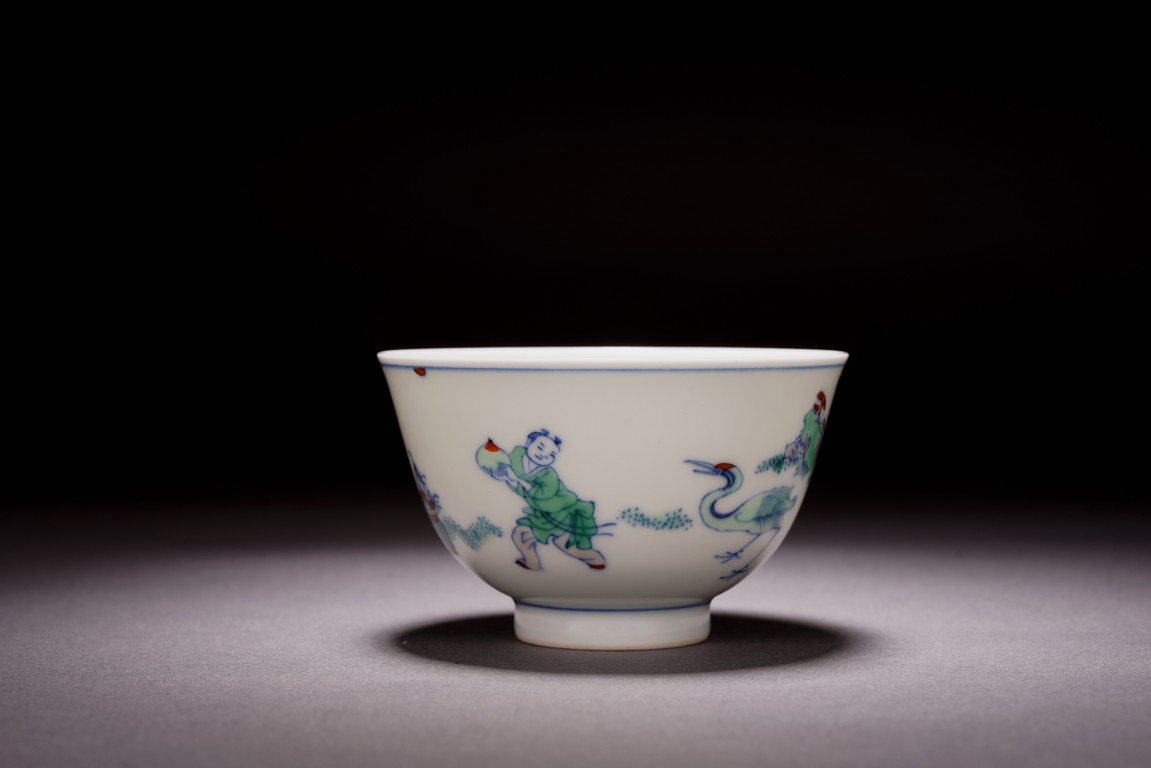 此杯敞口、弧腹、圈足。通體施透明釉,外壁以青花五彩通景繪製長者、童子捧桃、仙鶴等紋飾,繪製精美,寓意吉祥,構圖疏密有致,層次分明。胎質堅實細膩,胎體較薄,釉面潔白勻淨,器型小巧周正,保存完好。底以青花書“大清康熙年制”六字三行楷書雙圈款。