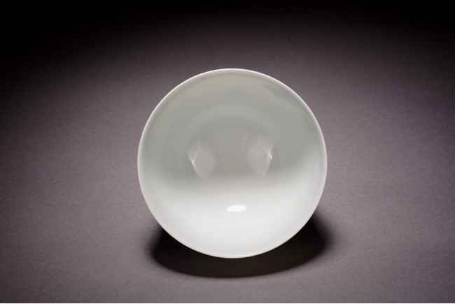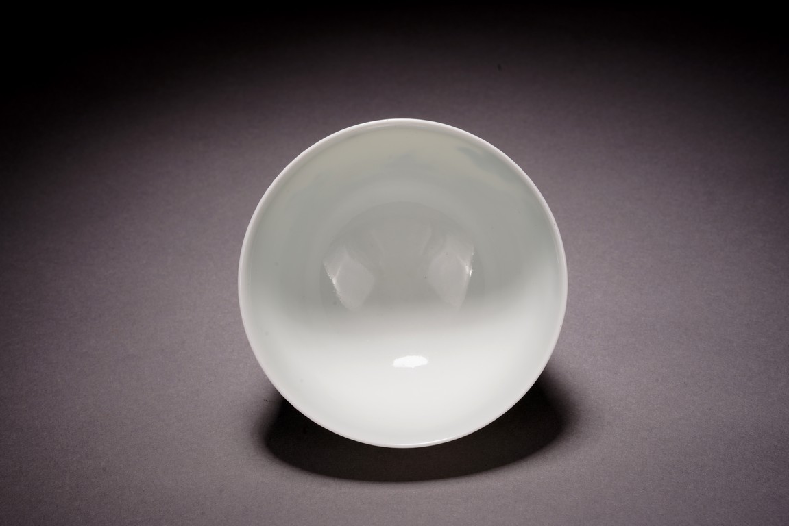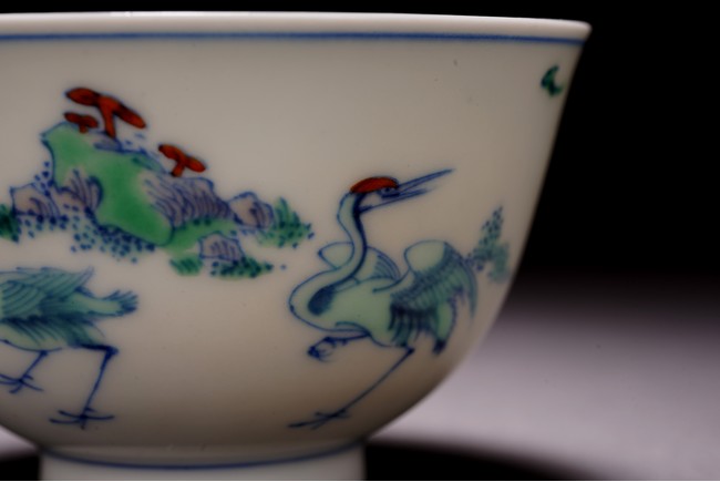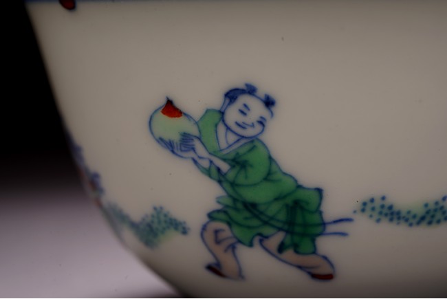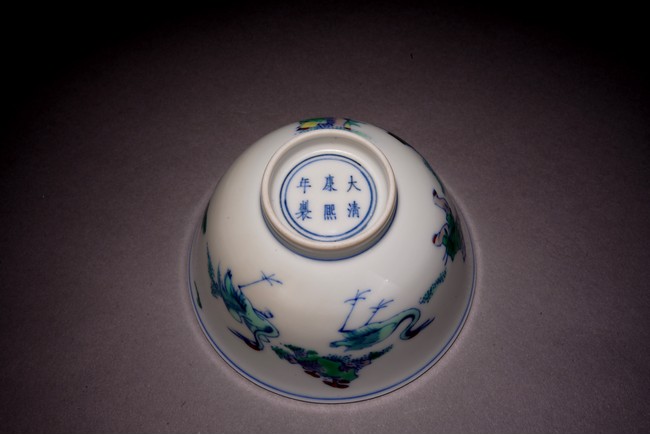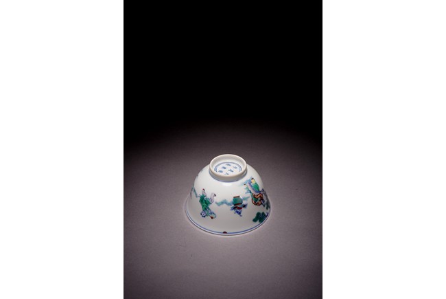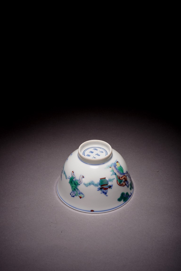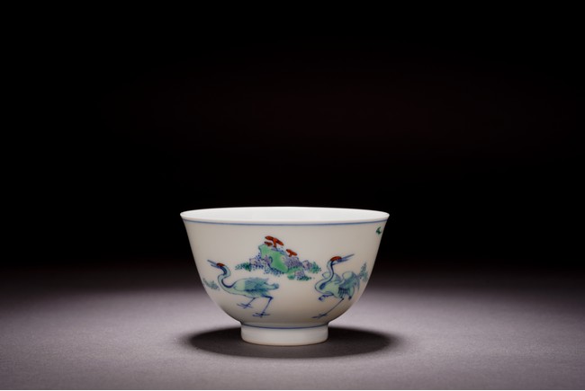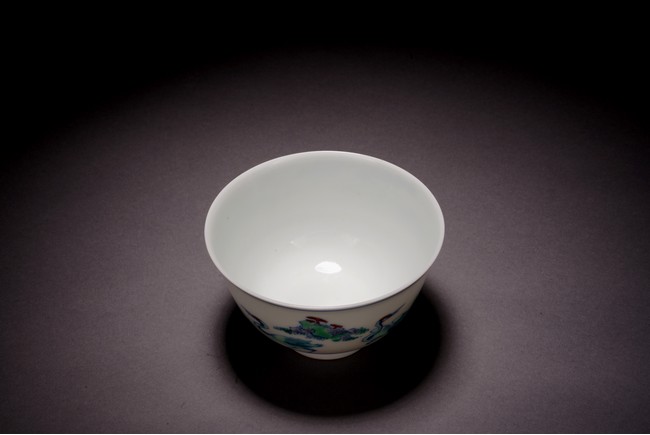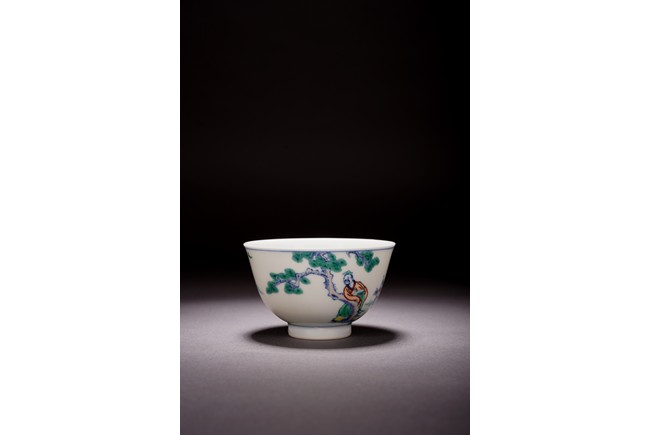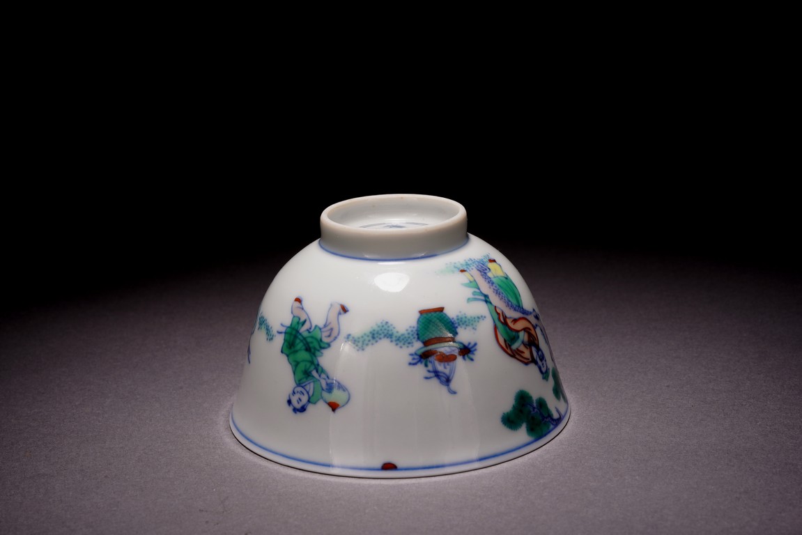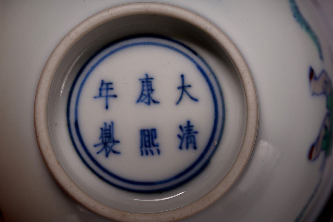 此杯敞口、弧腹、圈足。通體施透明釉,外壁以青花五彩通景繪製長者、童子捧桃、仙鶴等紋飾,繪製精美,寓意吉祥,構圖疏密有致,層次分明。胎質堅實細膩,胎體較薄,釉面潔白勻淨,器型小巧周正,保存完好。底以青花書“大清康熙年制”六字三行楷書雙圈款。