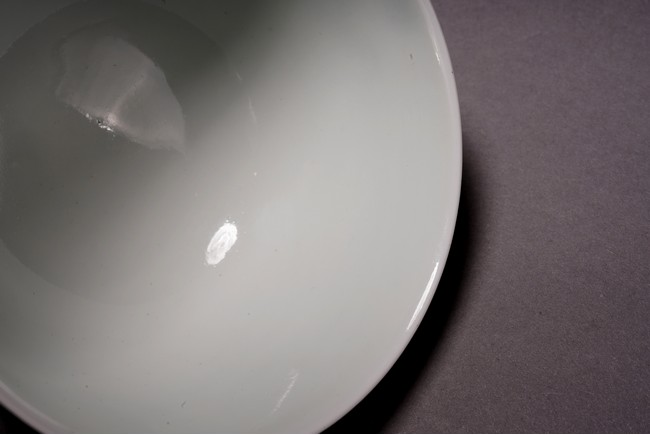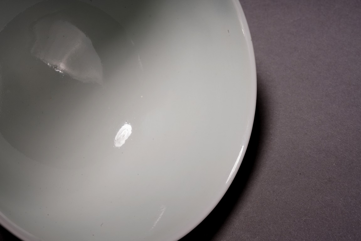 Delicately potted with deep rounded sides resting on a short foot, the exterior depicting an elderly scholar leaning against a pine tree, further adorned with a boy holding a peach next to two cranes, the base bearing a six character reign mark.