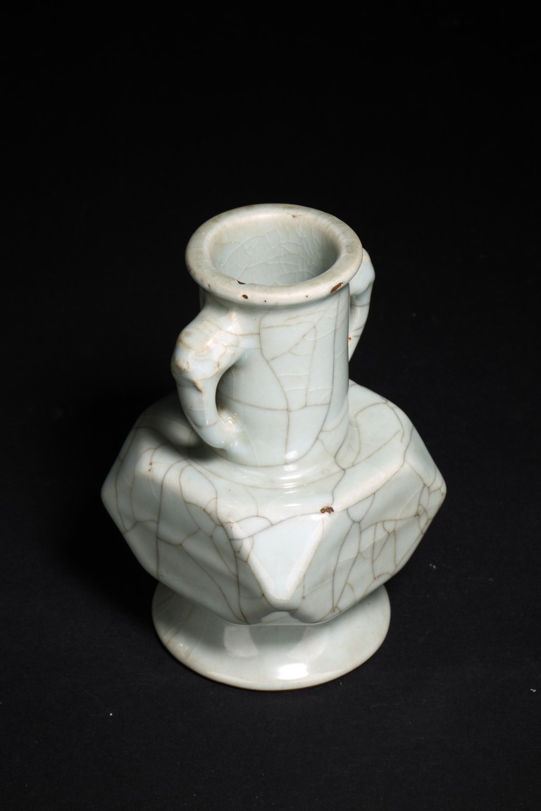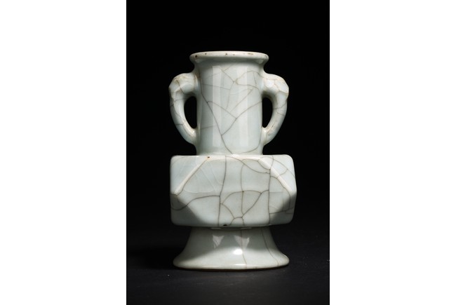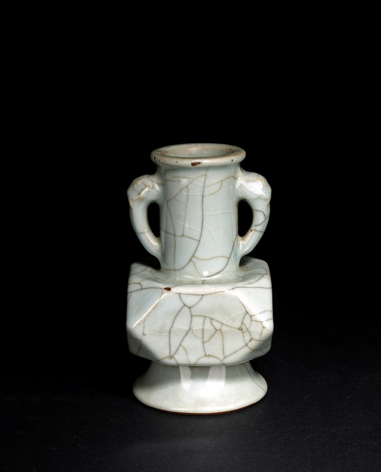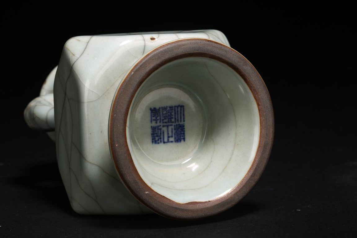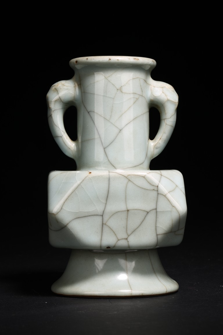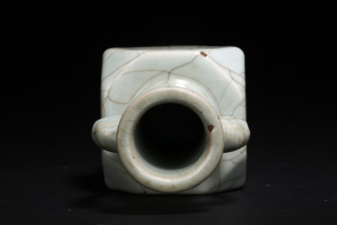 瓶唇口,直頸,頸兩側對稱雙耳,圓肩,方腹折角呈八棱錘狀,深圈足外撇,內台階式底。尊內外均施以仿哥釉,瑩潤光亮,仿哥釉色幽雋淡恬,厚若堆脂,溫潤似玉,散見開片,造型古樸,胎體厚重,典雅端莊。類似此造型的獸耳瓶在雍正一朝還有青花、黃地青花等品種,形制均仿自明宣德時期作品。此器自宣德窯始創燒,其後晚明清初至雍正時多有仿制,然雍正朝所仿之器最為出類拔萃。“大清雍正年制”款識。 来源:洛杉磯私人藏家提供 Provenance: Property from a private collection, Los Angeles