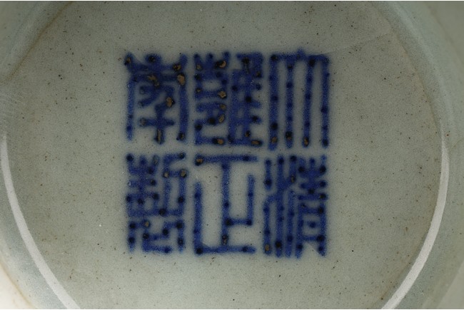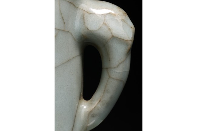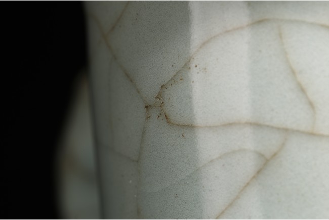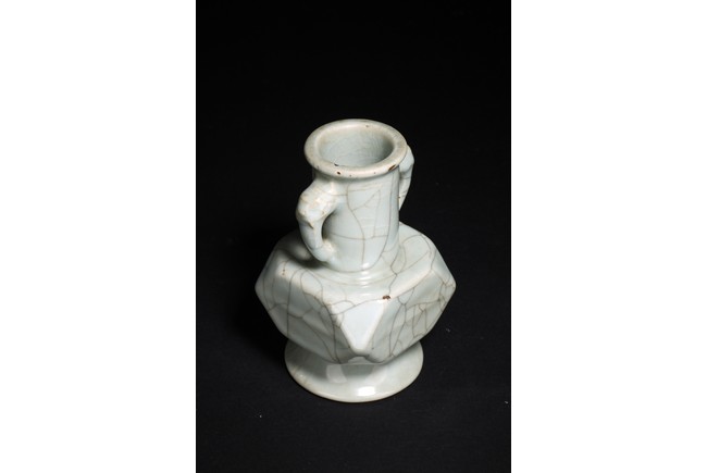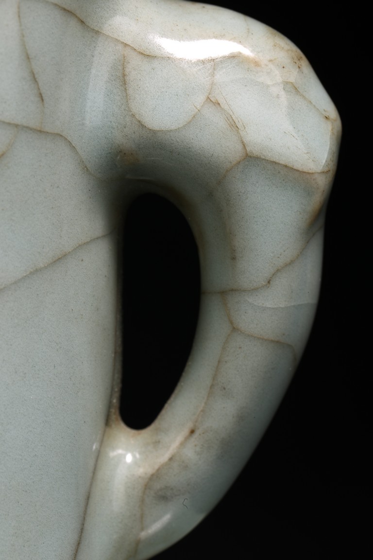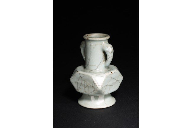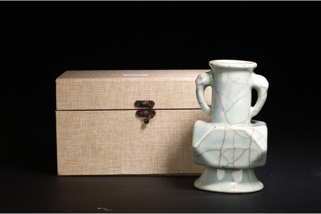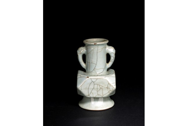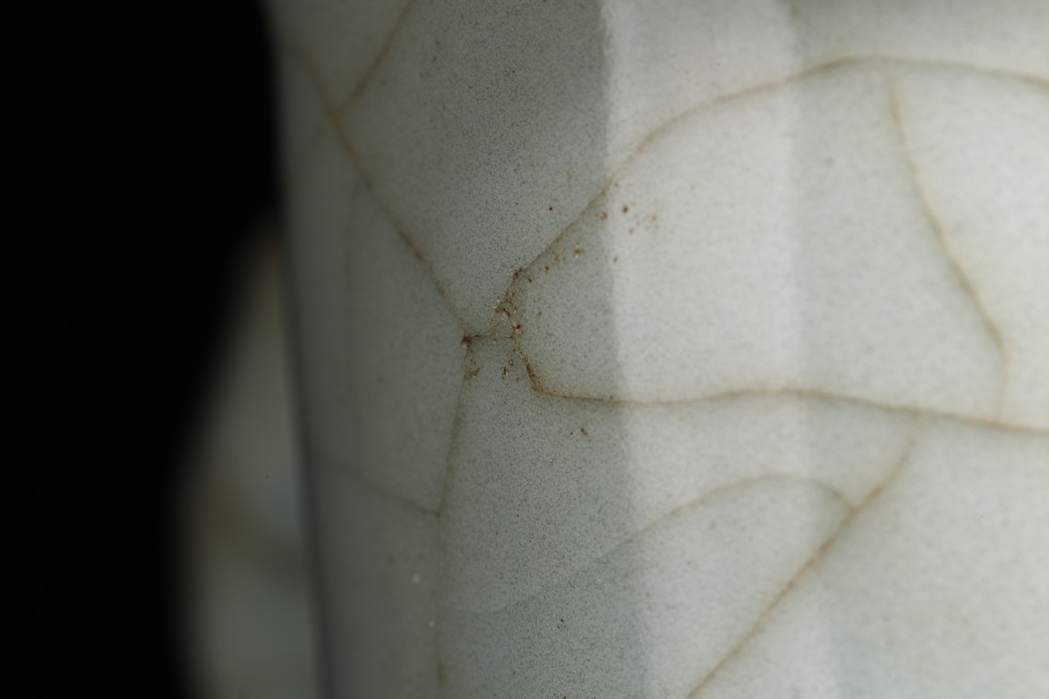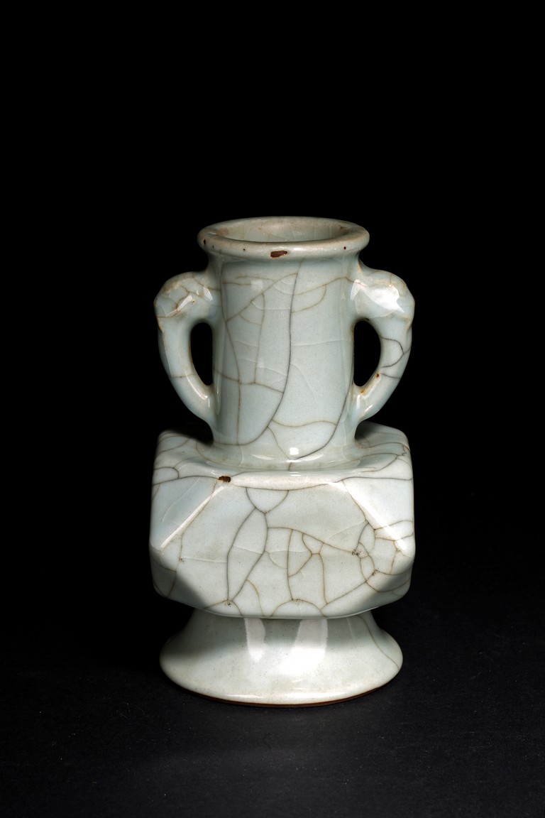 瓶唇口,直頸,頸兩側對稱雙耳,圓肩,方腹折角呈八棱錘狀,深圈足外撇,內台階式底。尊內外均施以仿哥釉,瑩潤光亮,仿哥釉色幽雋淡恬,厚若堆脂,溫潤似玉,散見開片,造型古樸,胎體厚重,典雅端莊。類似此造型的獸耳瓶在雍正一朝還有青花、黃地青花等品種,形制均仿自明宣德時期作品。此器自宣德窯始創燒,其後晚明清初至雍正時多有仿制,然雍正朝所仿之器最為出類拔萃。“大清雍正年制”款識。 来源:洛杉磯私人藏家提供 Provenance: Property from a private collection, Los Angeles